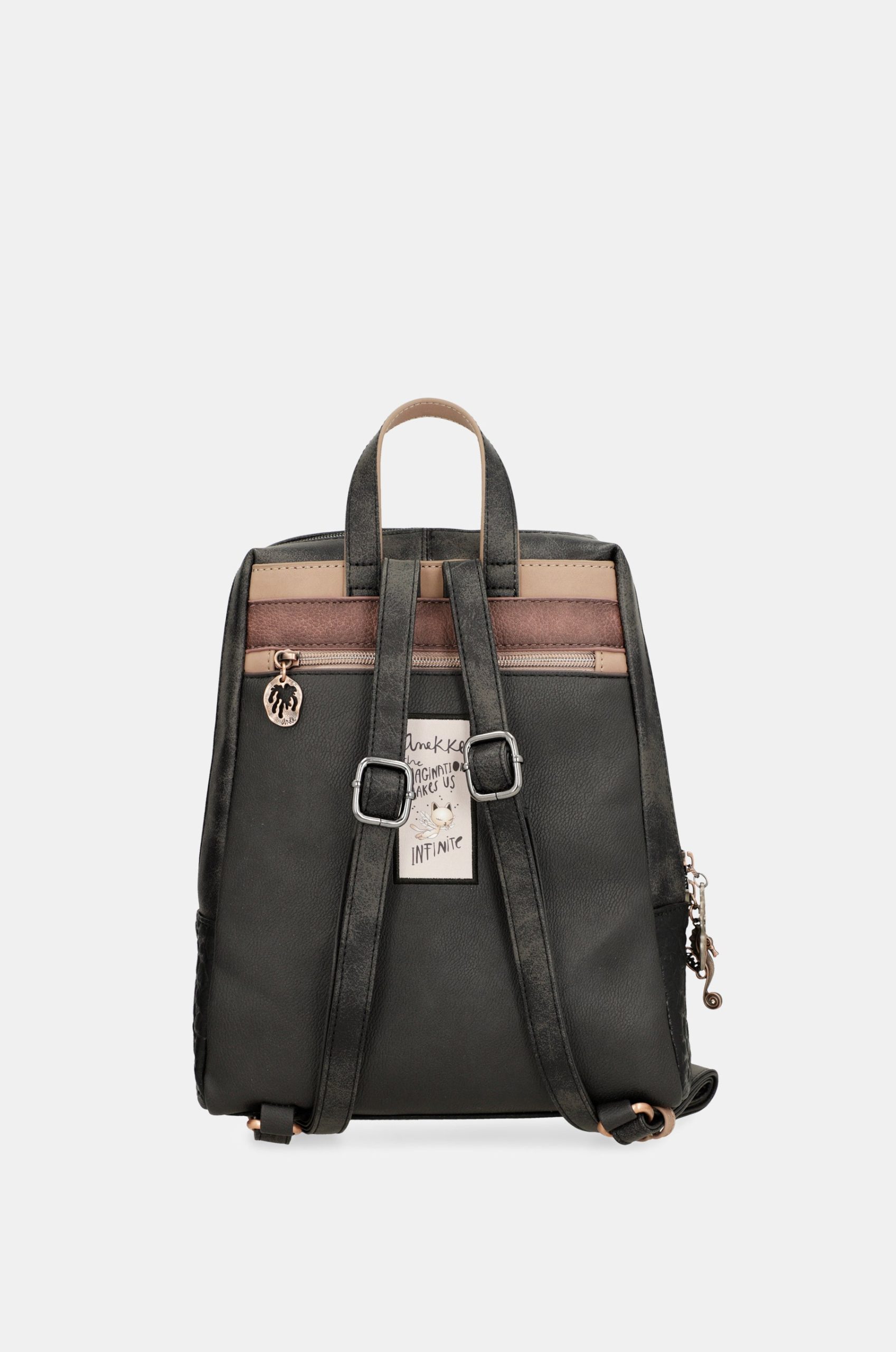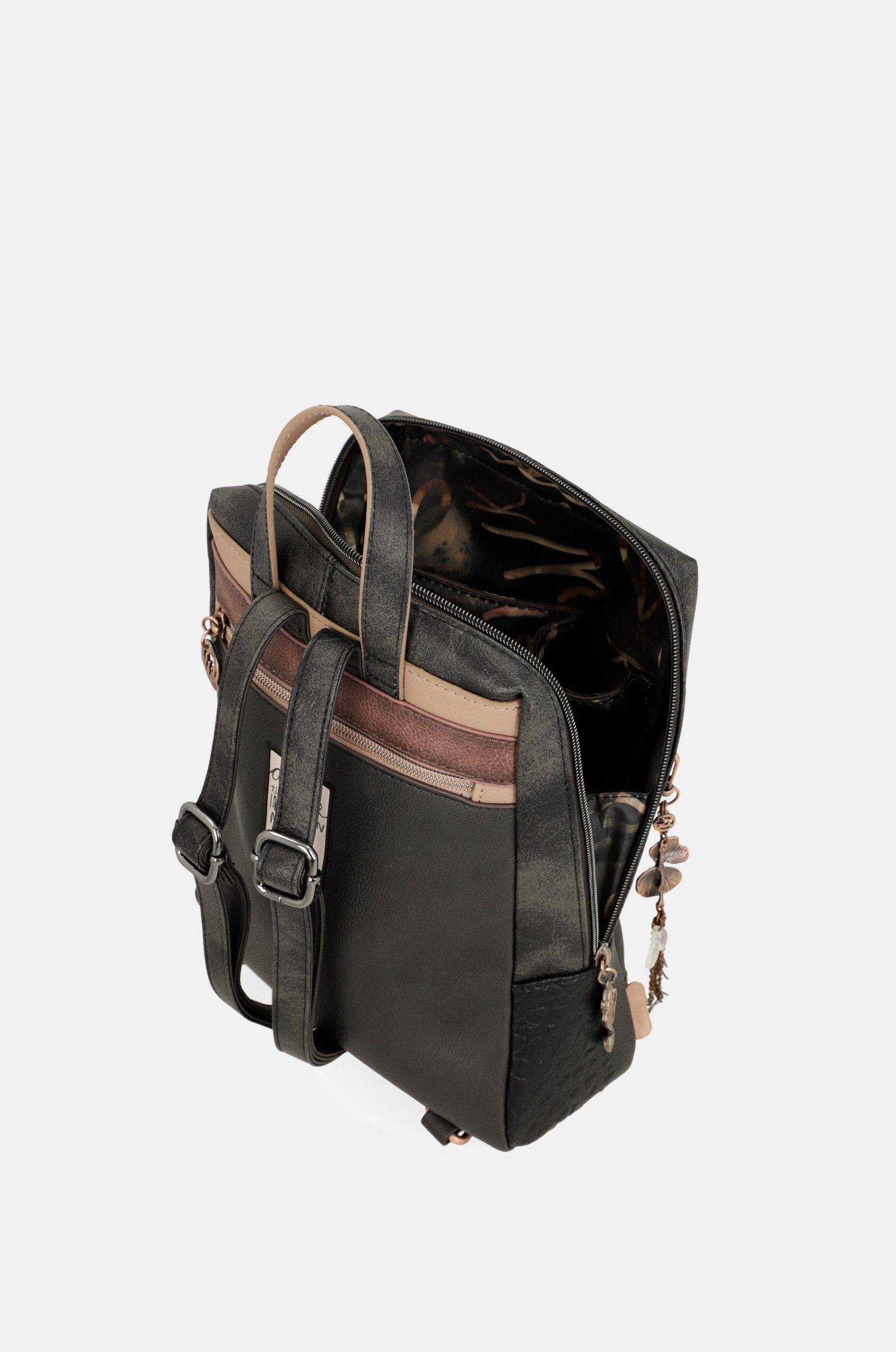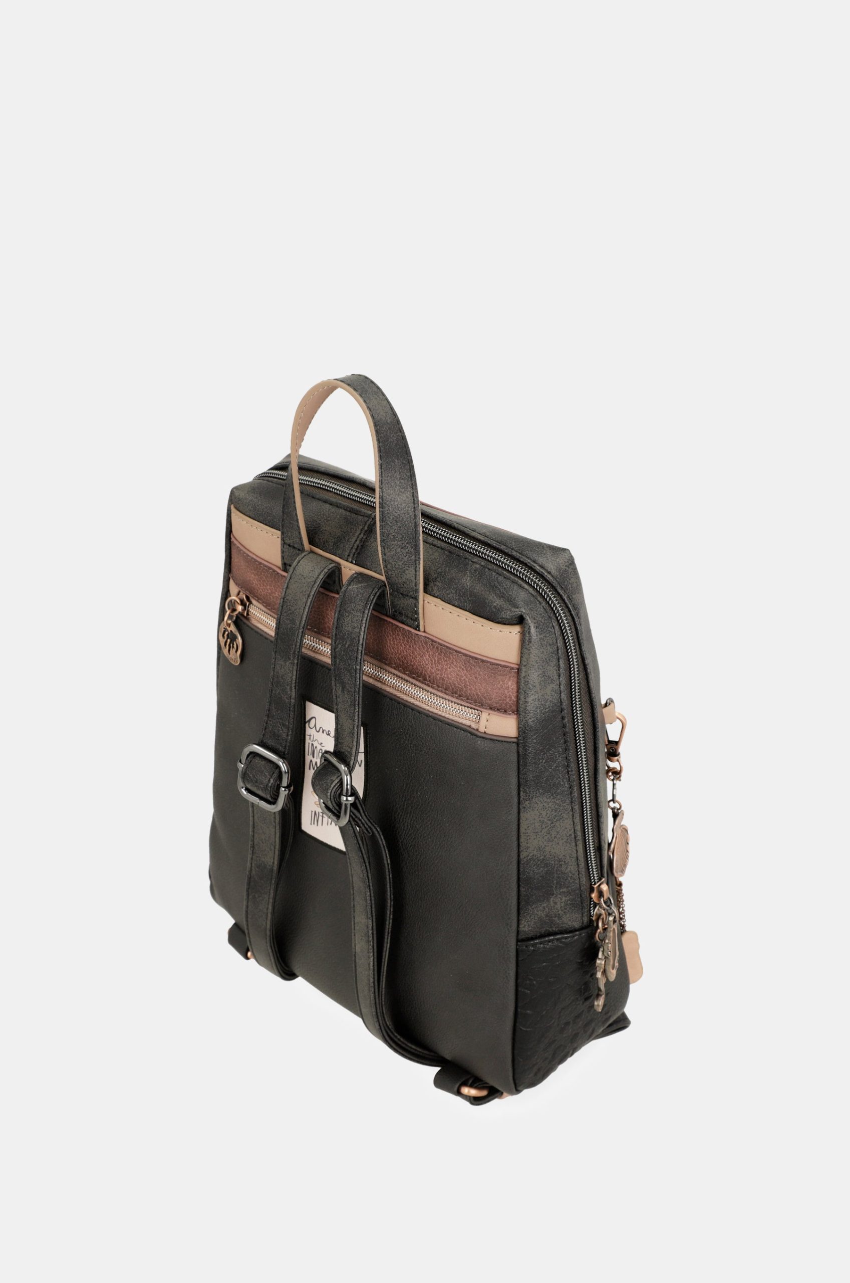 This backpack is medium-large in size and has pockets on the front and back. The backpack has two backpack straps adjustable to different lengths, plus a grab handle. The interior is lined and has pockets.