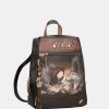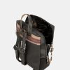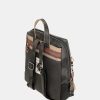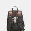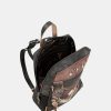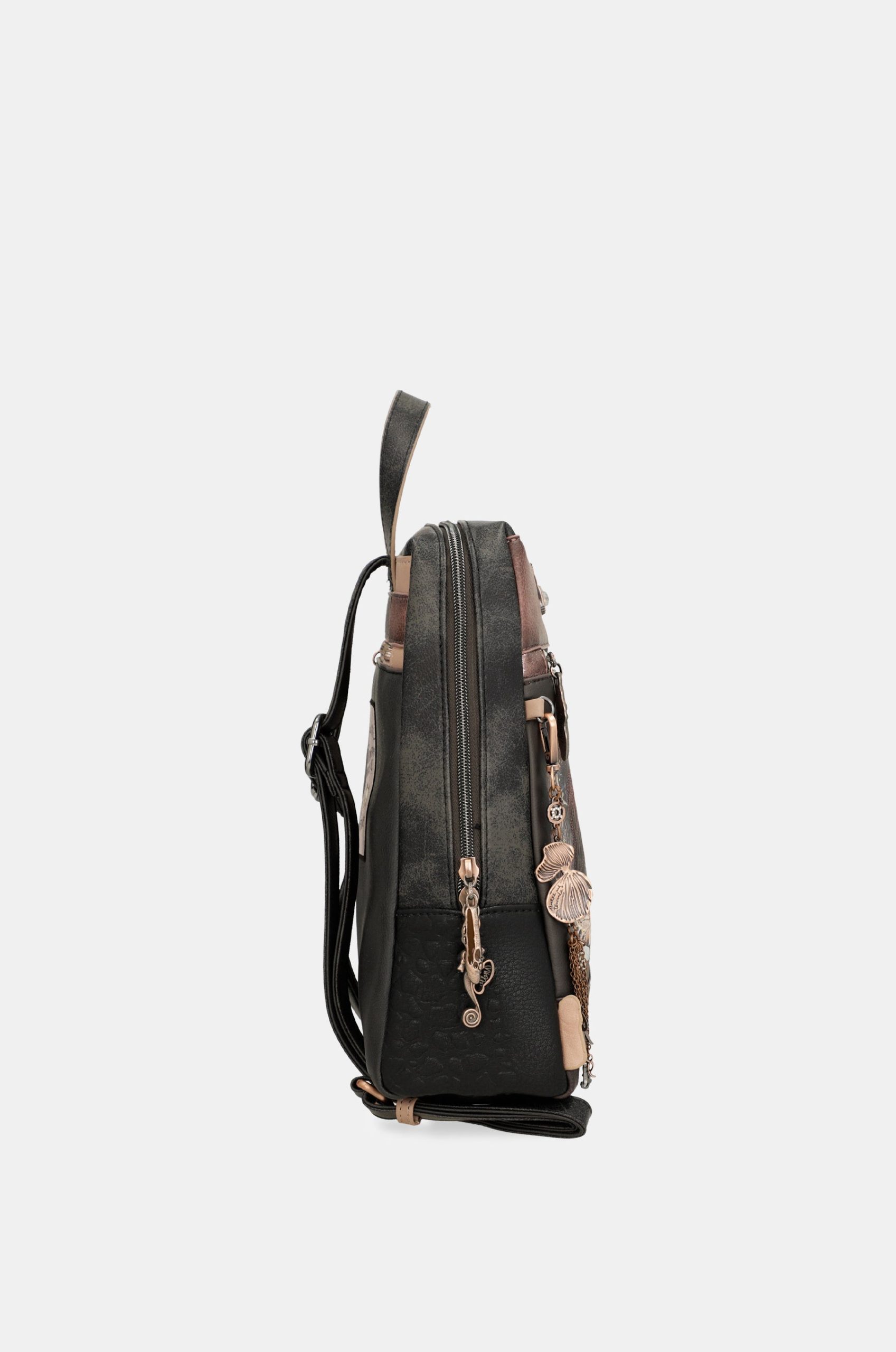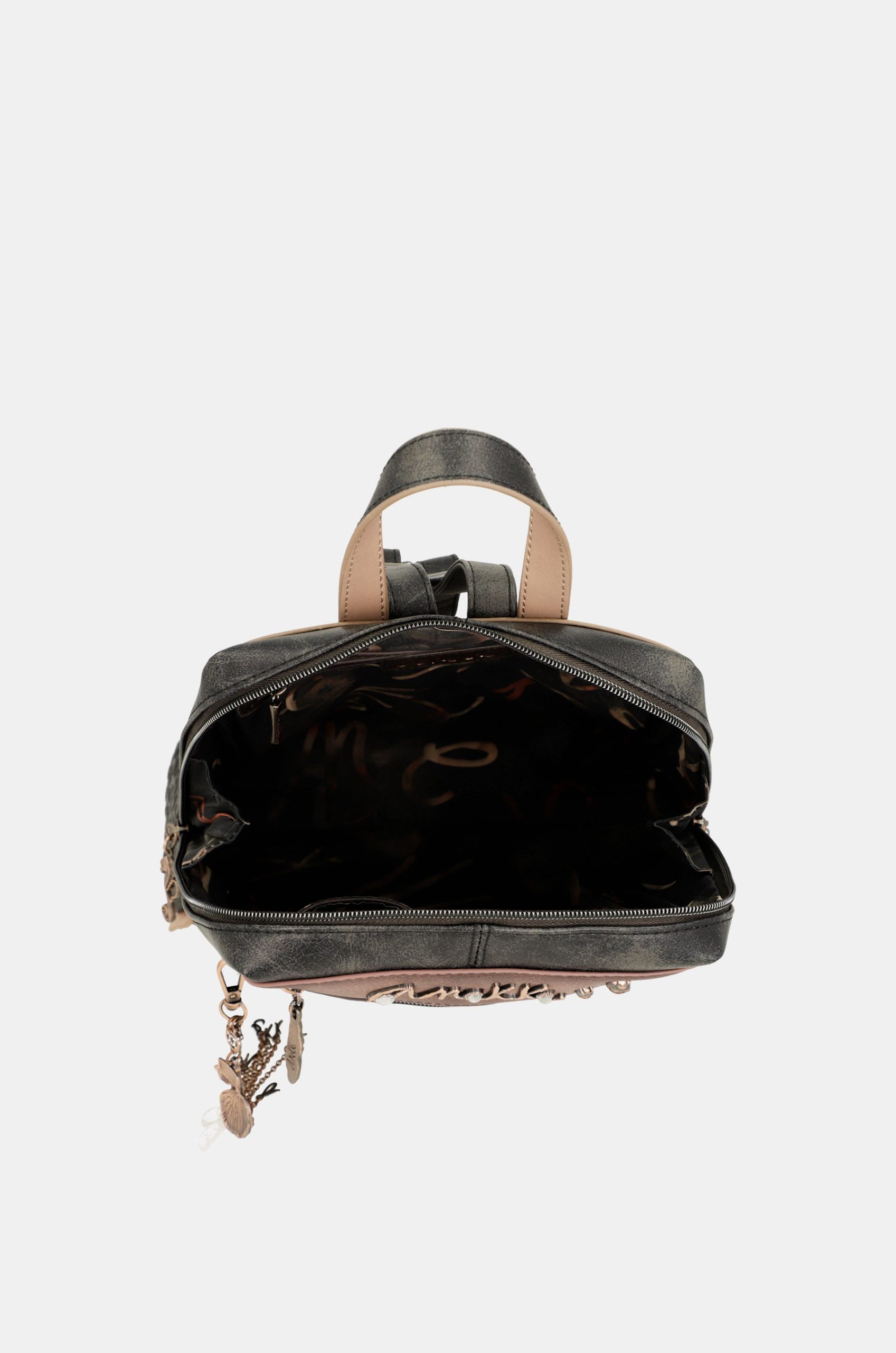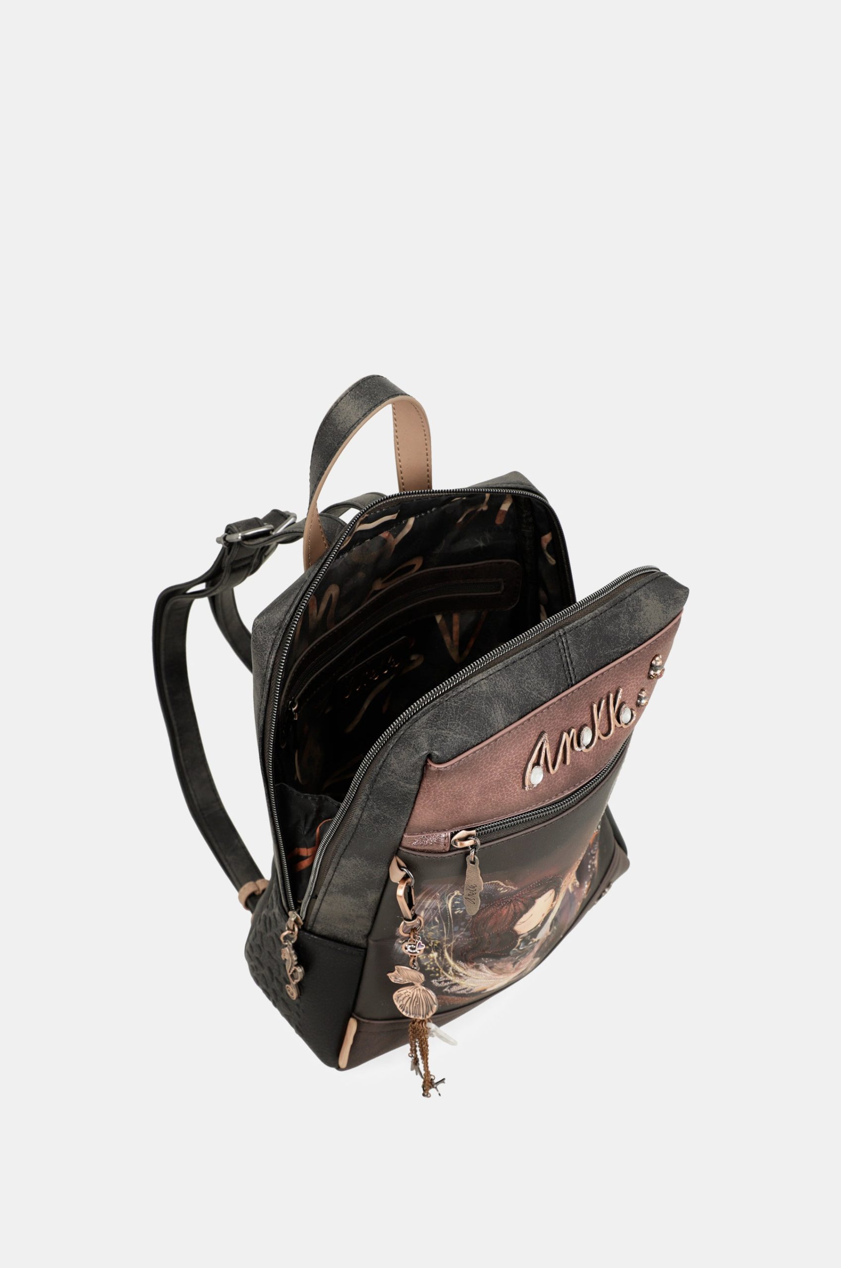 This backpack is medium-large in size and has pockets on the front and back. The backpack has two backpack straps adjustable to different lengths, plus a grab handle. The interior is lined and has pockets.