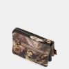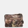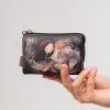 This small coin purse has a zip closure and three separate compartments inside its lined interior. It also has a back pocket.