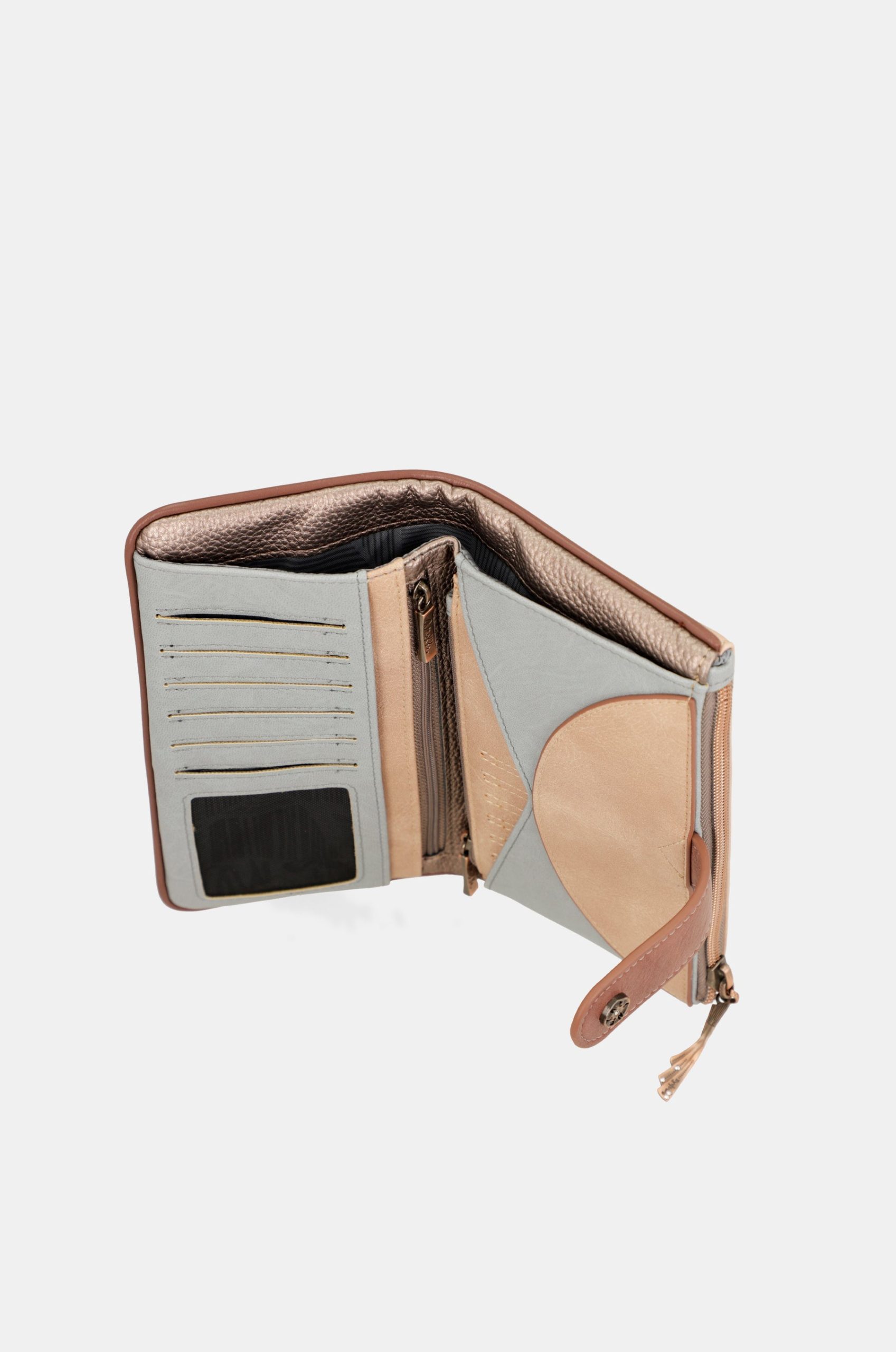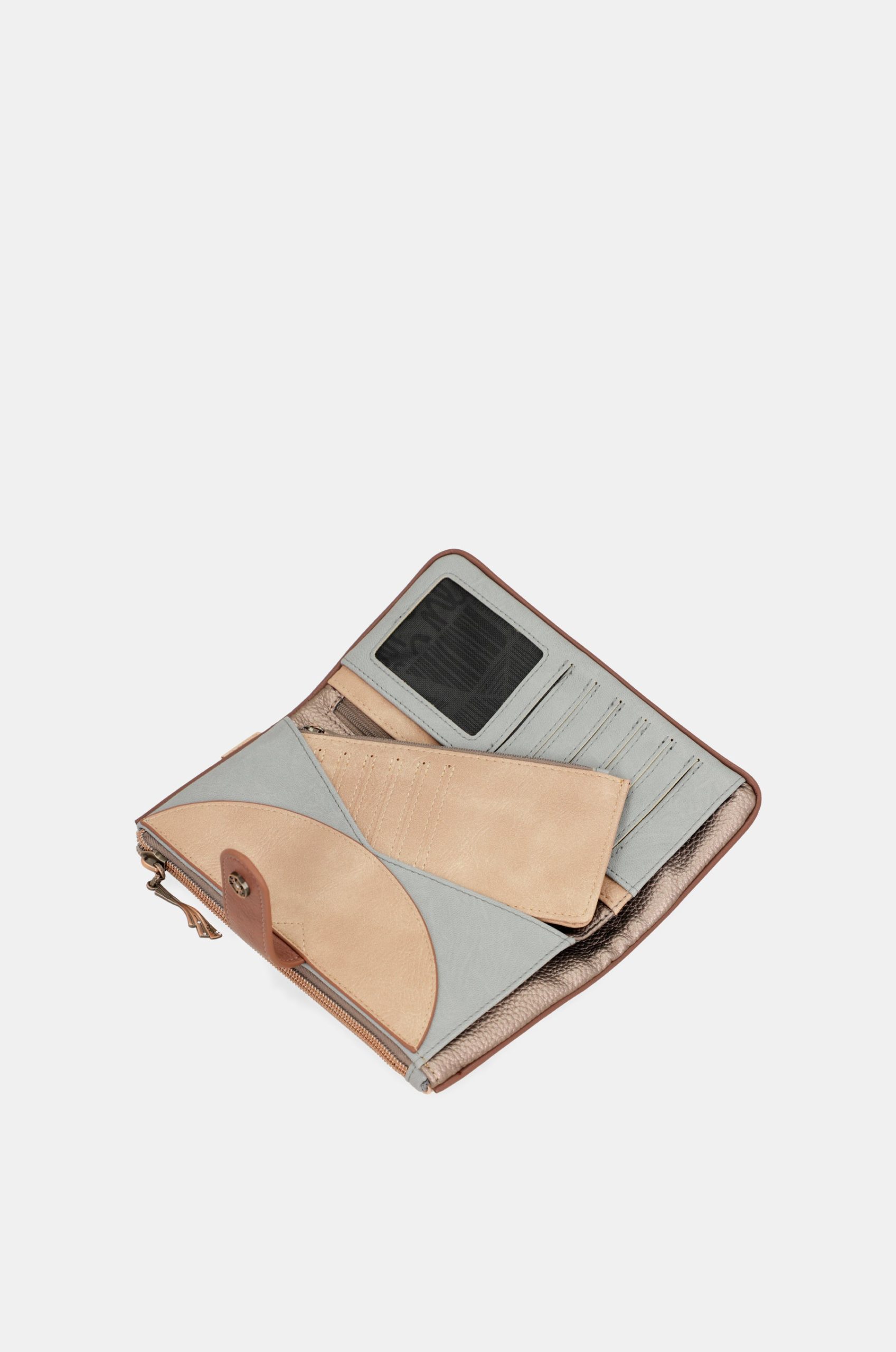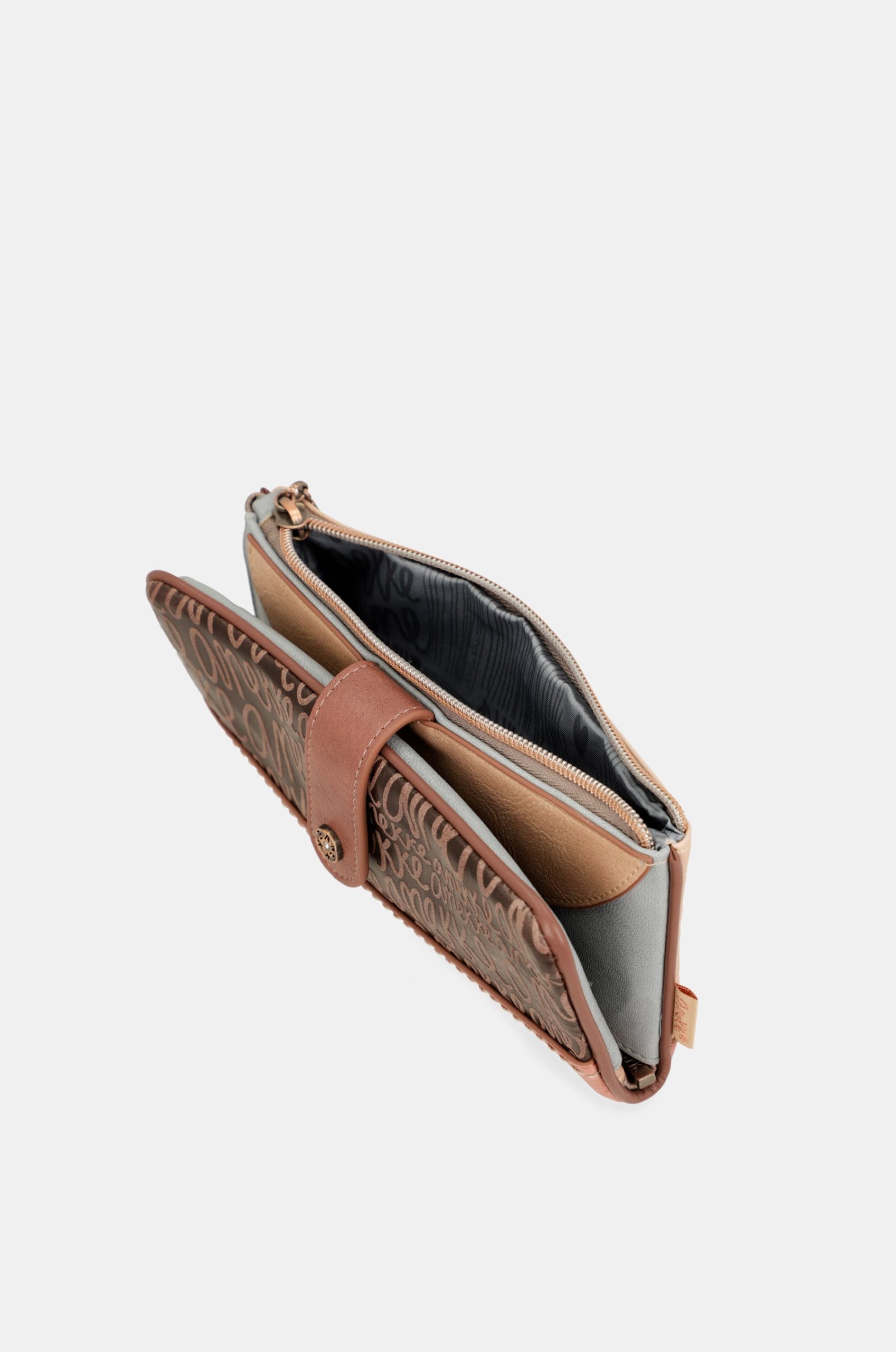 This large-sized wallet is made of flexible material. It has two main compartments: the back, where you will find a large billfold and space for banknotes and/or cards. It has a zip at the top, and inside you can keep coins. The entire interior is lined. It also has a removable cardholder inside.
