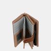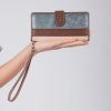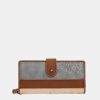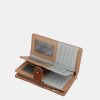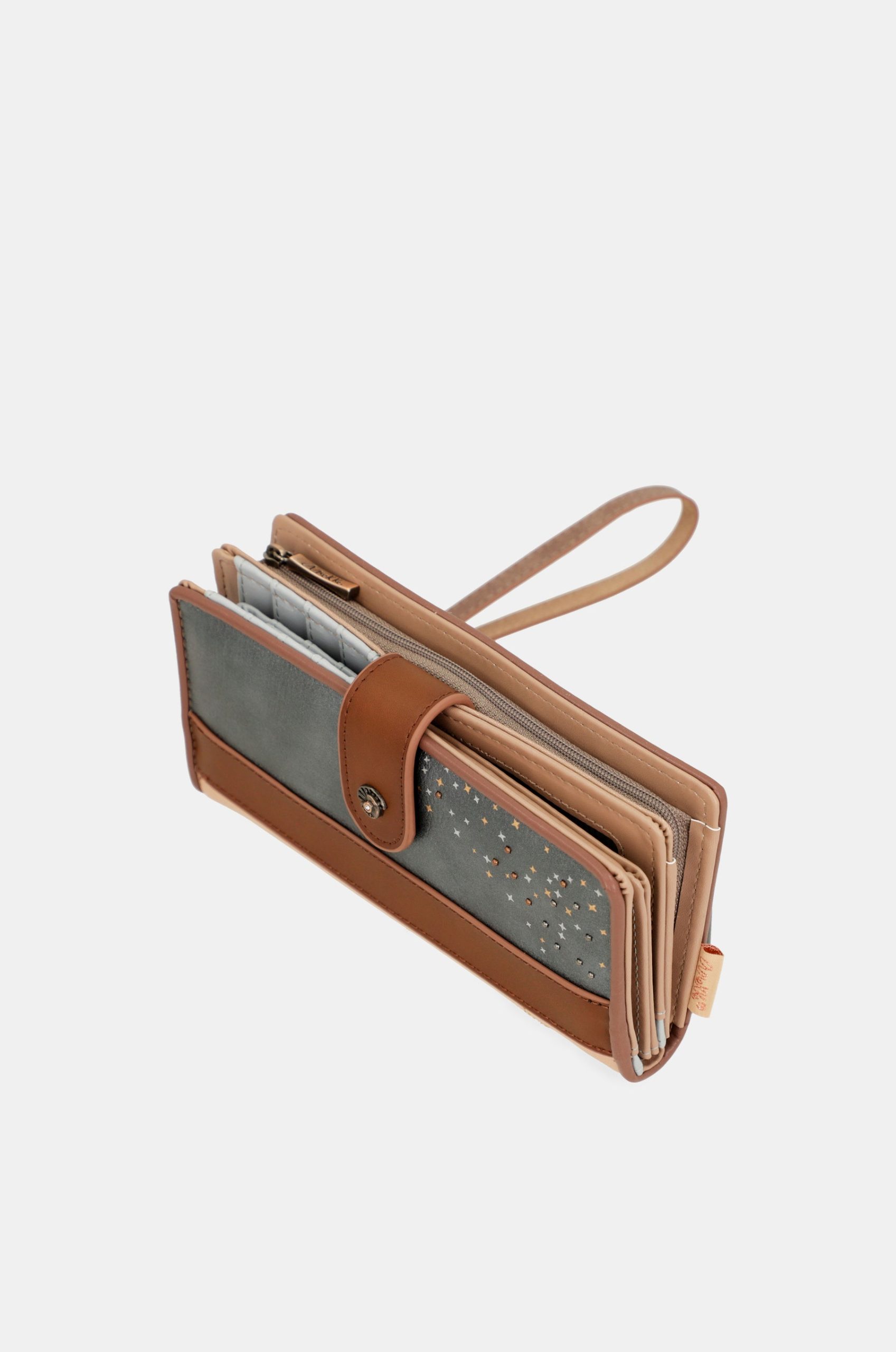 This large-sized wallet has two main compartments: the back, where there is a large billfold and space for banknotes, cards or documents, and the top with a zip closure to keep coins inside. The entire interior is lined. In addition, it has a hand handle for easy carrying.