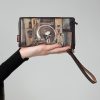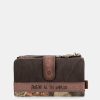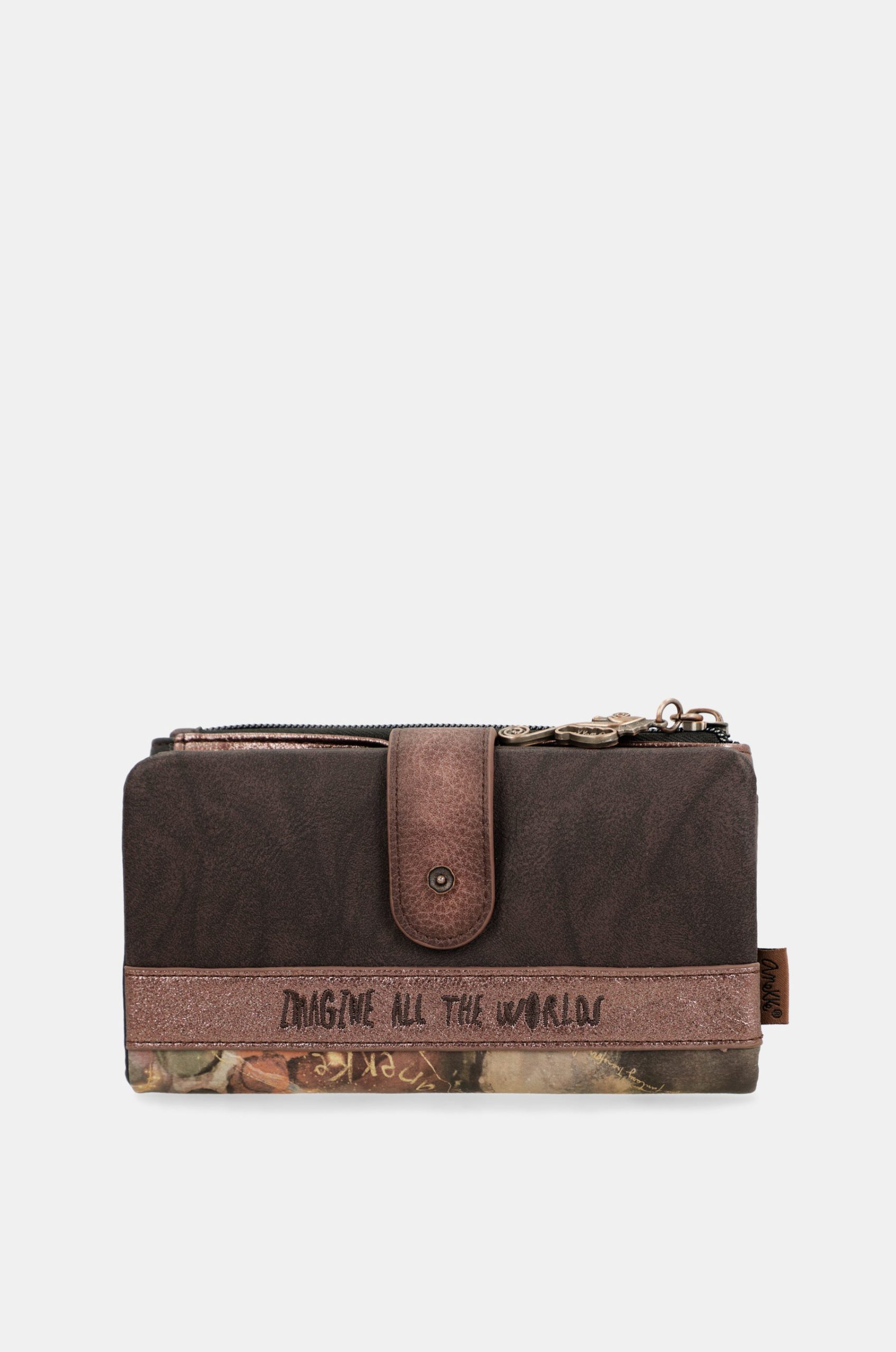 It is a large-sized wallet. It is made of flexible material. It has two main compartments: the back, where you will find a large billfold and space for banknotes or documents. It has a zip at the top, and inside you can keep coins. The entire interior is lined.