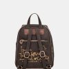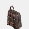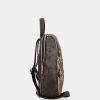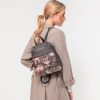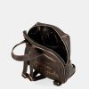 This backpack is medium-large in size and has pockets on the front and back. It has a zip closure, lined interior and pockets. The two backpack straps are adjustable to different lengths.