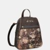 This backpack is medium-large in size and has pockets on the front and back. It has a zip closure, lined interior and pockets. The two backpack straps are adjustable to different lengths.