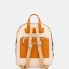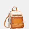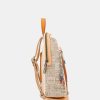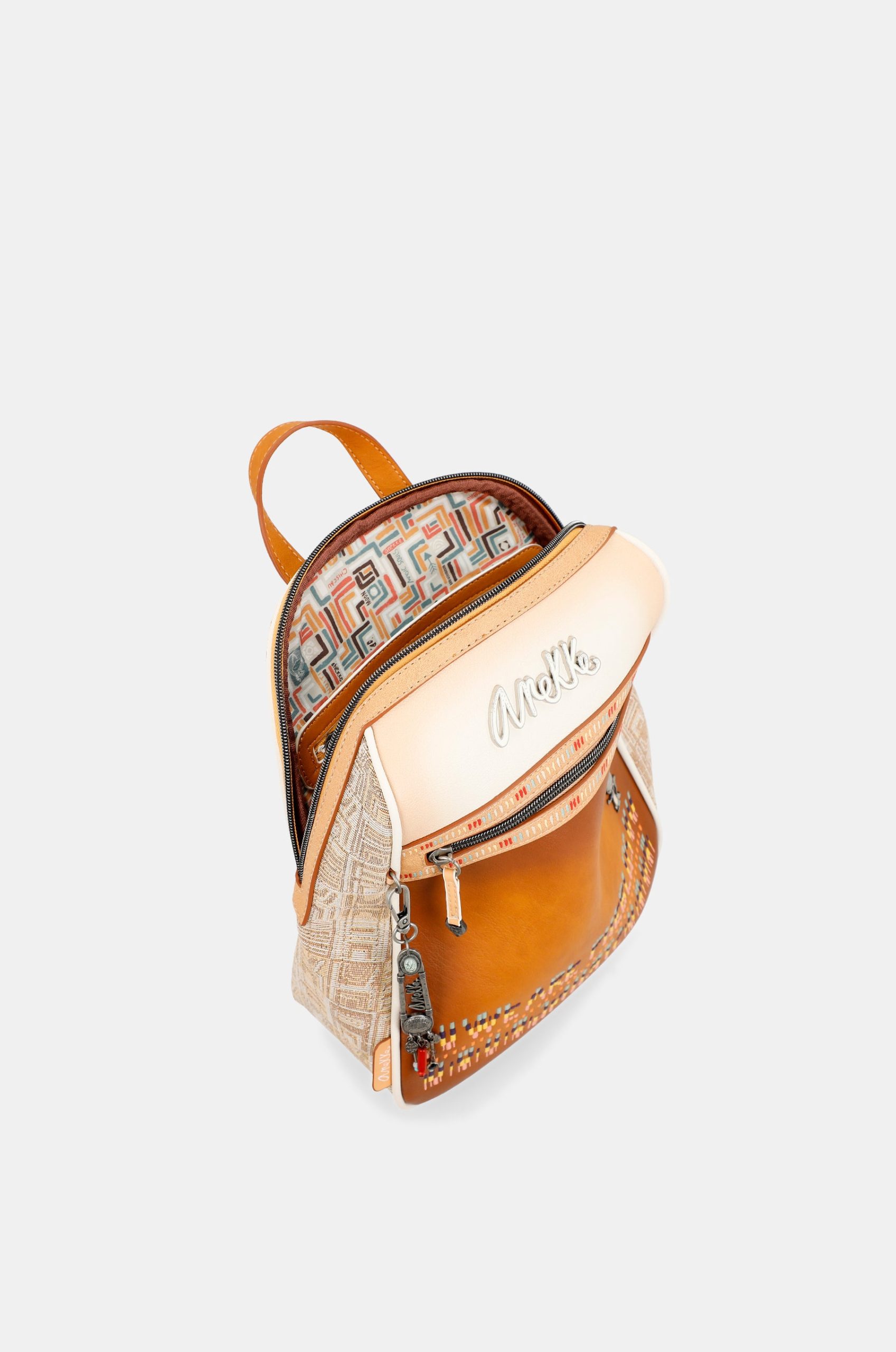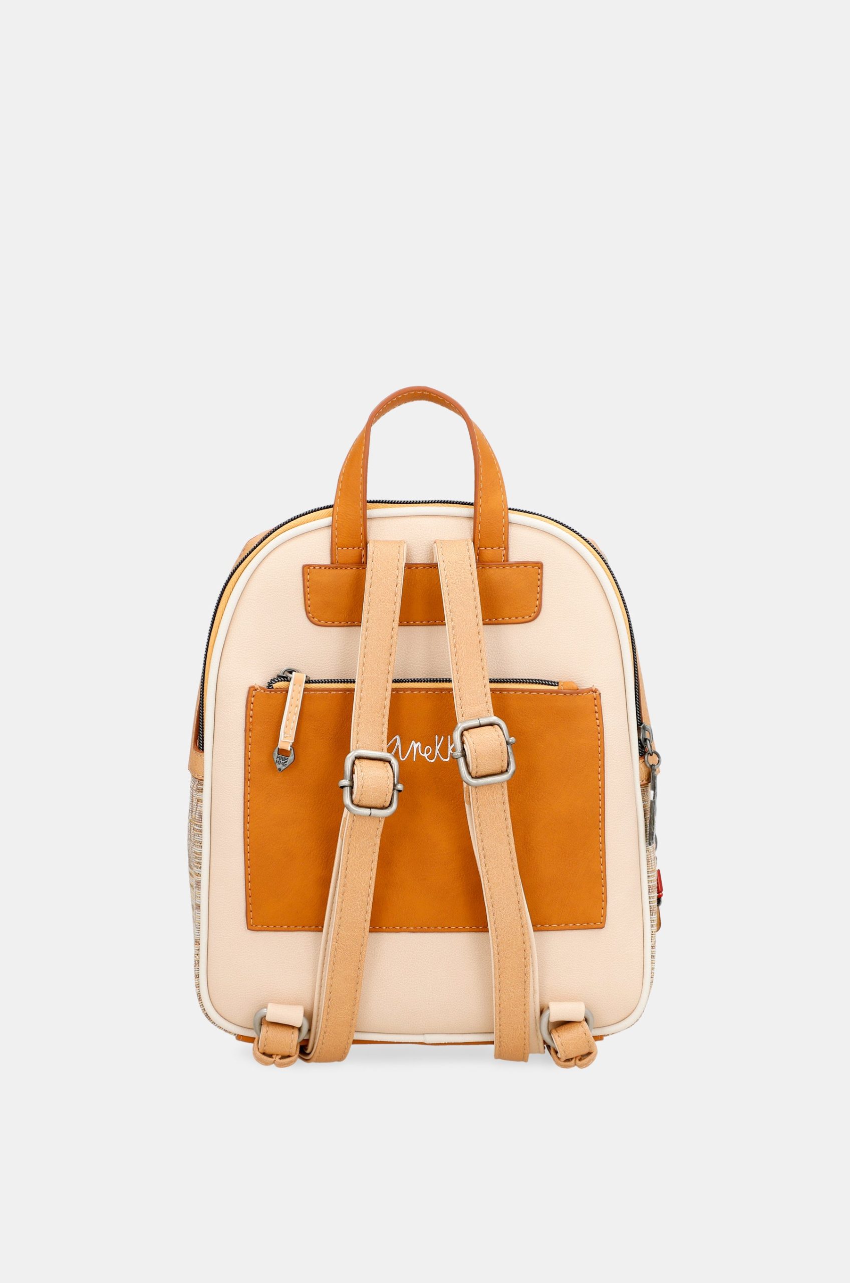 This backpack is medium-large size and has front and back pockets. The front of this bag combines a brown base with stitching and embroidery in different colors: orange, pink, yellow, yellow, aquamarine and navy blue. These embroidered phrases have phrases or representative words that read in mirror mode. These embroidered phrases have representative phrases or words that are read in mirror mode, discover them!