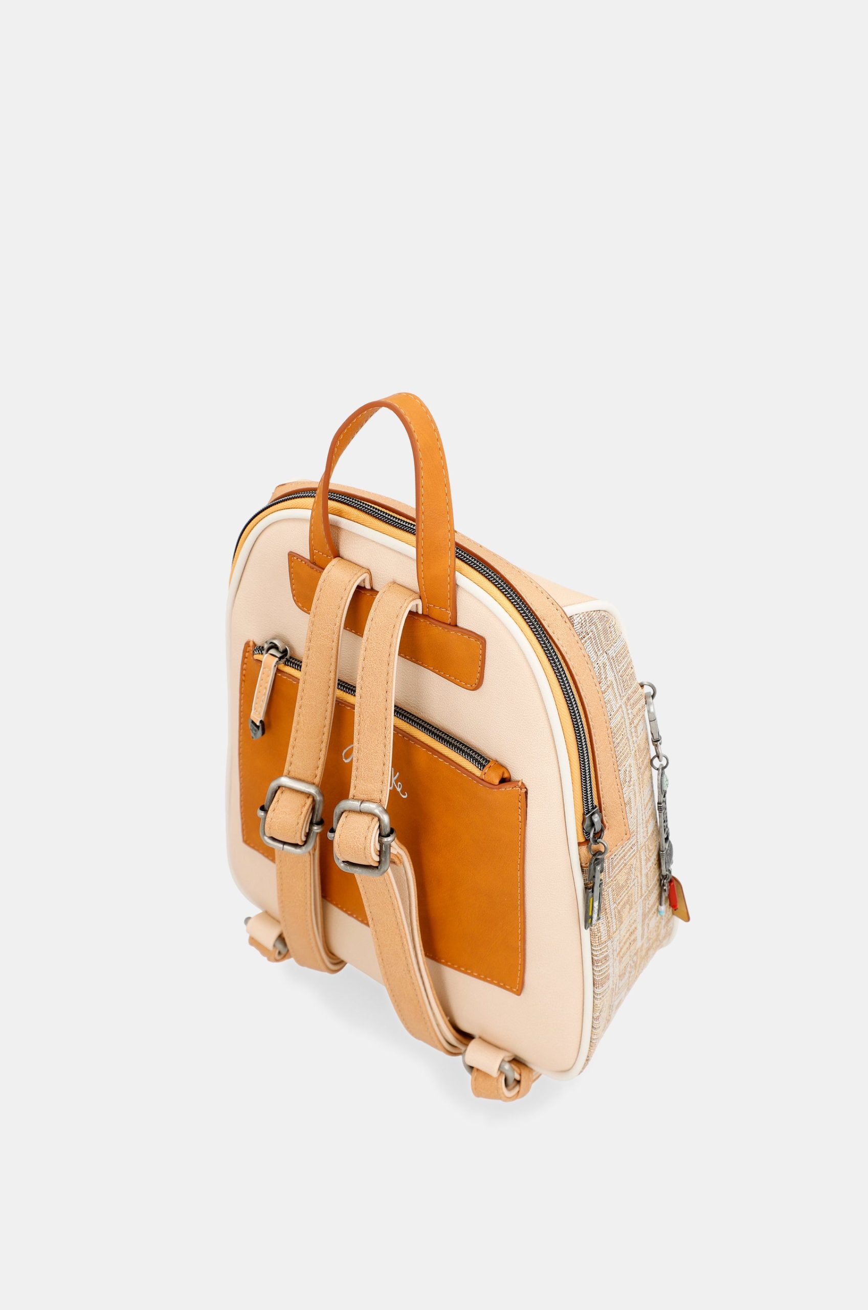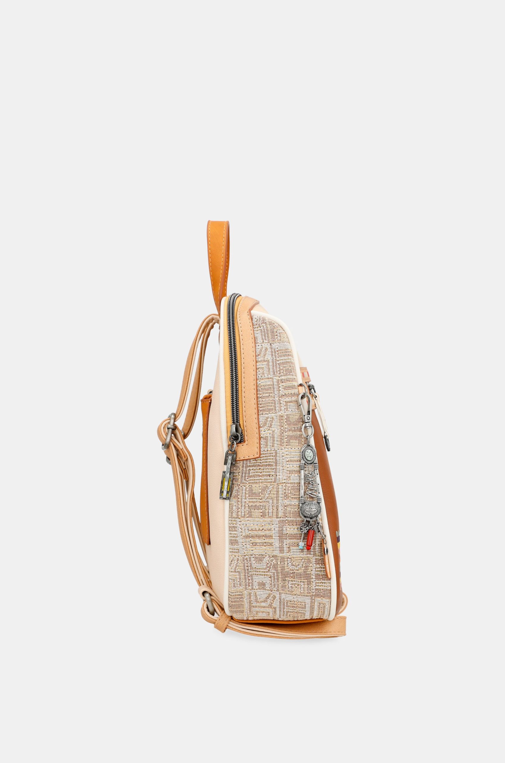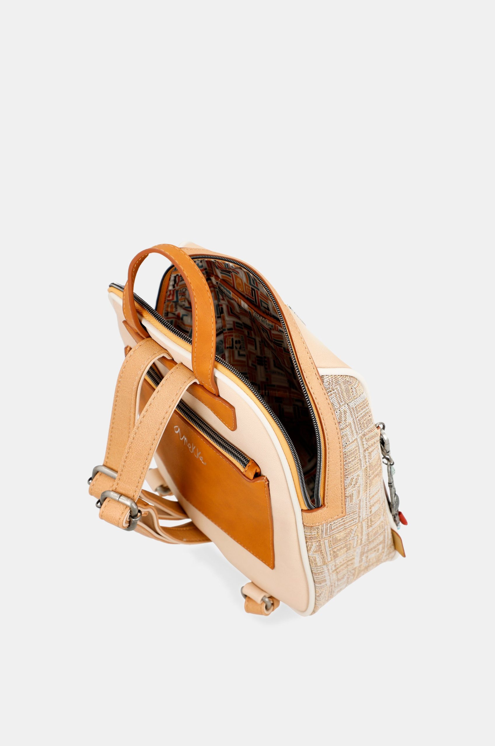 The backpack has two adjustable backpack straps at different lengths, plus a grab handle for the hand. The interior is lined with an original fabric printed with motifs from the collection, and has pockets.