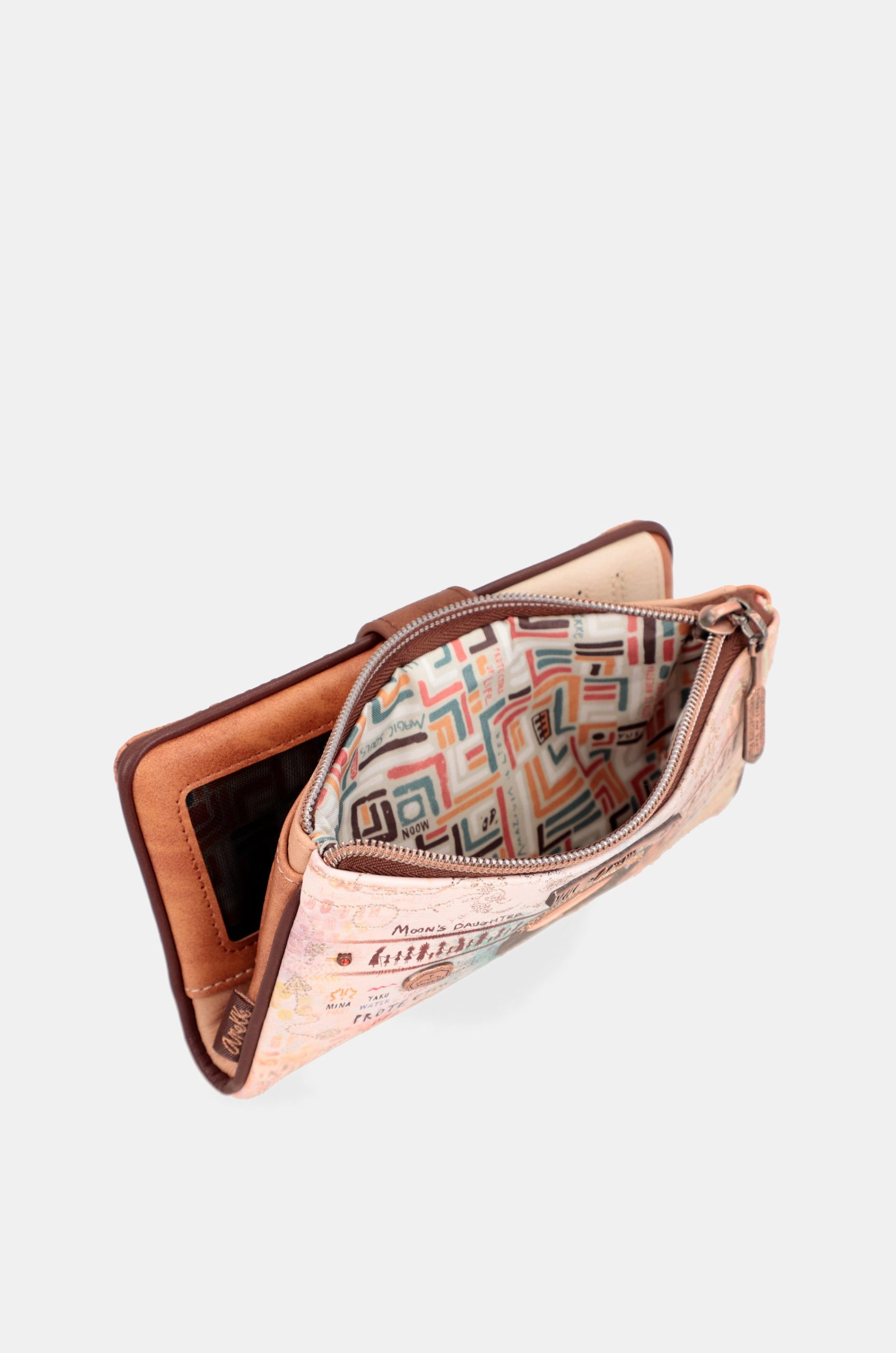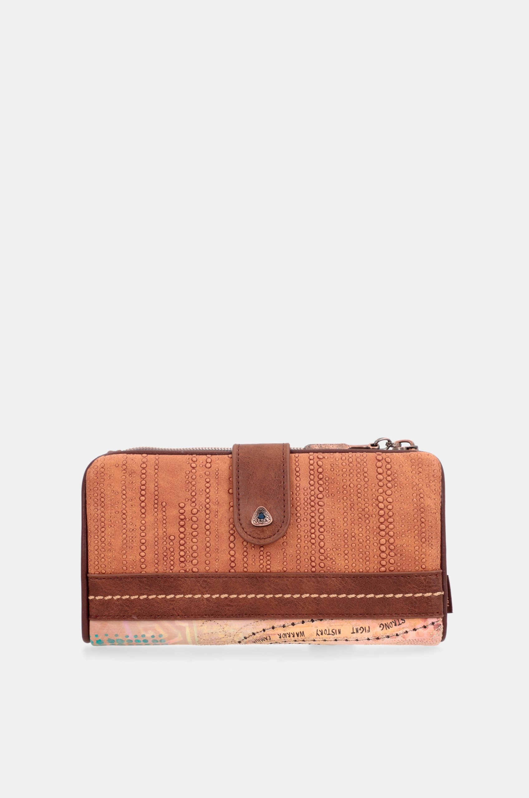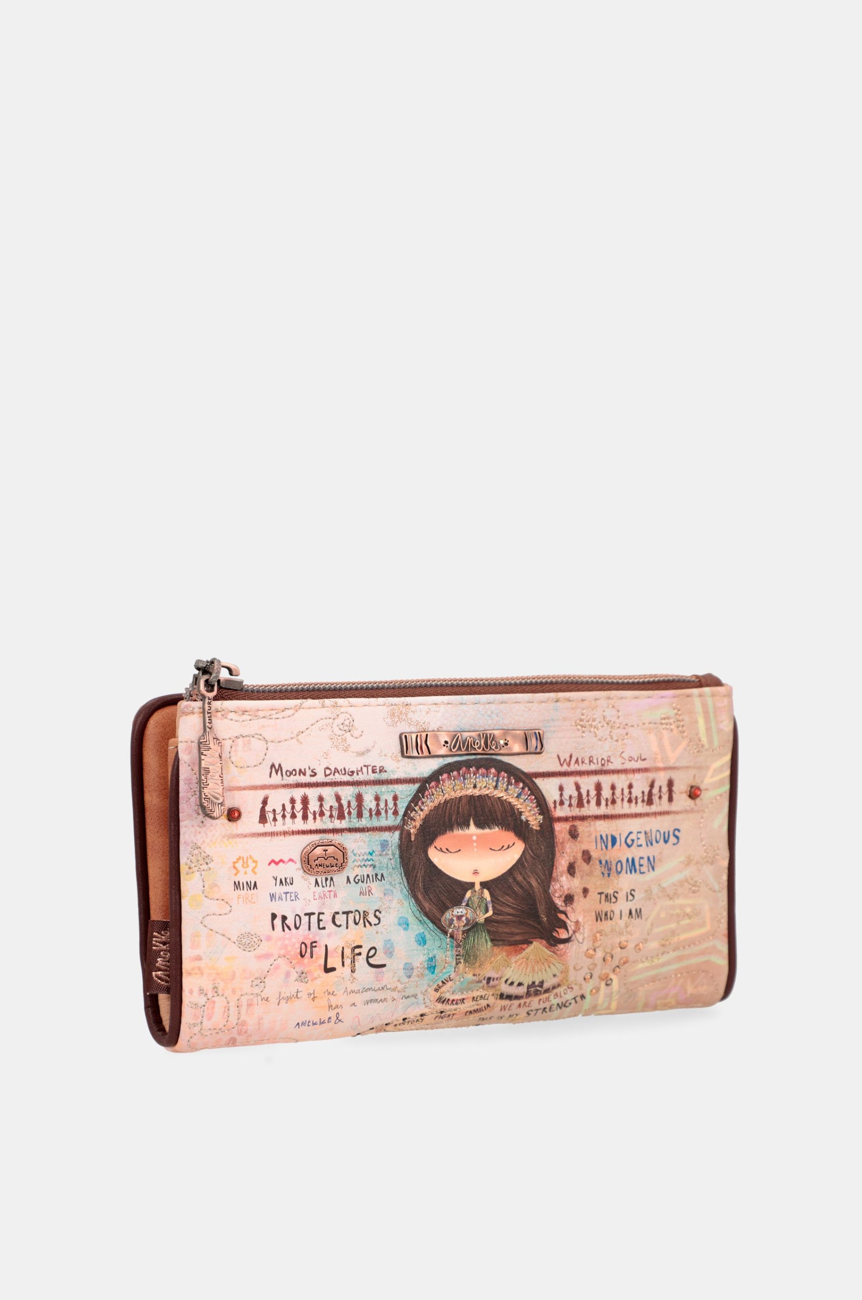 It’s a wallet Large size. The material it is made of is flexible.This model has RFID protection: an innovative protection system that protects our cards against unauthorized payments, information theft and interference. This model combines the print of the collection, in which different groups of indigenous women are represented, with parts in raw tone, decorated with embroidery and print in reddish tones.