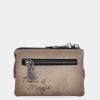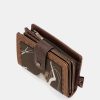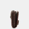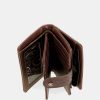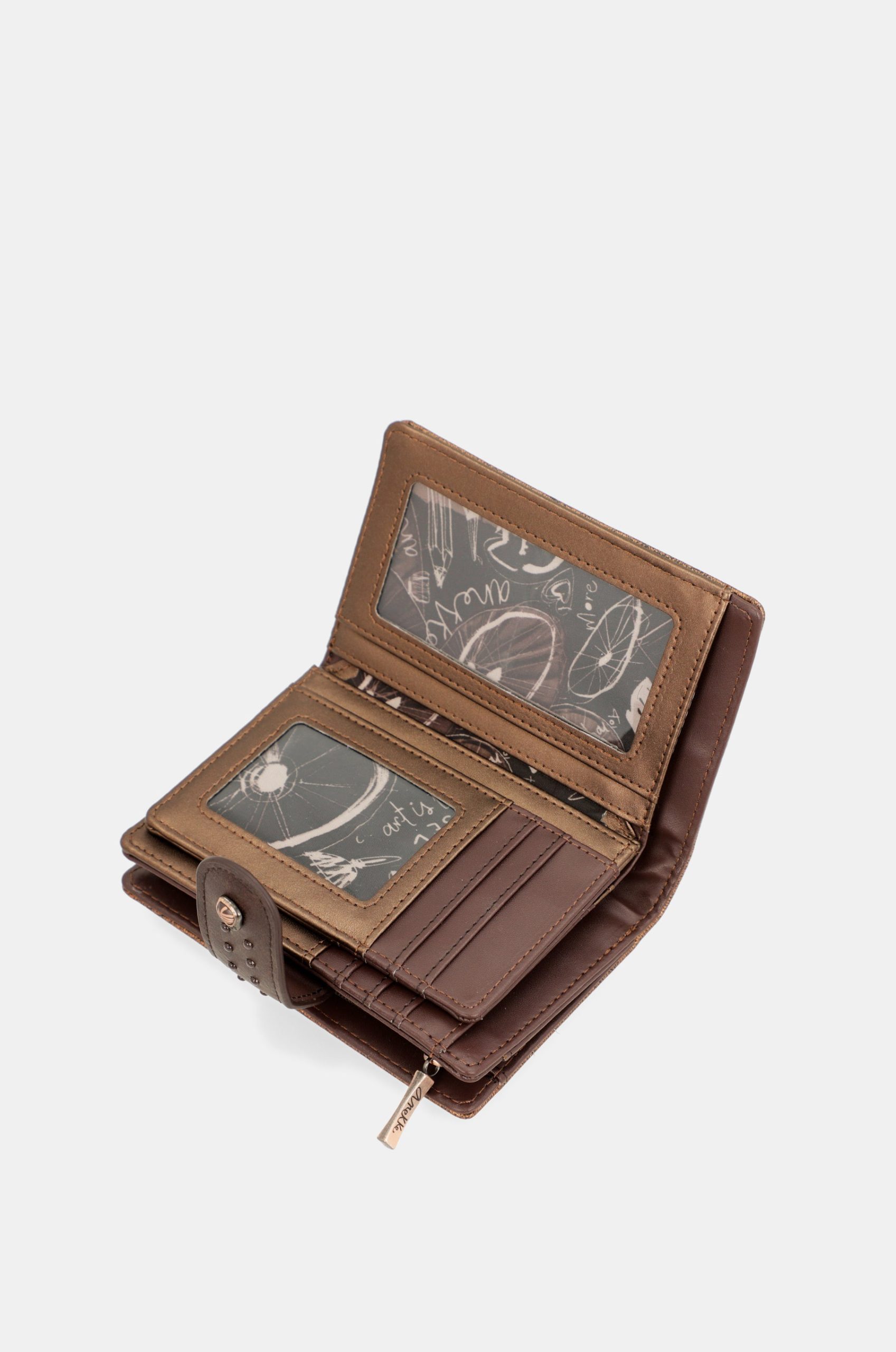 This medium sized brown wallet is made of flexible material and has two main compartments: the back, where you’ll find a large billfold and space for notes or documents. The top compartment has a zip, and inside you can store coins. The entire interior is lined.