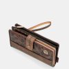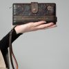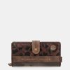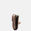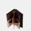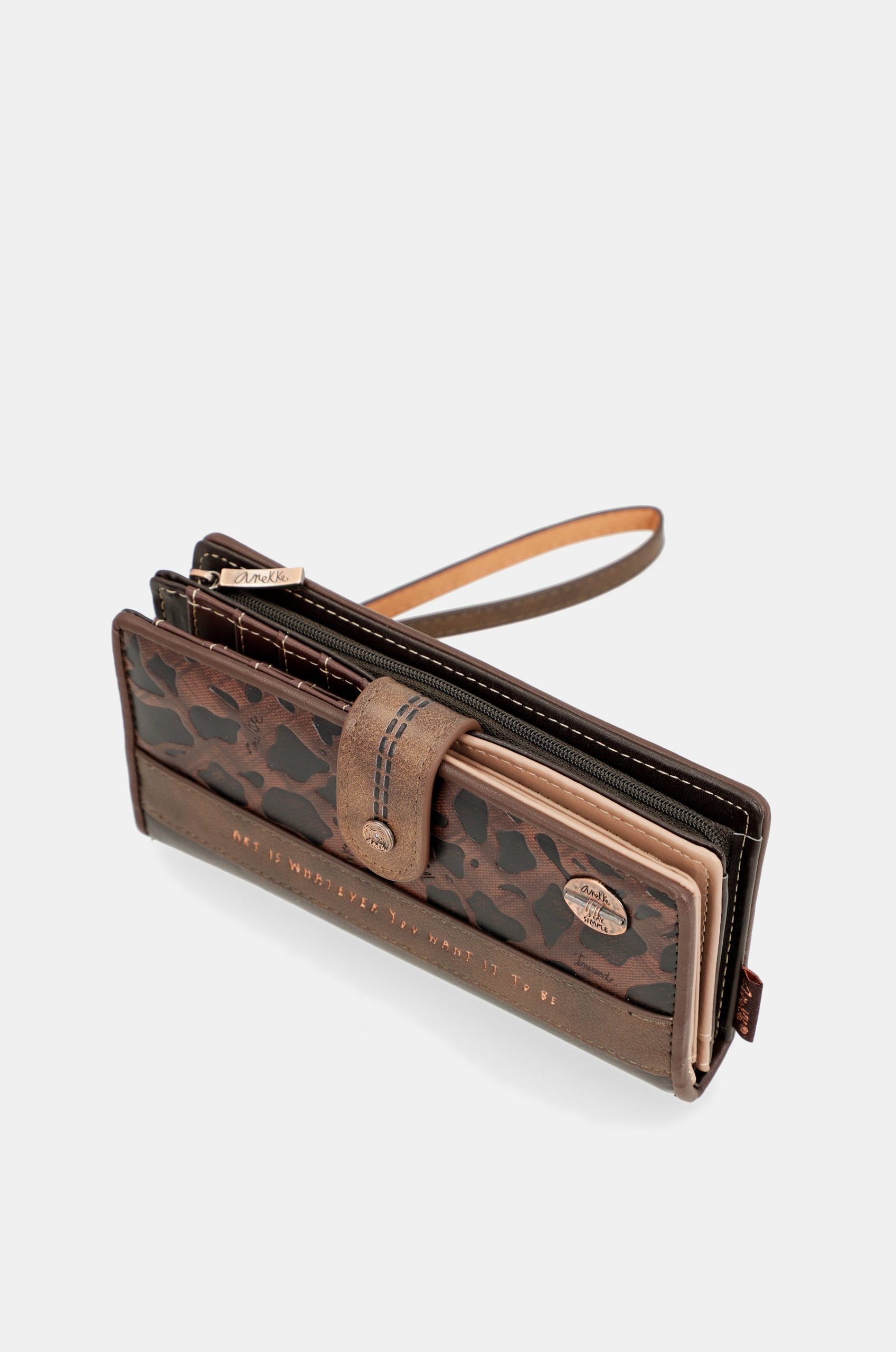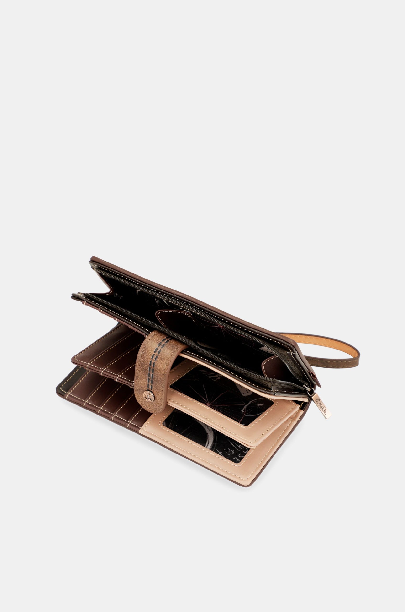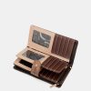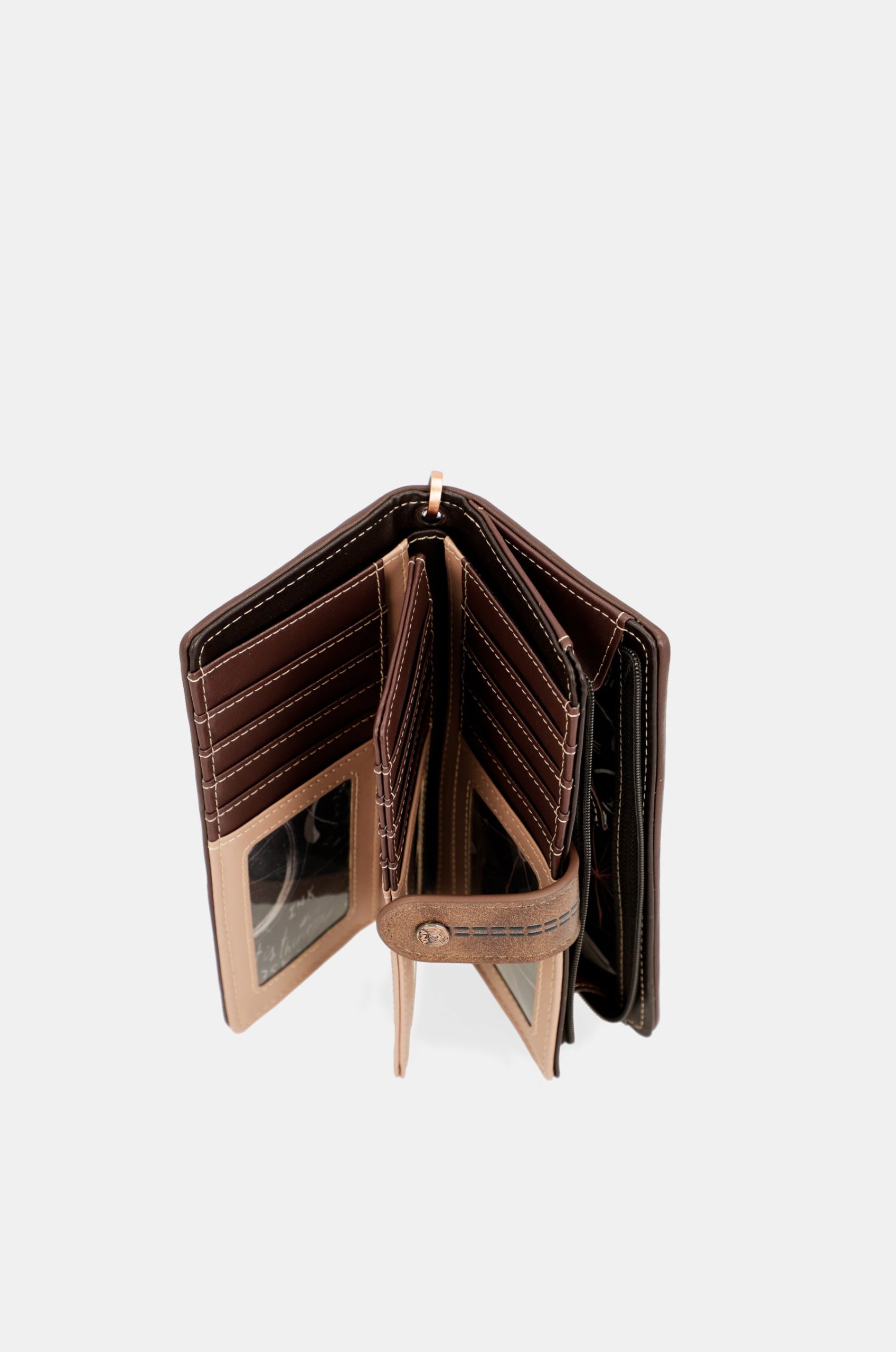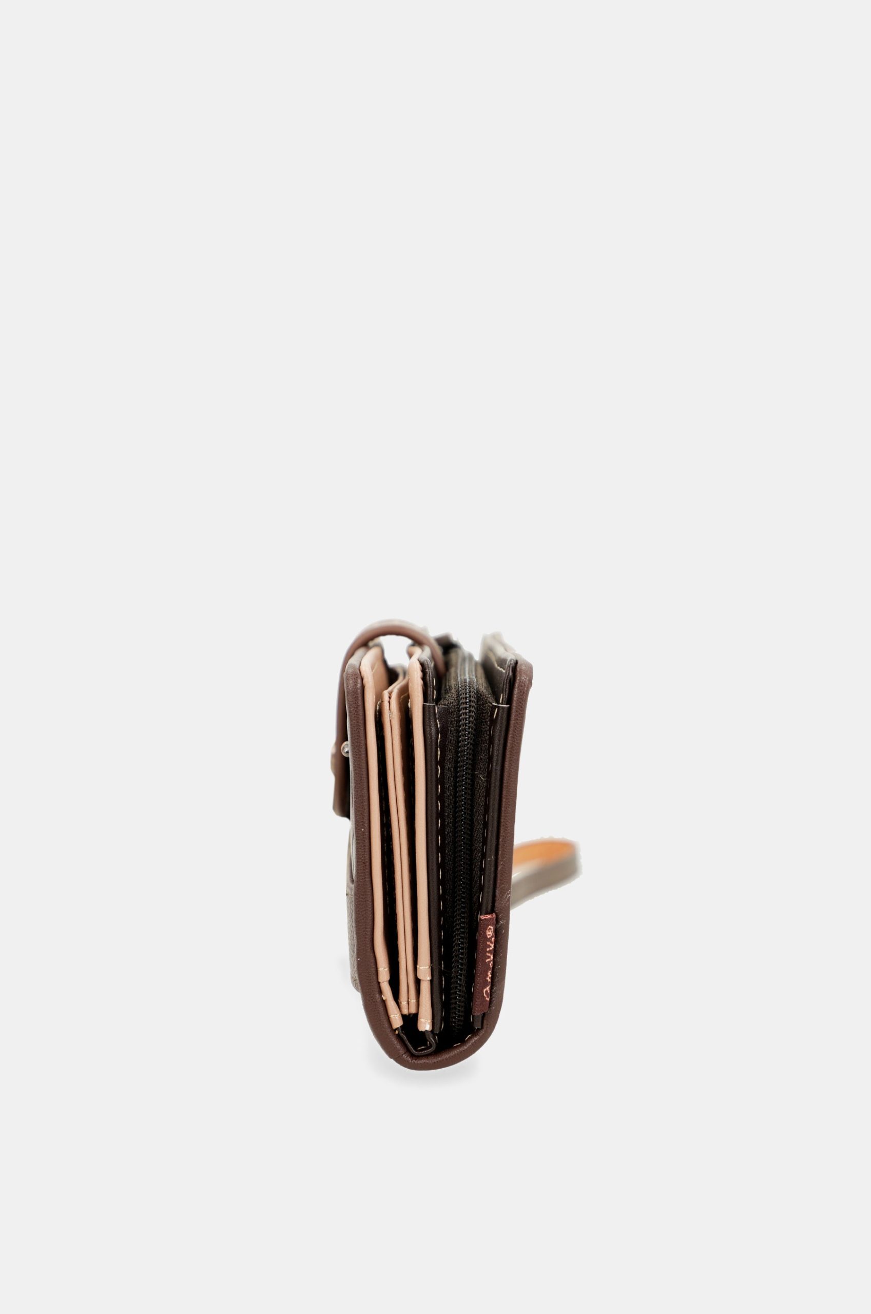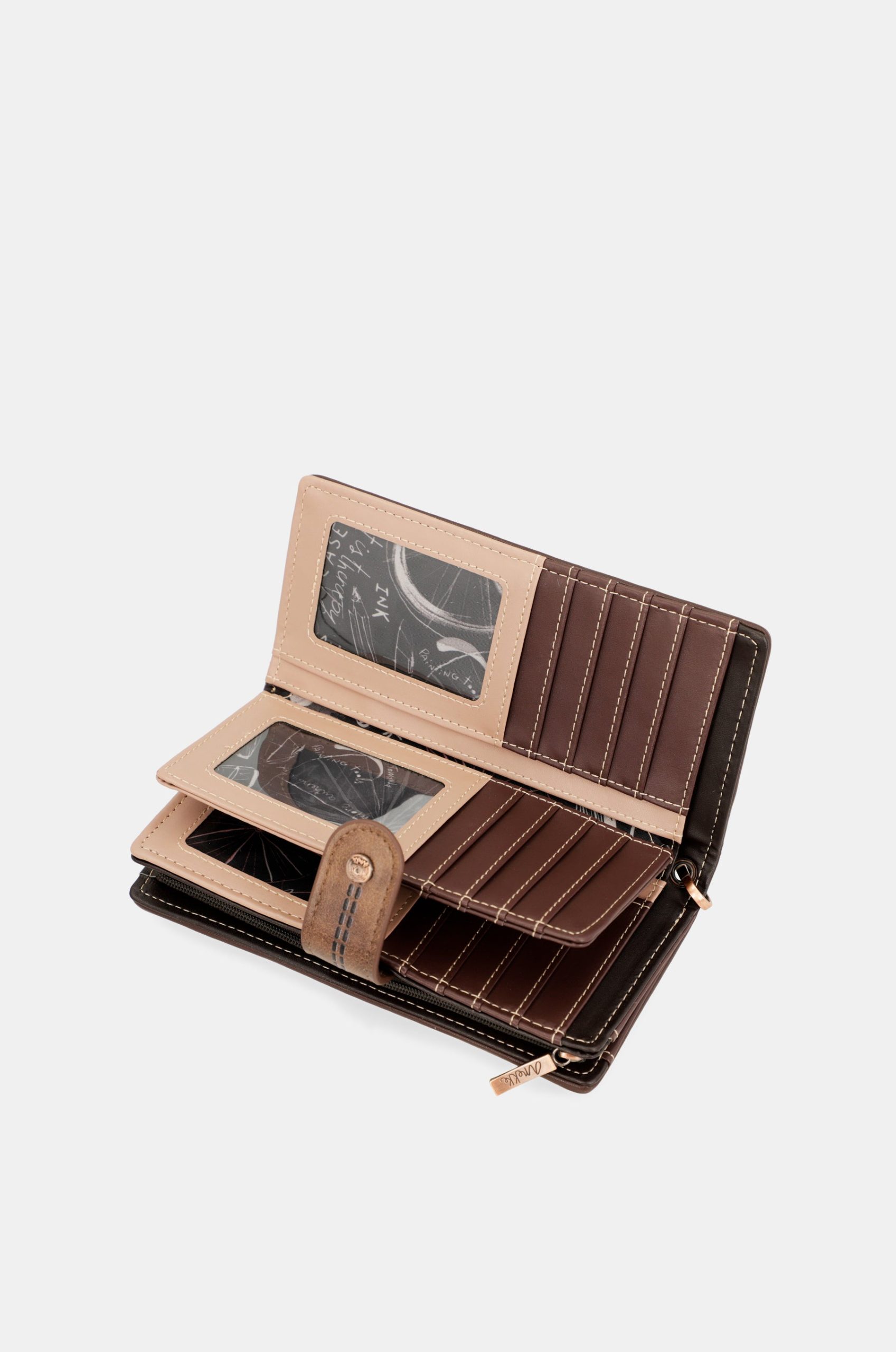 This is a large size wallet. It has two main compartments: the back, where you’ll find a large wallet and space for notes, cards or documents. The top part has a zip, and inside you can store coins. The entire interior is lined.