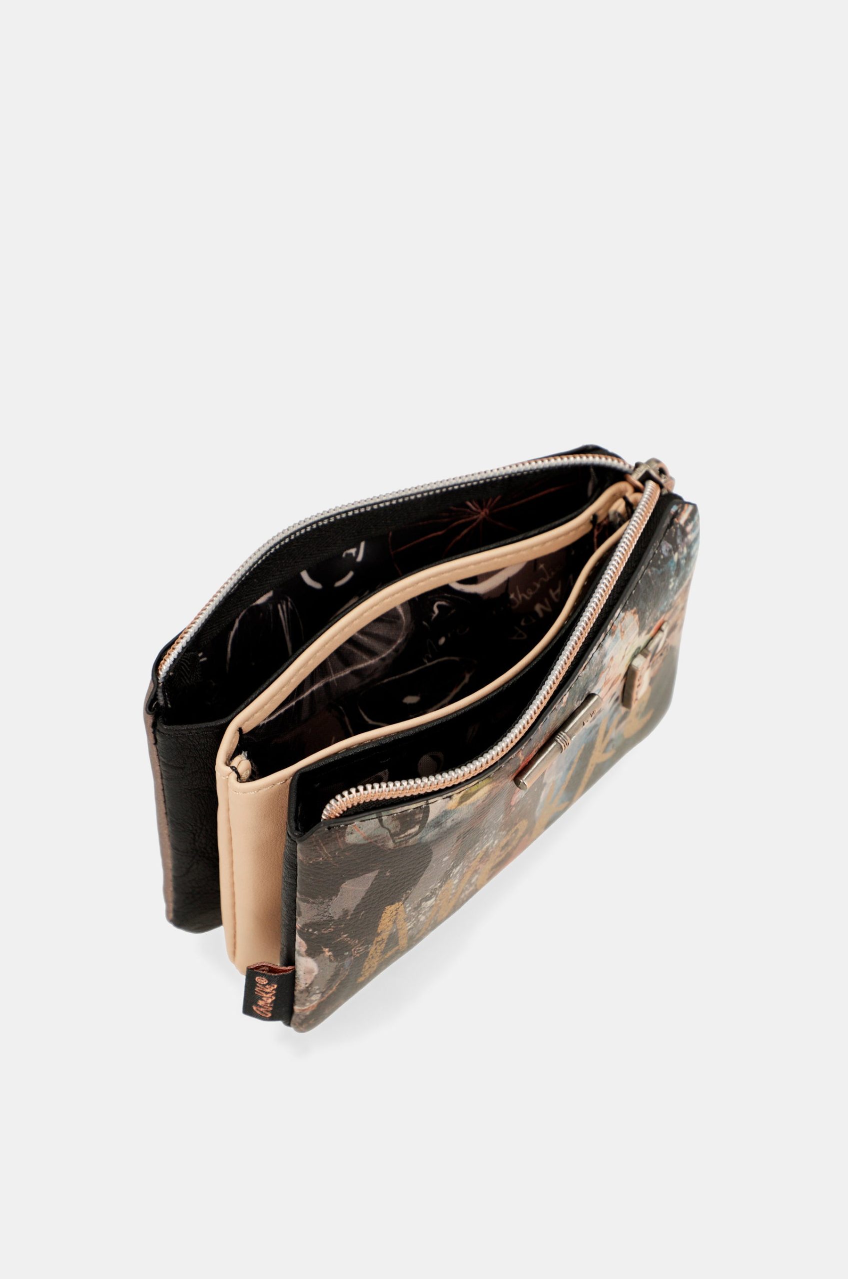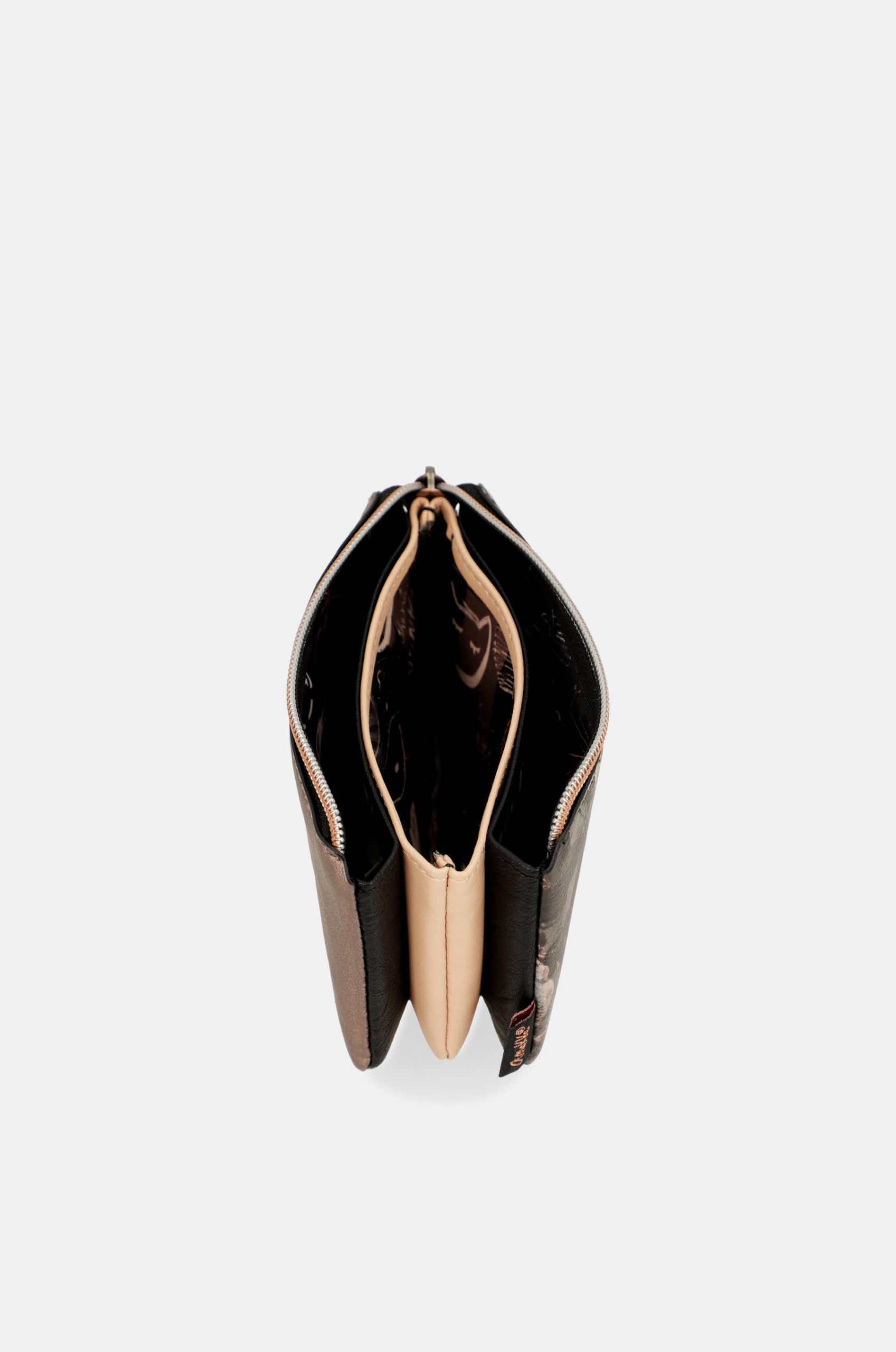 This line is characterised by the pleated effect of the material, which features a print inspired by the painting on a black base, contrasted with reddish and blue touches. It is also full of unique details, such as the metal logo and personalised pins and handles.