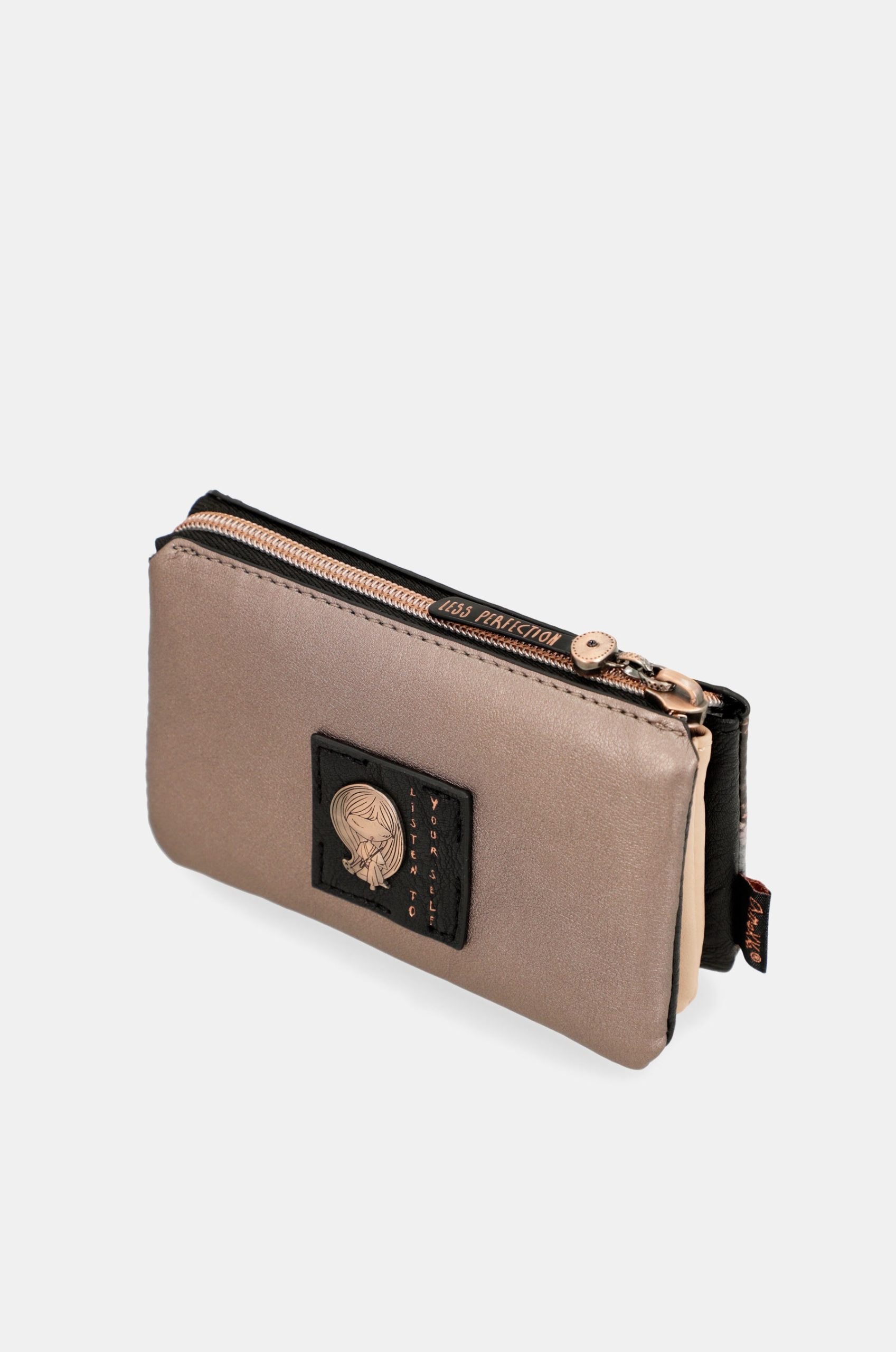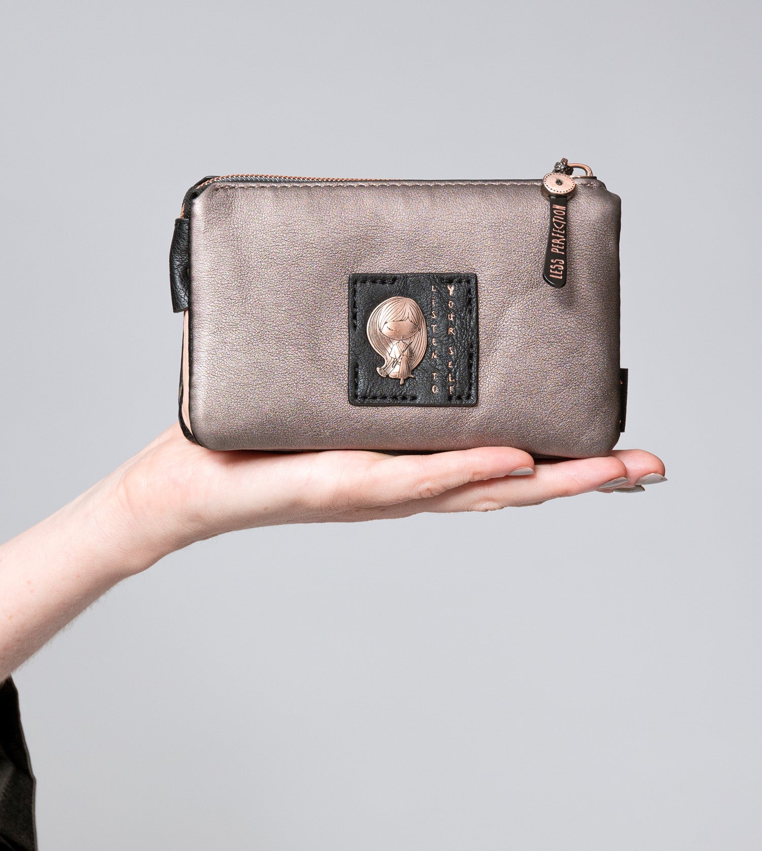 This is a medium-sized purse with a triple compartment. The material it is made of is flexible. This model opens with a zip and the inside is lined.