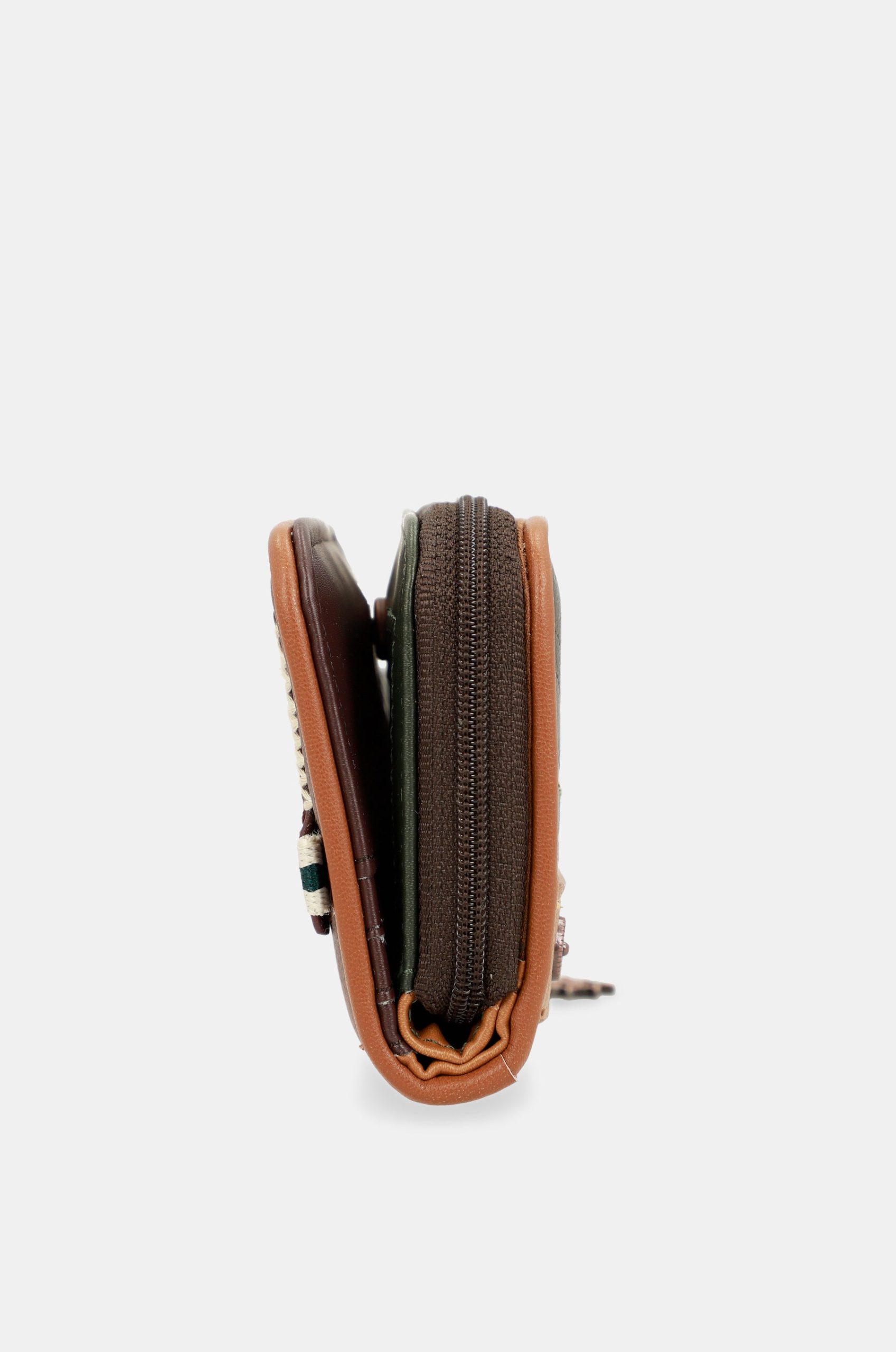 It has two main compartments: the back, where you will find a large wallet and space for bills or documents. The upper part has a zipper, and inside you can store coins. The entire interior is lined.