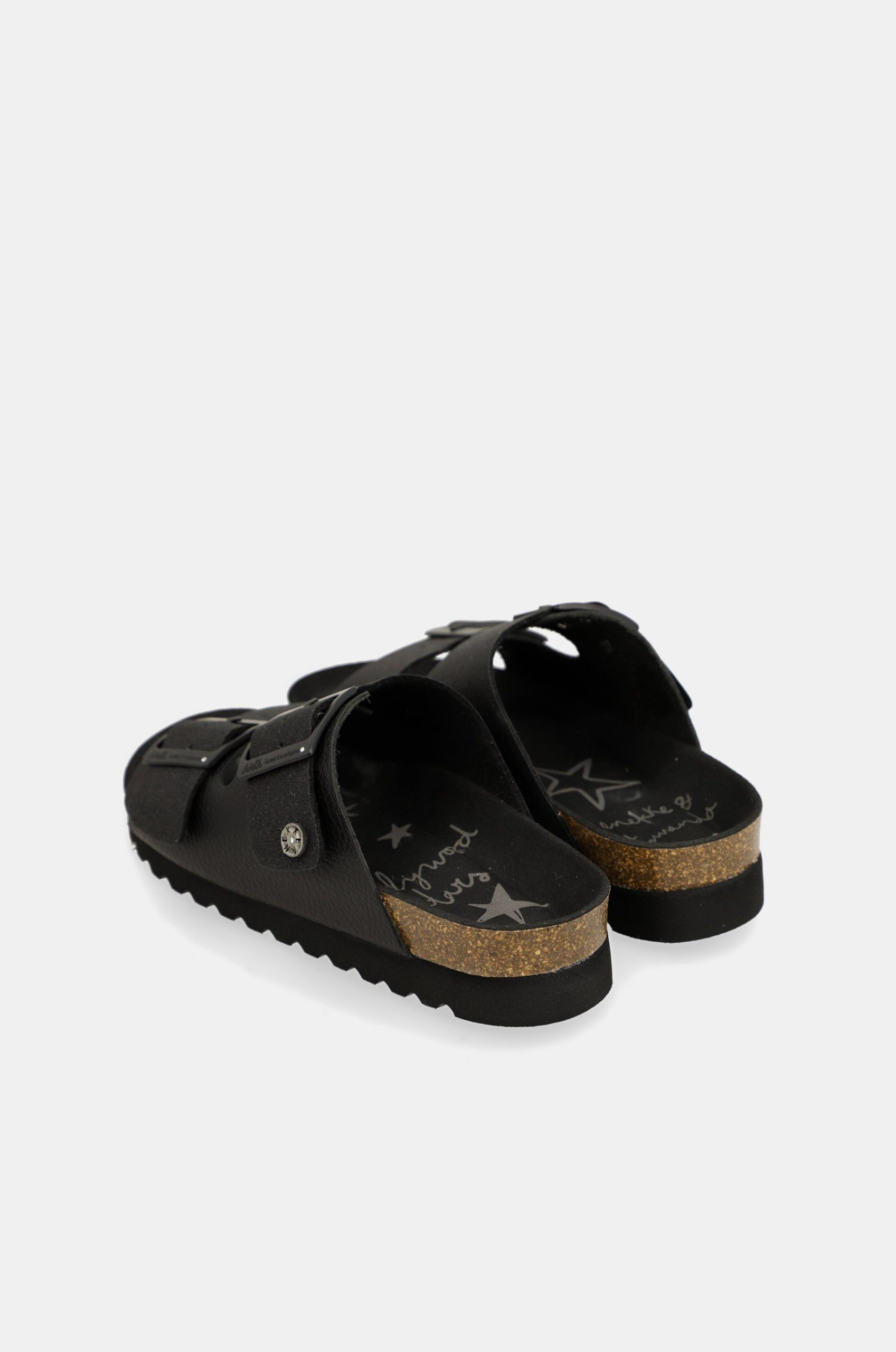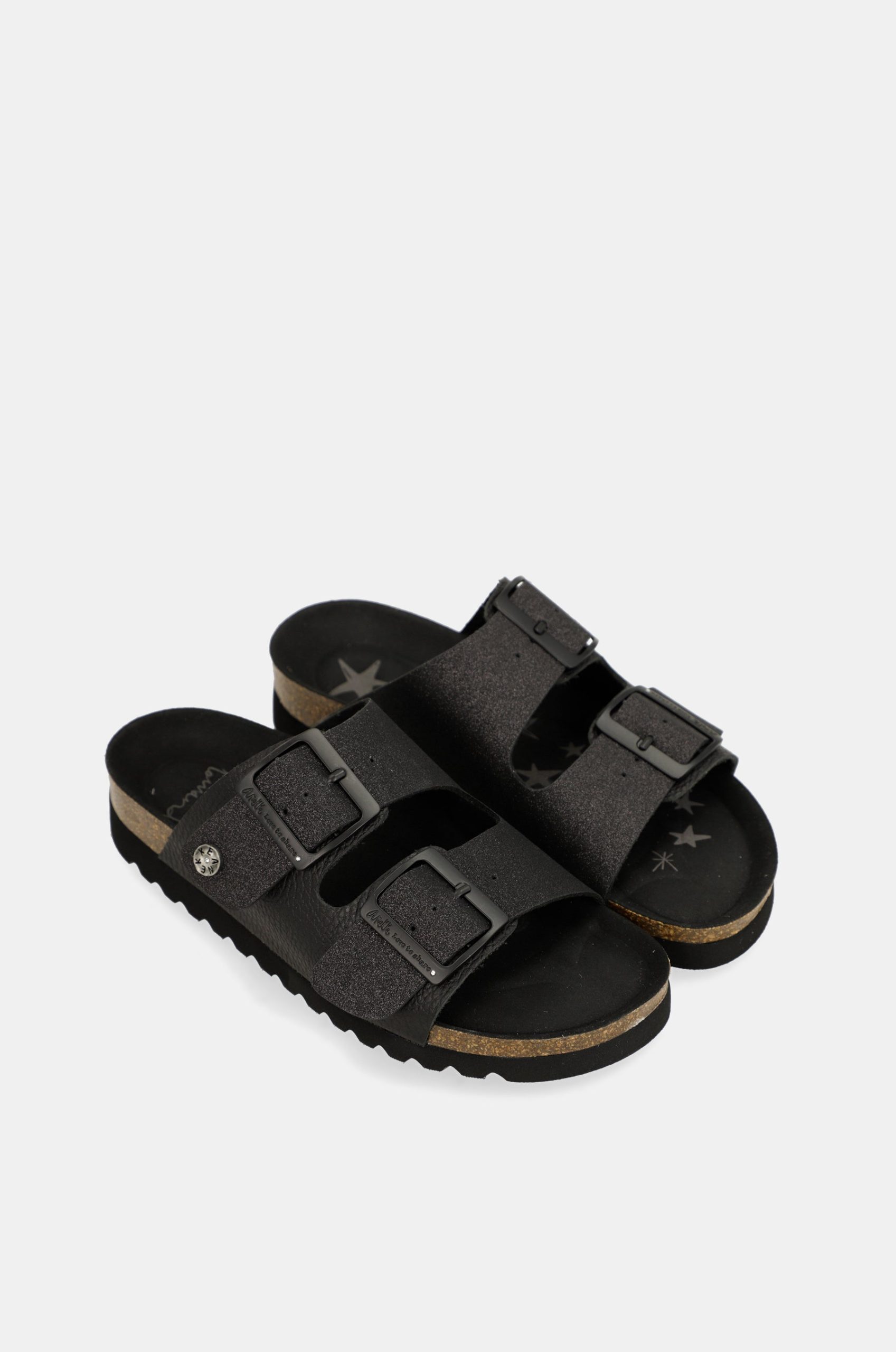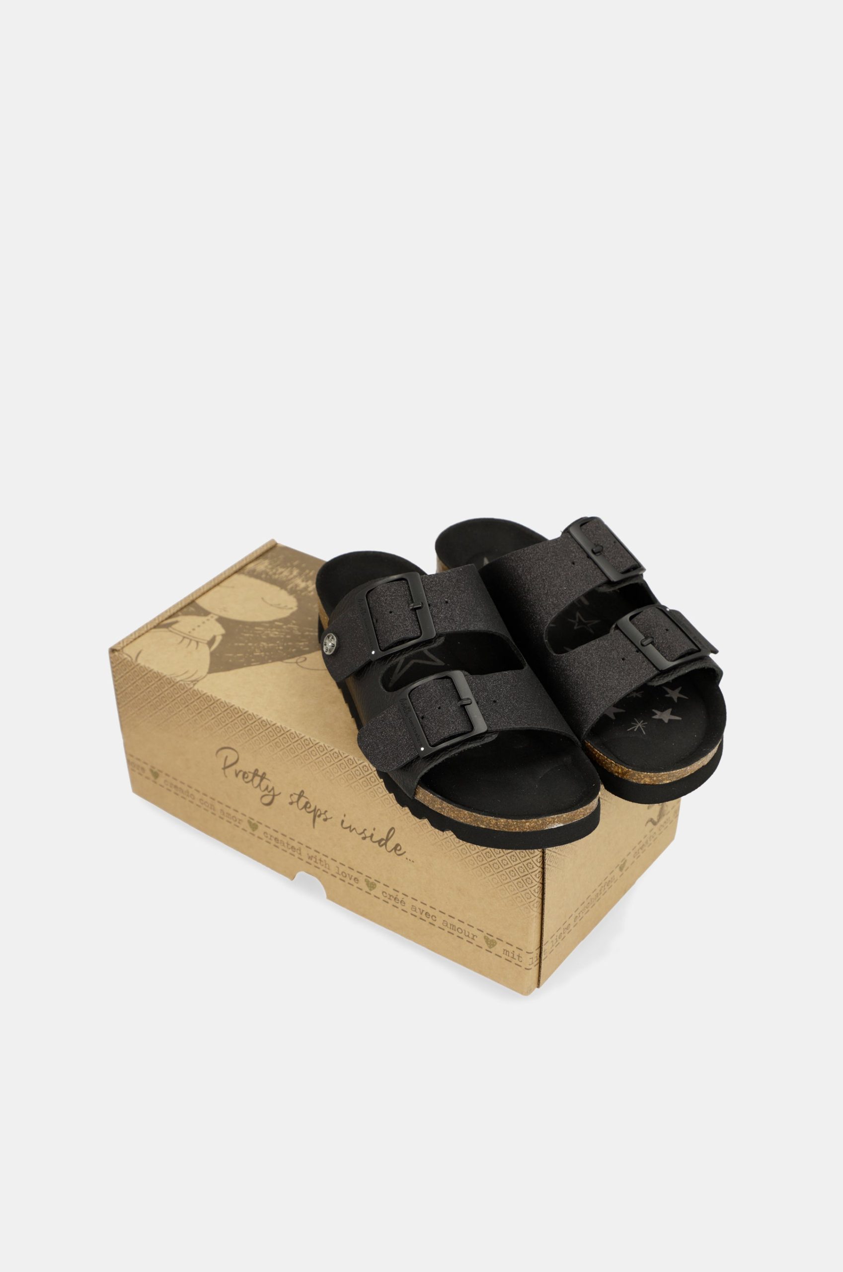 Ready for a walk down the red carpet of comfort? These bio sandals will take you there. They feature a natural cork base combined with the black glitter material, with an original print on the insole. The personalised buckle adjusts to different sizes. Perfect to become your new favourites. Get them now!