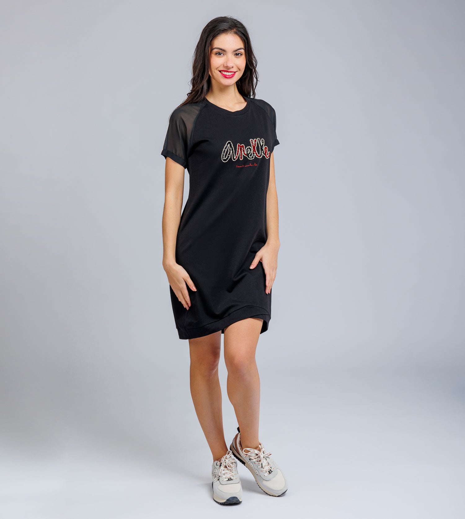 This black dress with sheer sleeves will be your best choice for a summer night out with friends.