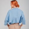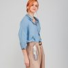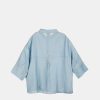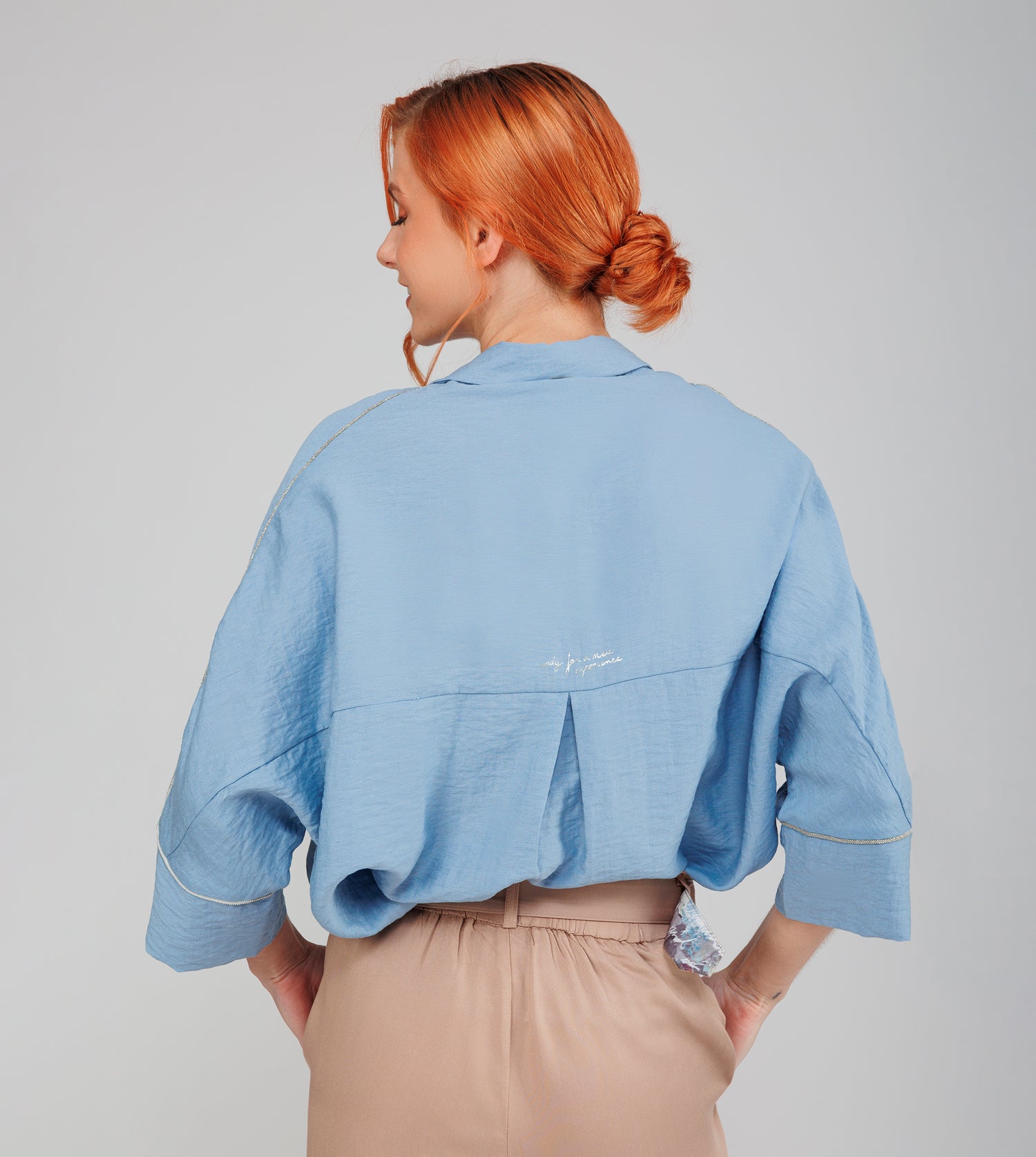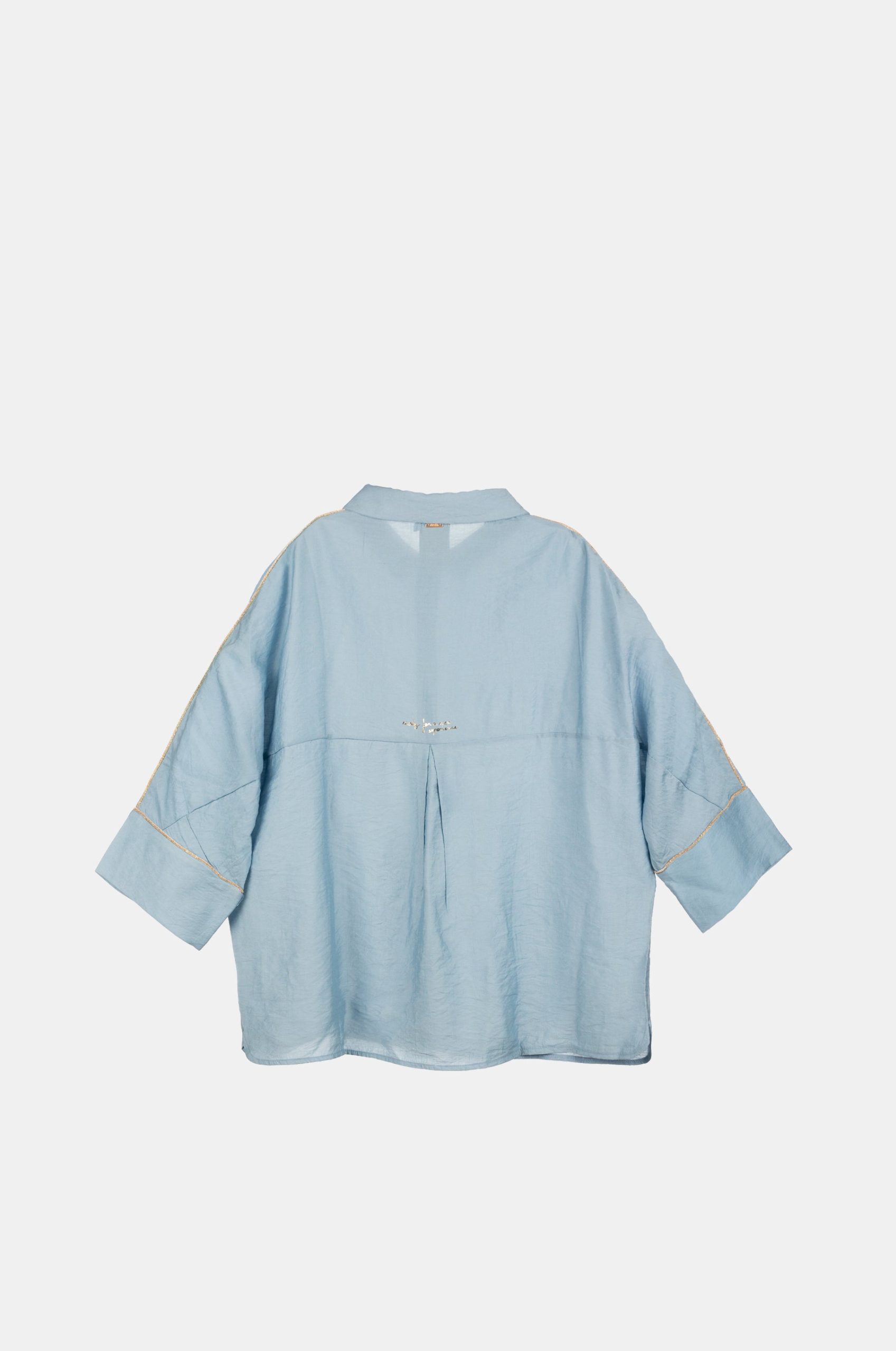 It is blue, with half sleeves and a button closure. When wearing it, style it however you want! You can wear it loose, as an over-shirt, with pants or a skirt… A myriad of possibilities to tell a little more about yourself to the world.