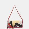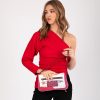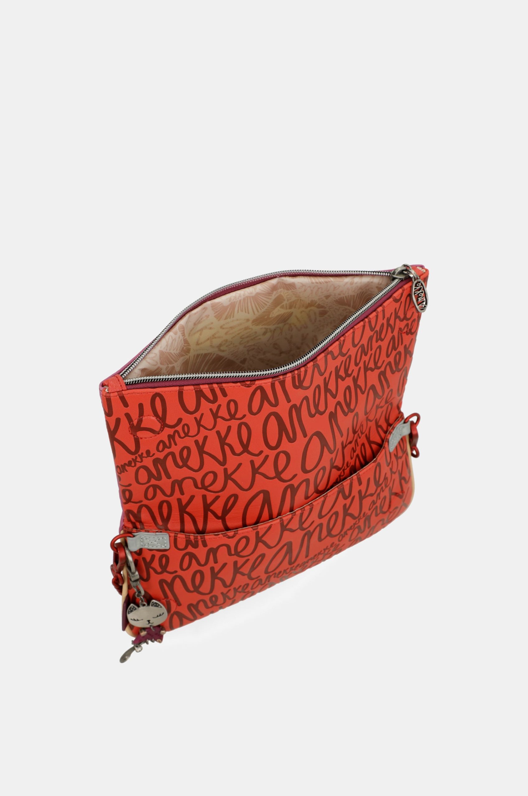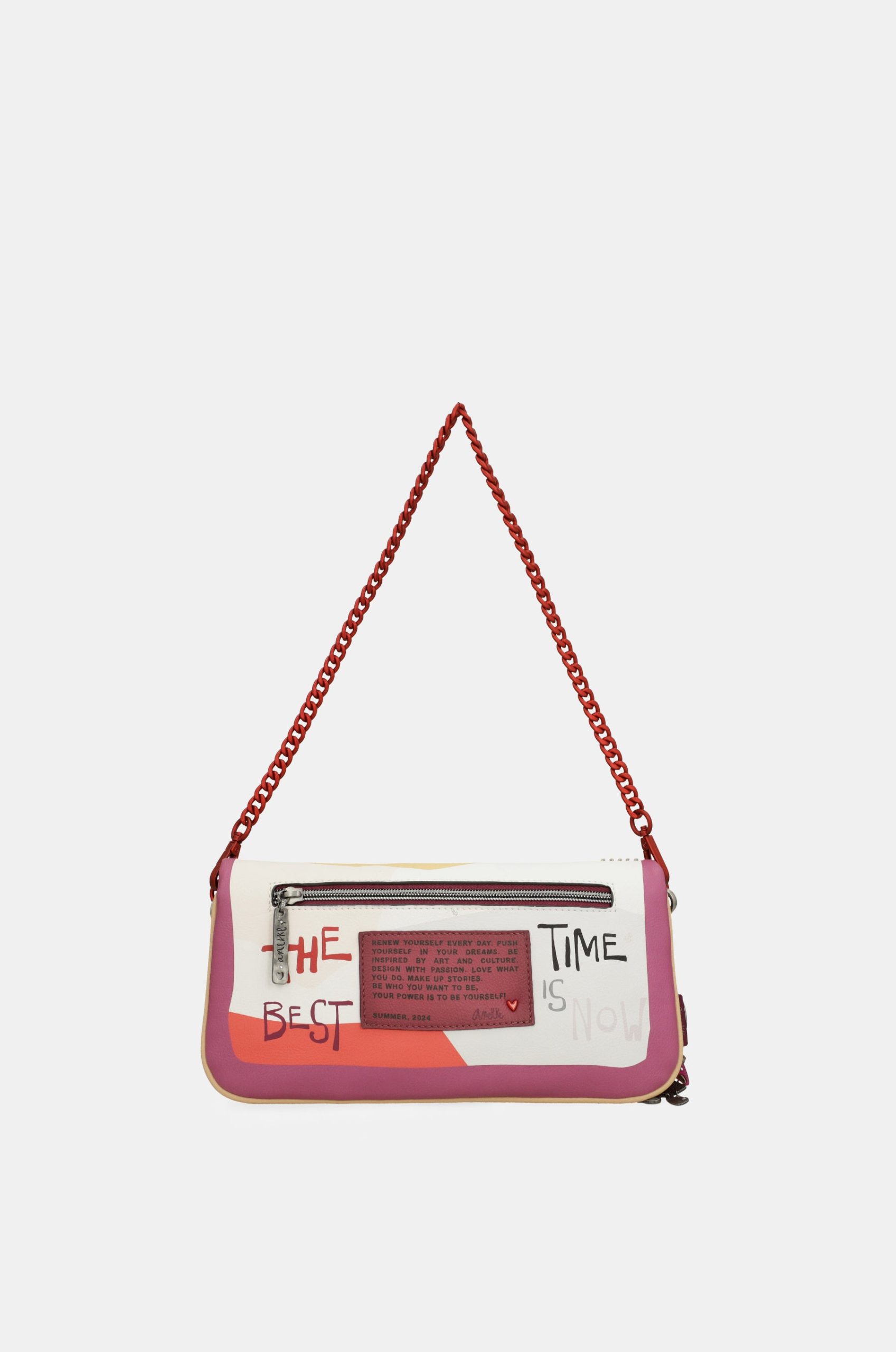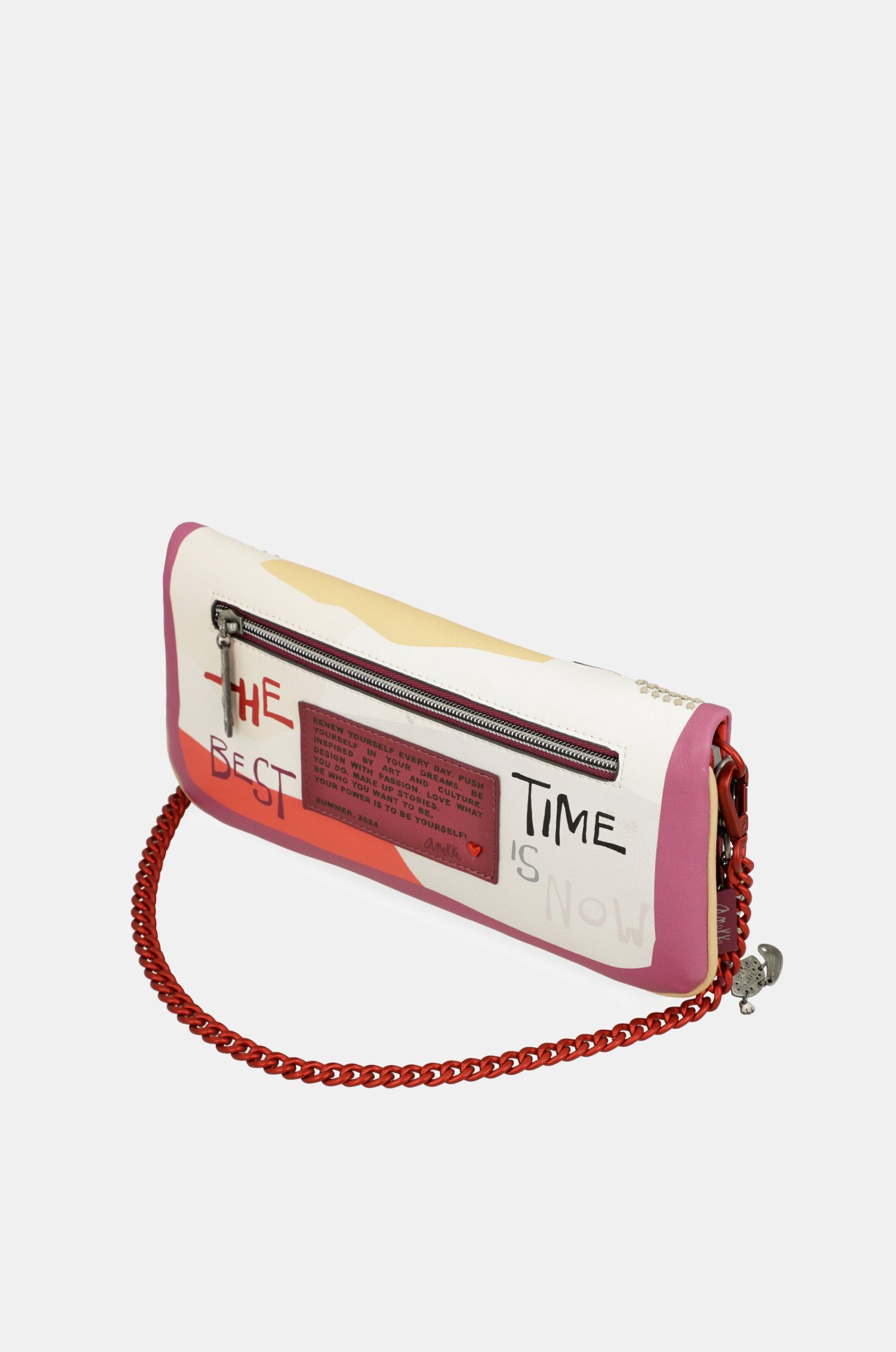 This original crossbody bag, which you can also use as a shoulder bag, is sure to be a bag that you will use with any outfit thanks to its versatility. It is a rectangular-shaped bag made of flexible material, which makes it possible to fold it into a flap shape. It opens with a zip and you can carry whatever you need in its lined interior. It also has an outside pocket on the back. To hang it up you can choose between the red shoulder strap with metal links, or use the removable shoulder strap, adjustable to different lengths.
