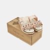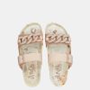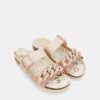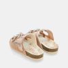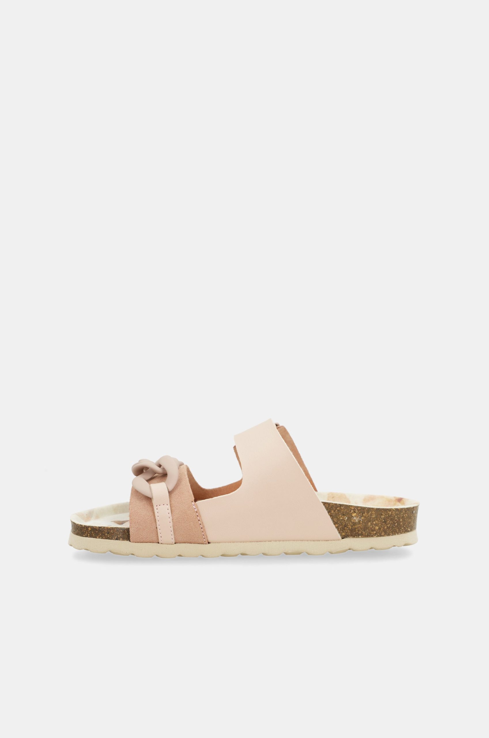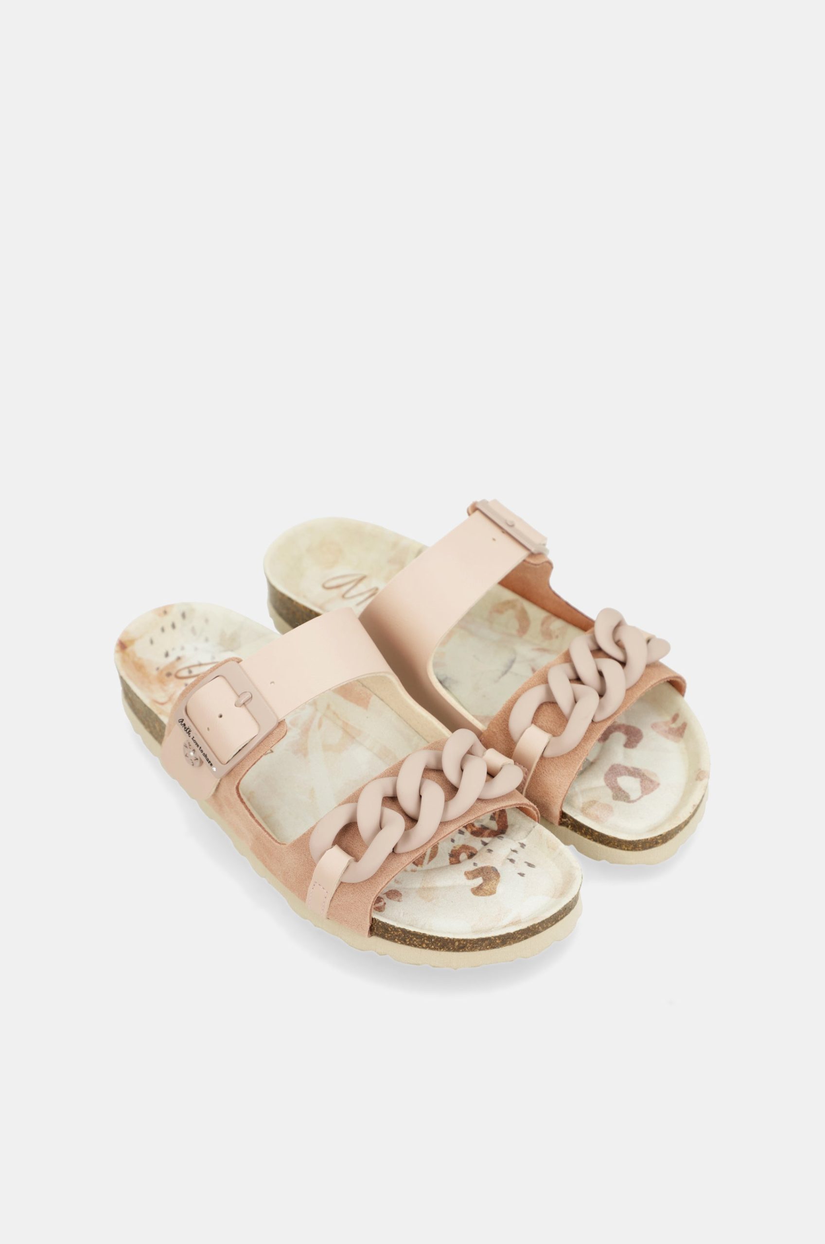 They feature a natural cork base combined with pink-toned material, along with an original printed sole. The customized buckle adjusts easily to different sizes.