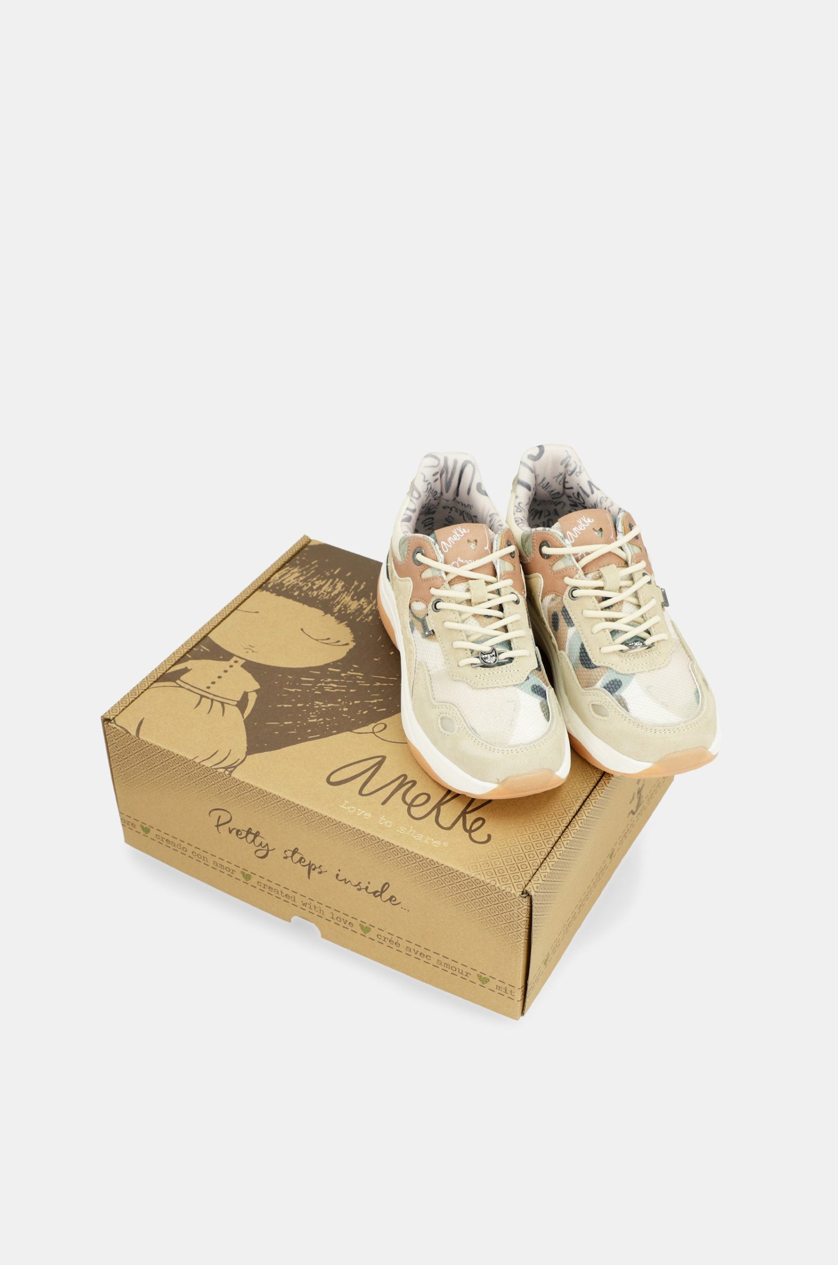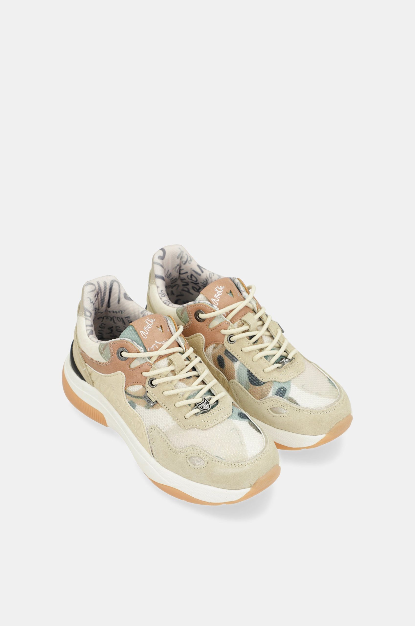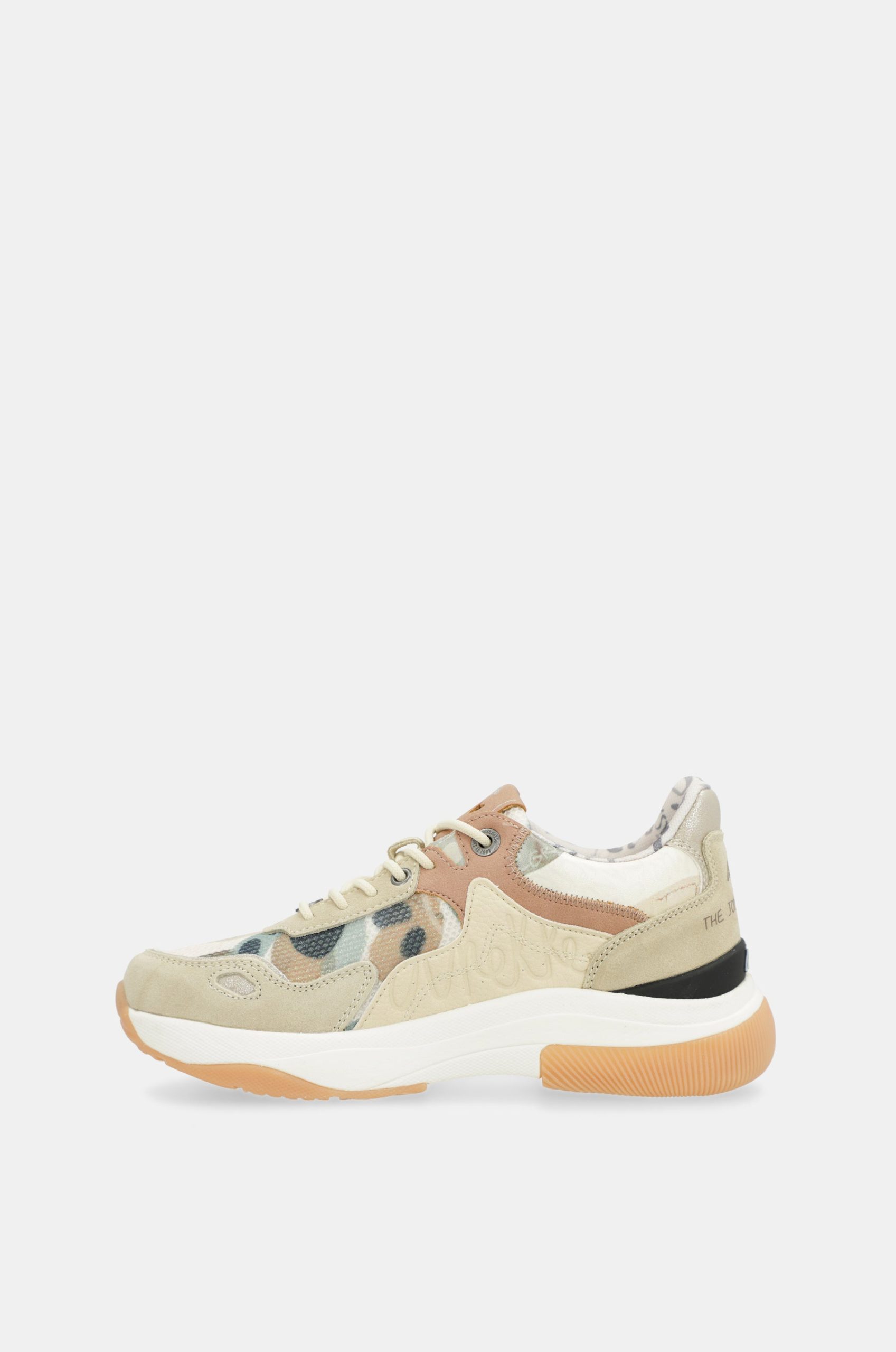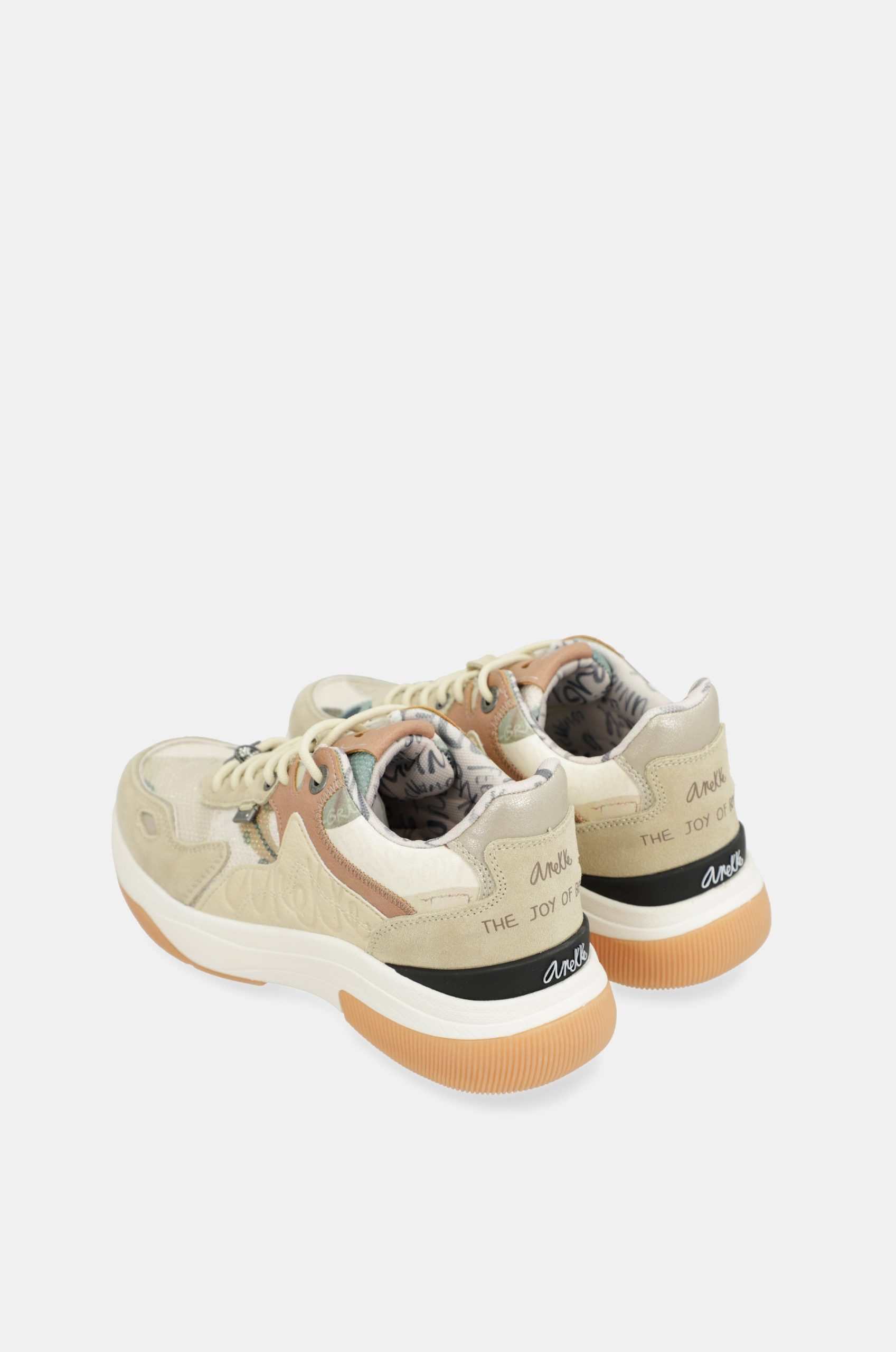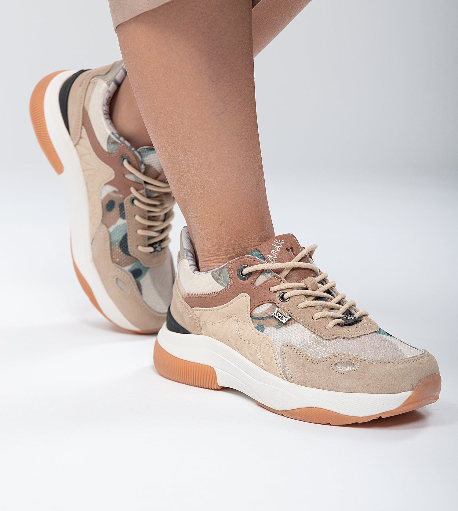 Its base combines parts in shades of pink with beige, toasted, printed, and black. The bicolor sole features an ergonomic shape that will ensure the comfort of each of your steps. It closes with laces and has a comfortable removable insole that cushions your stride.