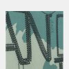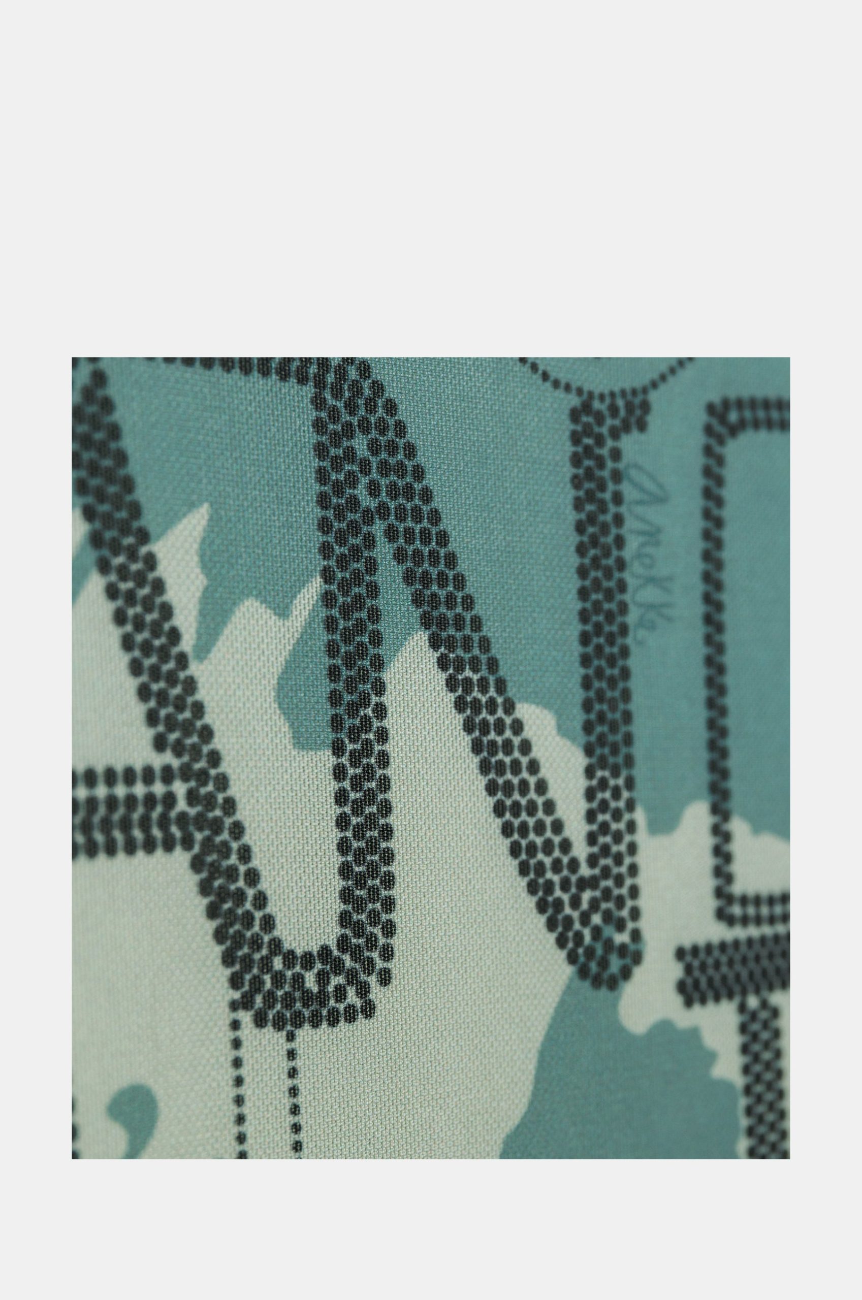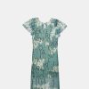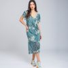 This green dress features a contrasting blue logomania print, and it has a midi cut with flowing sleeves. The neckline is a V-cut and it has a button on the back for a better fit.