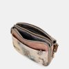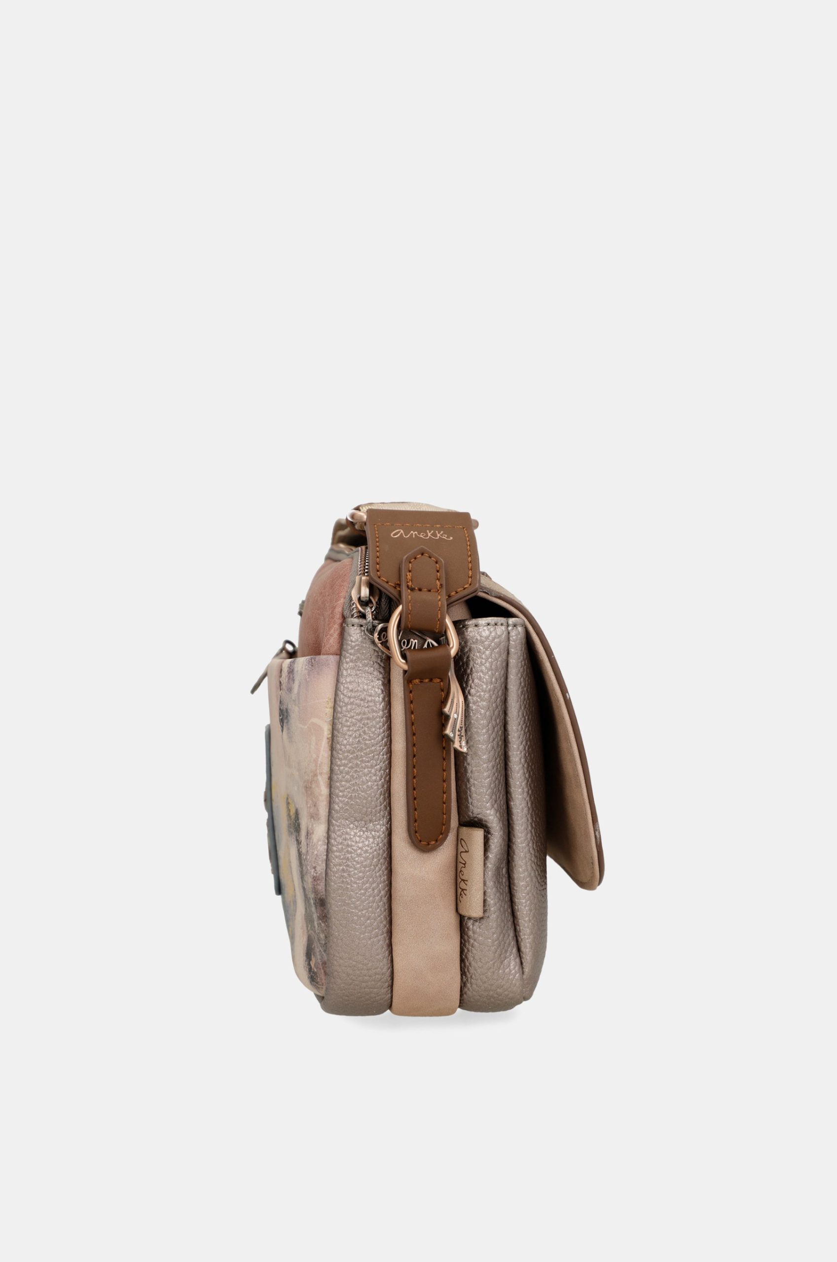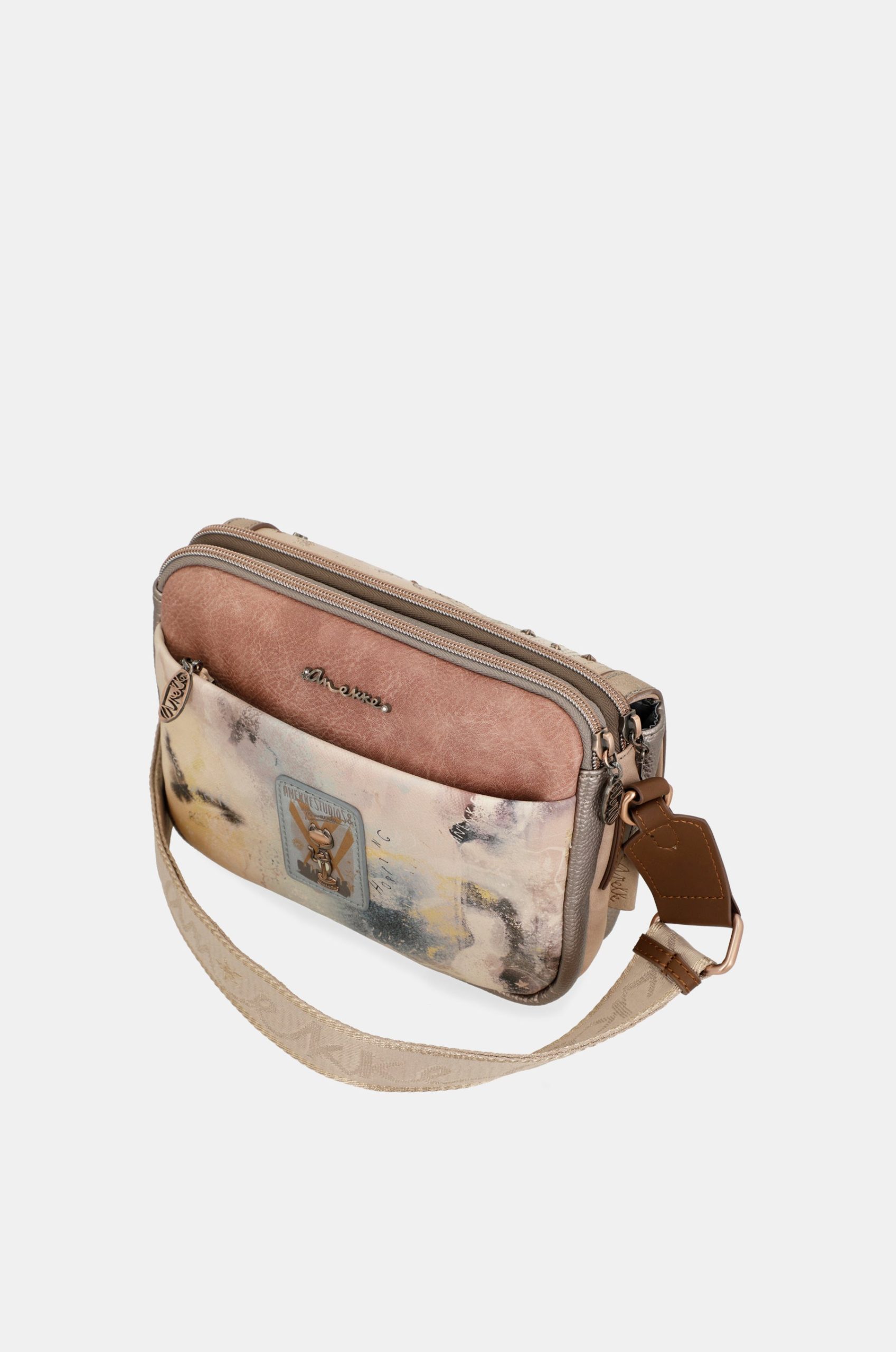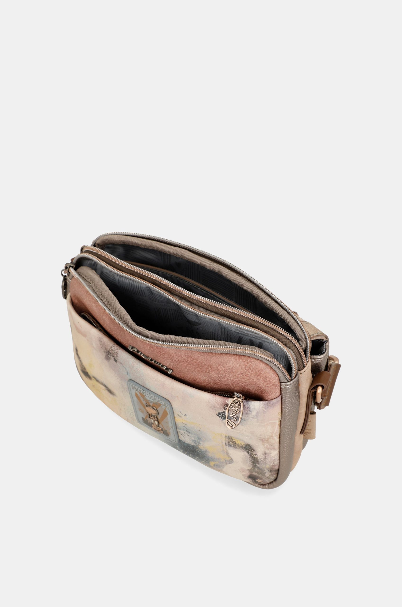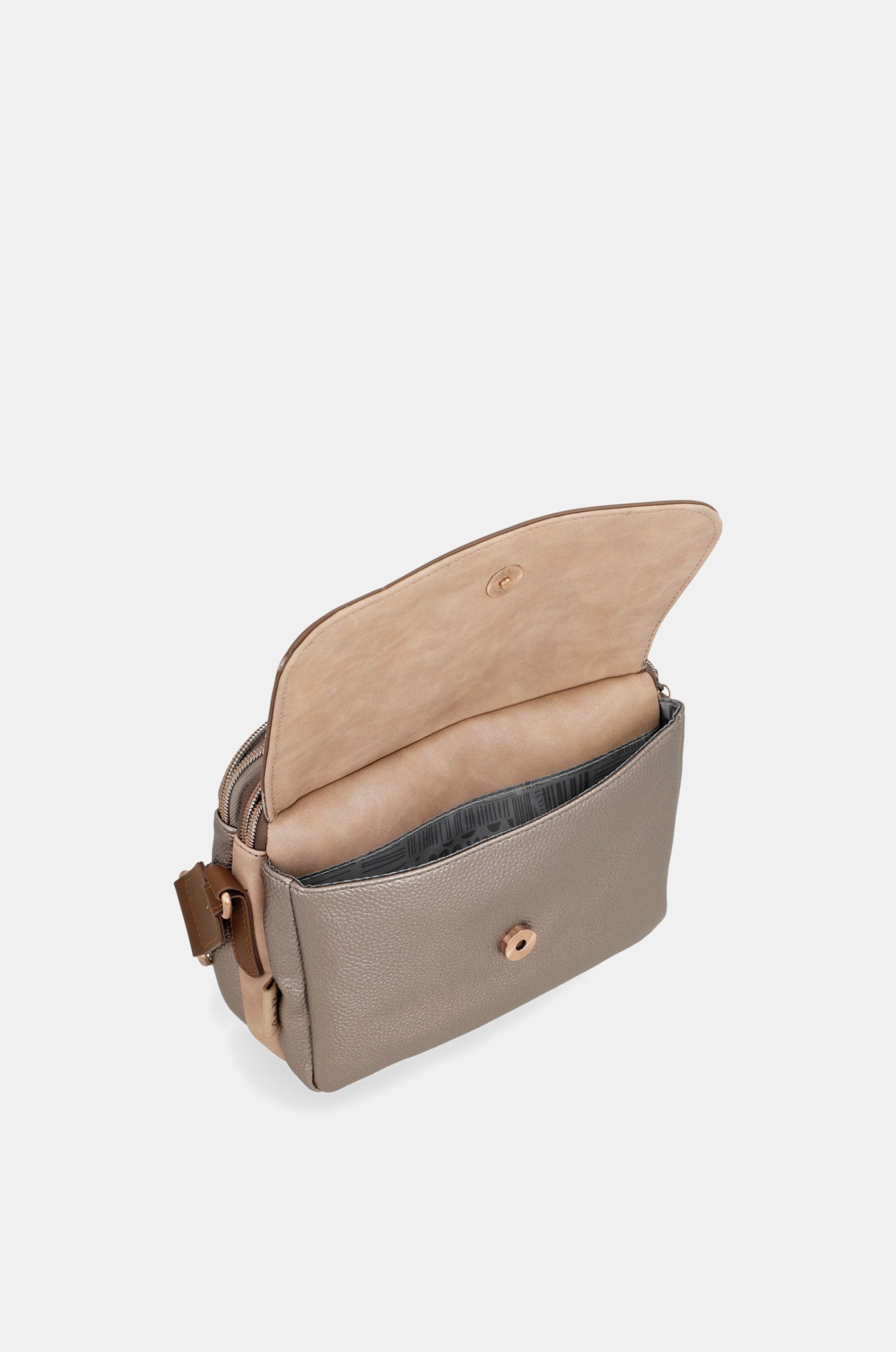 This flap crossbody bag has 3 separate compartments, is medium-large in size and has a back pocket. The handle is a shoulder strap adjustable to different lengths, perfect for adapting it to your preferred height. The interior is lined and has pockets.