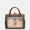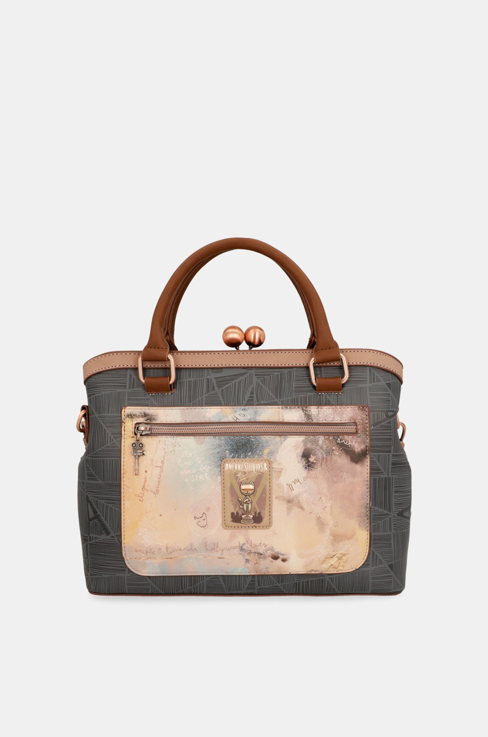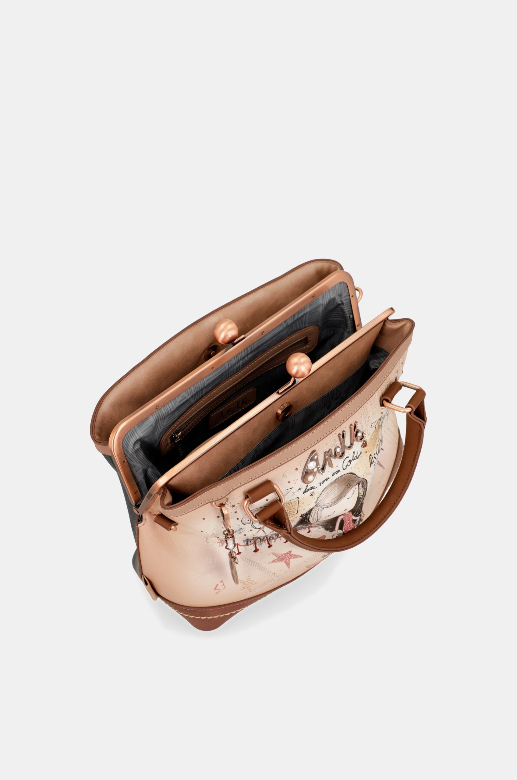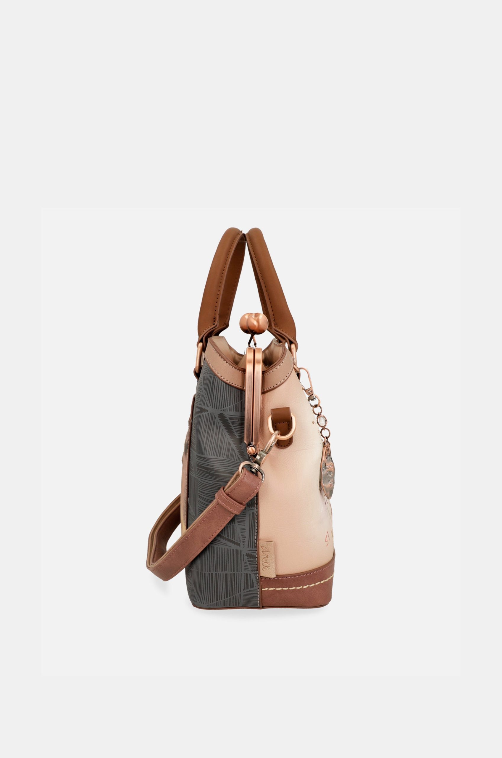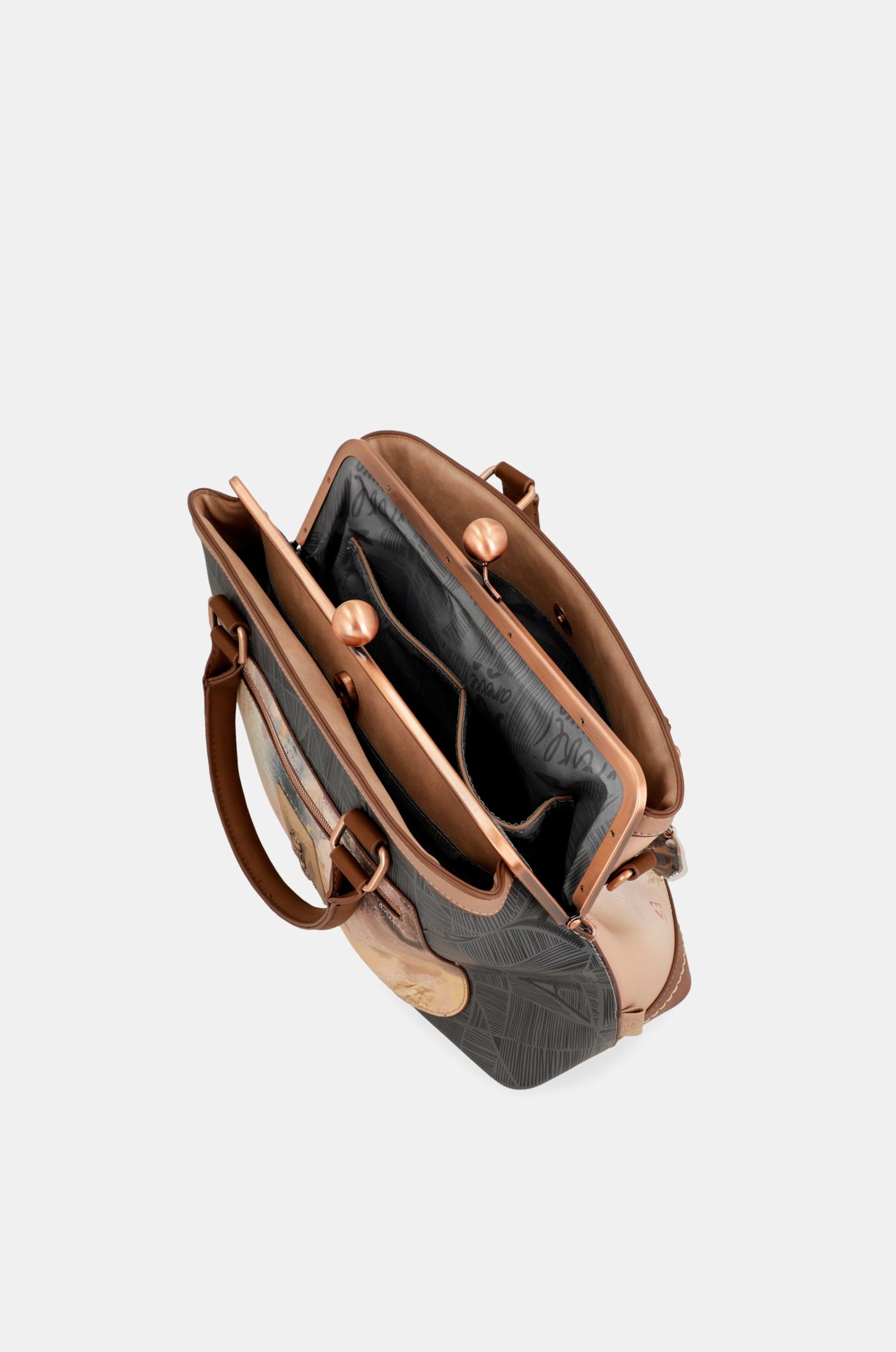 This handbag, also wearable over the shoulder with its shoulder strap, has 3 separate compartments, is medium-large in size and has a back pocket. It has an original kiss-clasp closure in the central compartment, adding a vintage touch that you will love. The compartments on both sides have magnetic button closure. It has two hand handles and a removable adjustable shoulder strap. The interior is lined and has pockets.