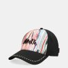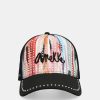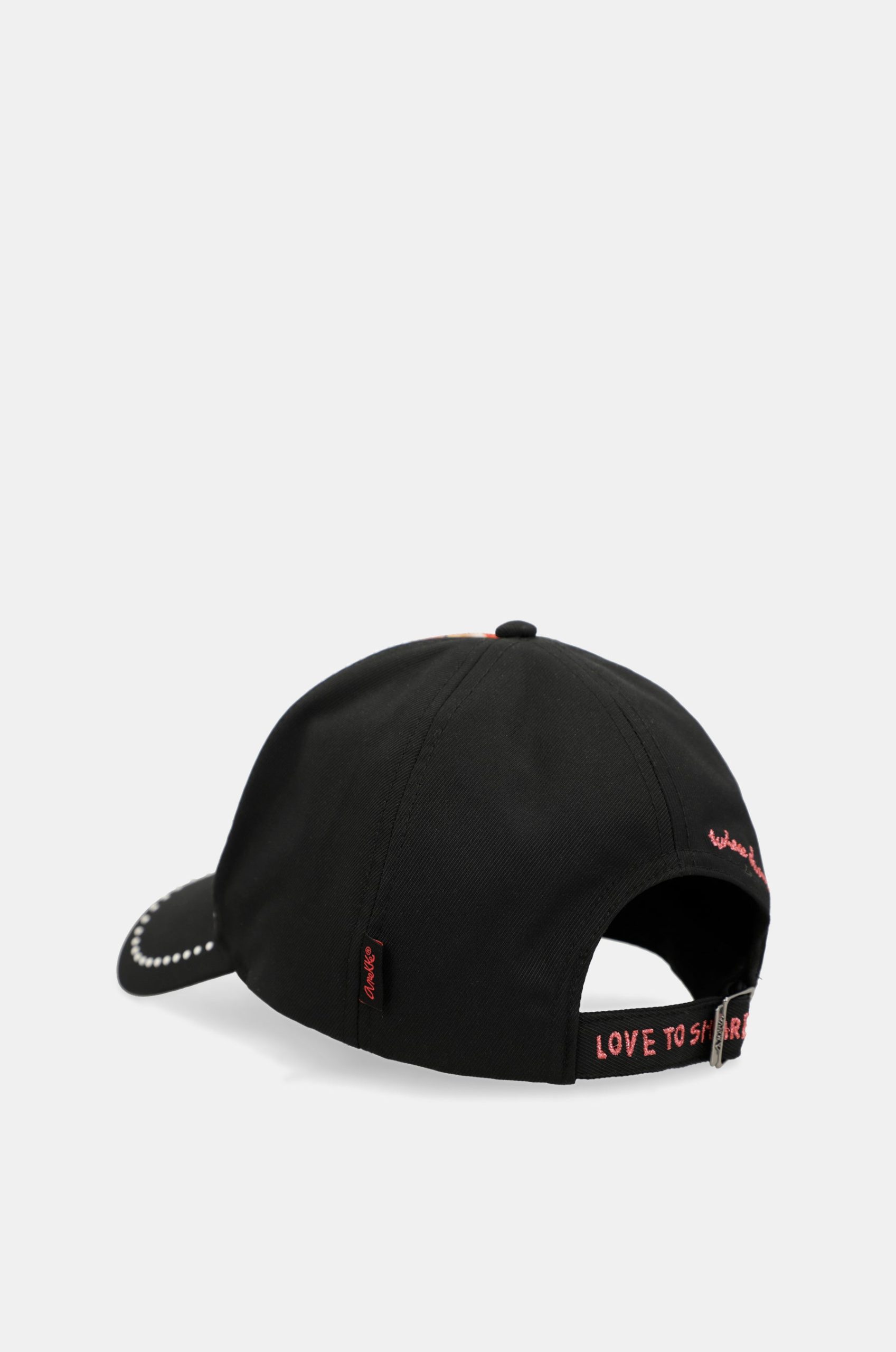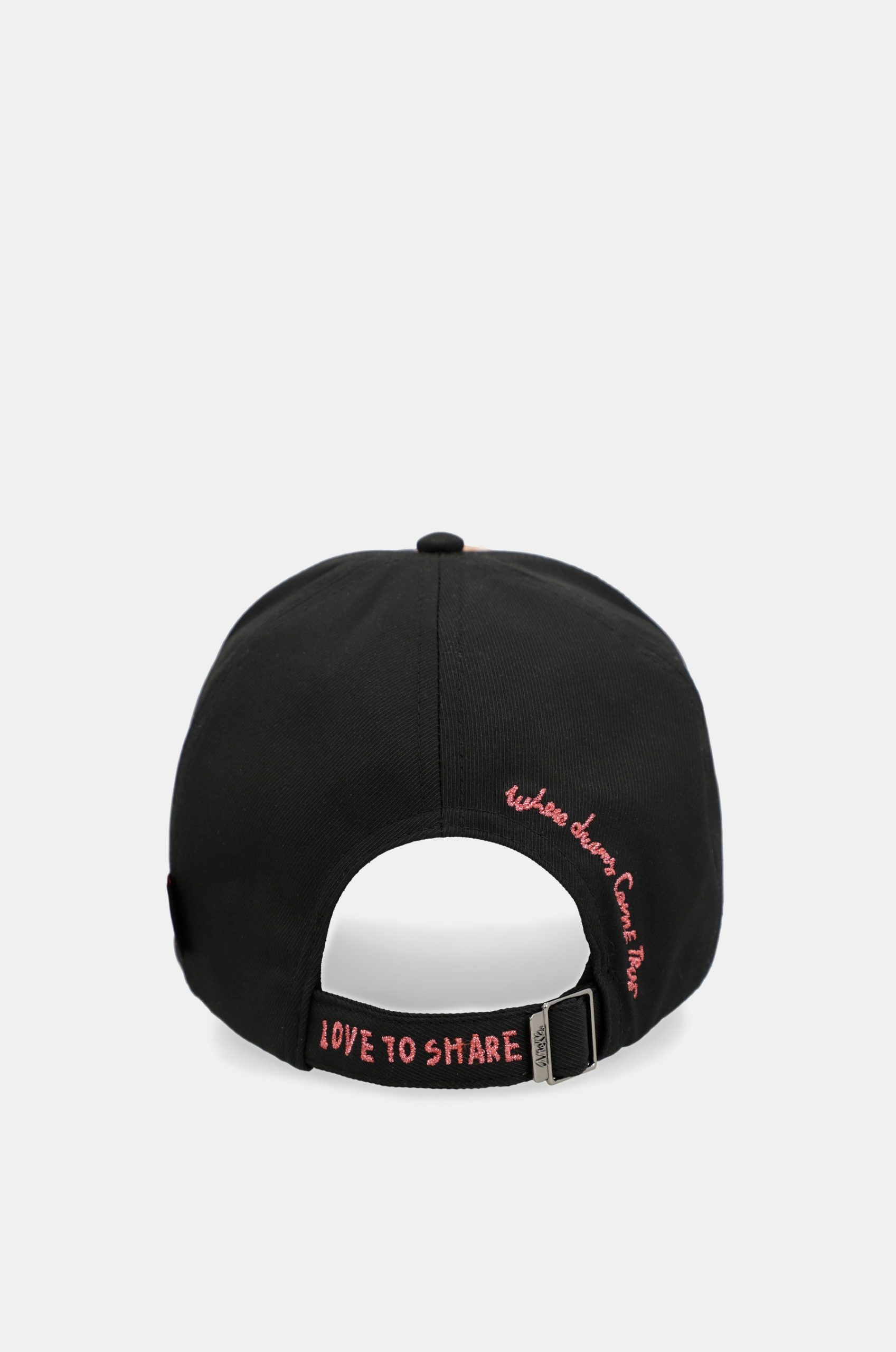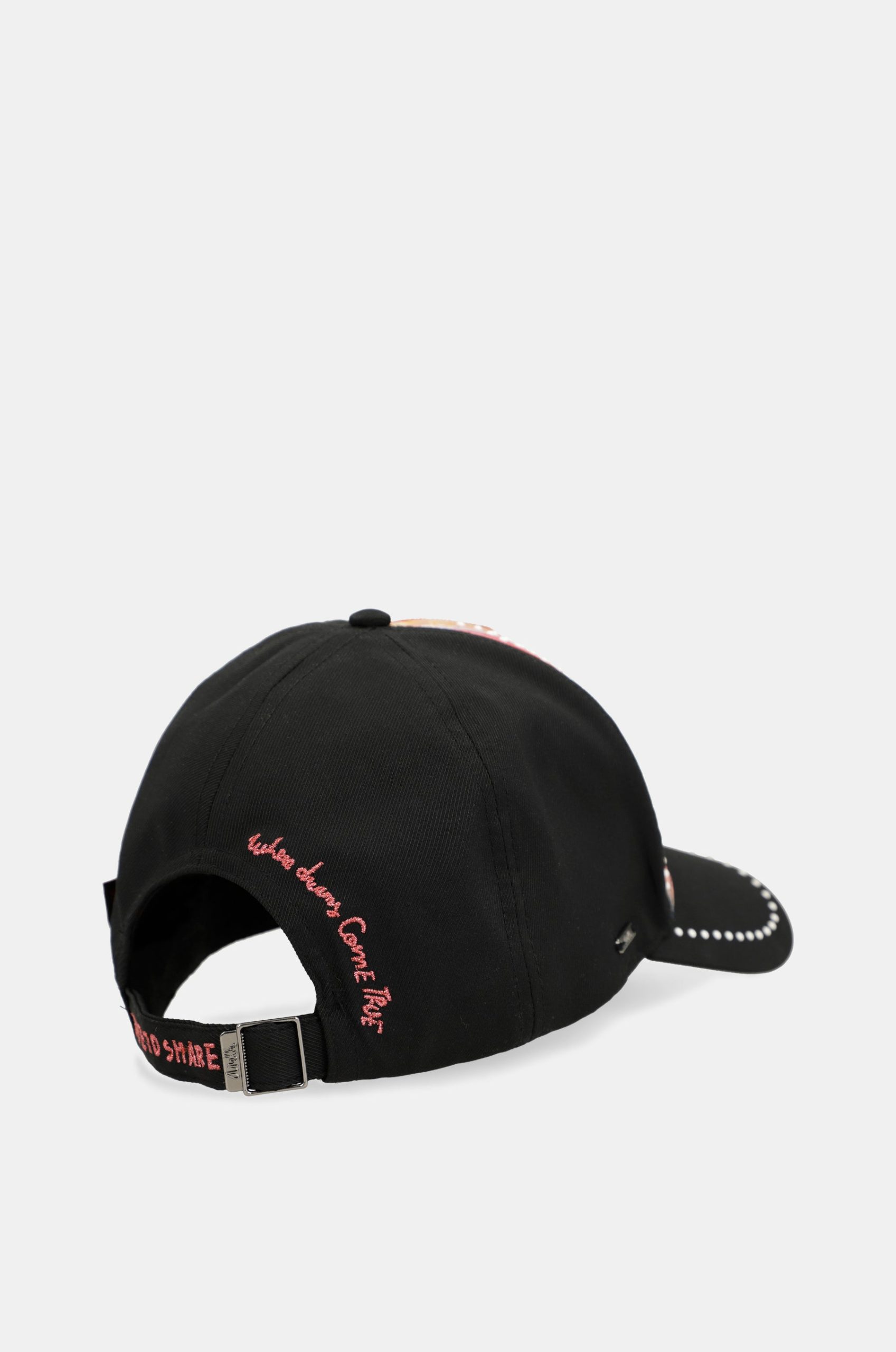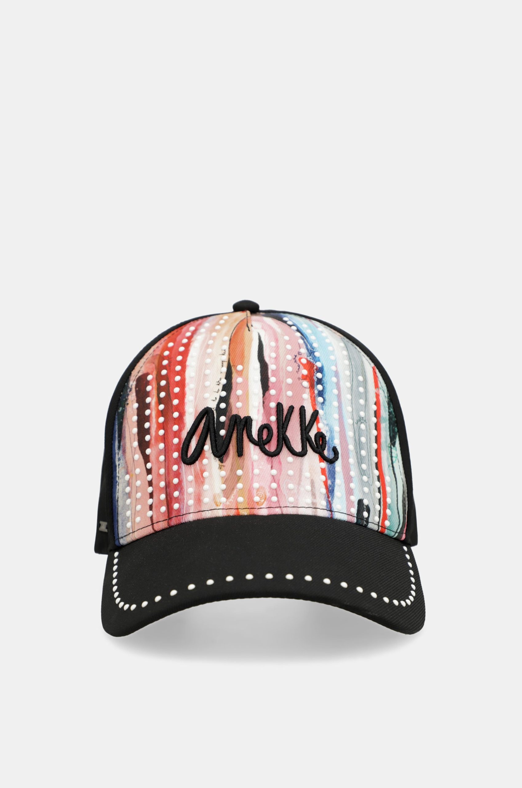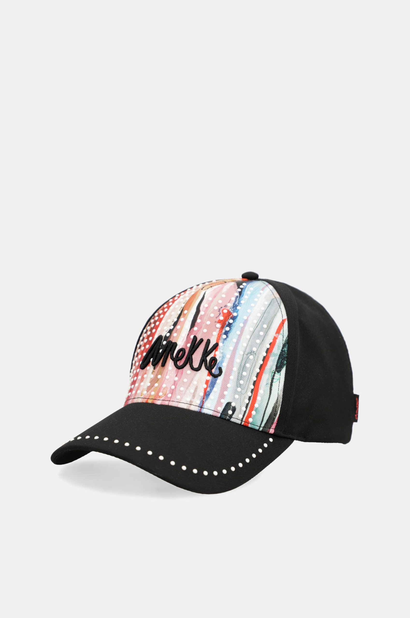 It’s the perfect accessory for days under the sun, or for those times you want to add a care-free touch to your look. Its unique design combines a dark background with an original multicoloured print and decorative pearls.