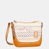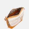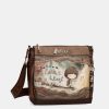 This shoulder bag is large in size and has a back pocket. This bag is characterized because it combines a base in off-white tone, which recreates the shape of a net in different colors. This contrasts with parts in brown and lots of details. The back side has a colorful brushstroke print, in which some words can be read.
