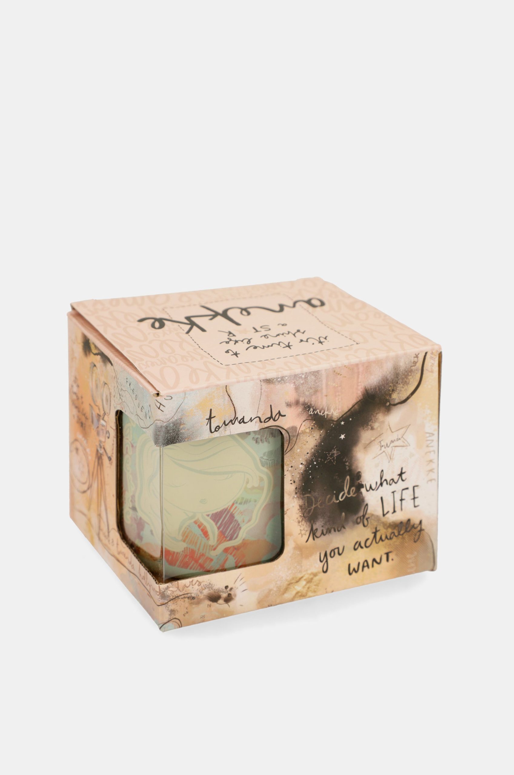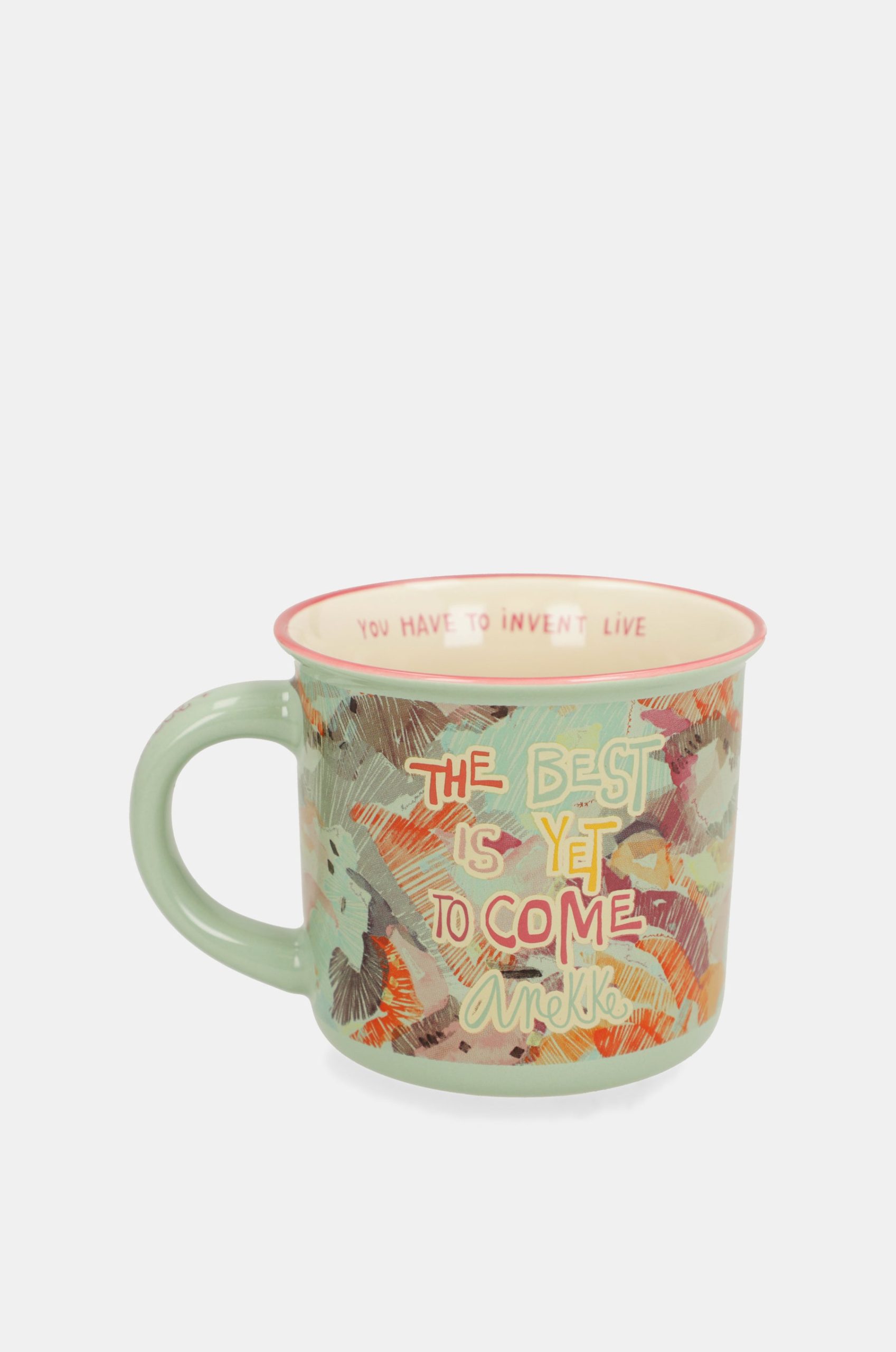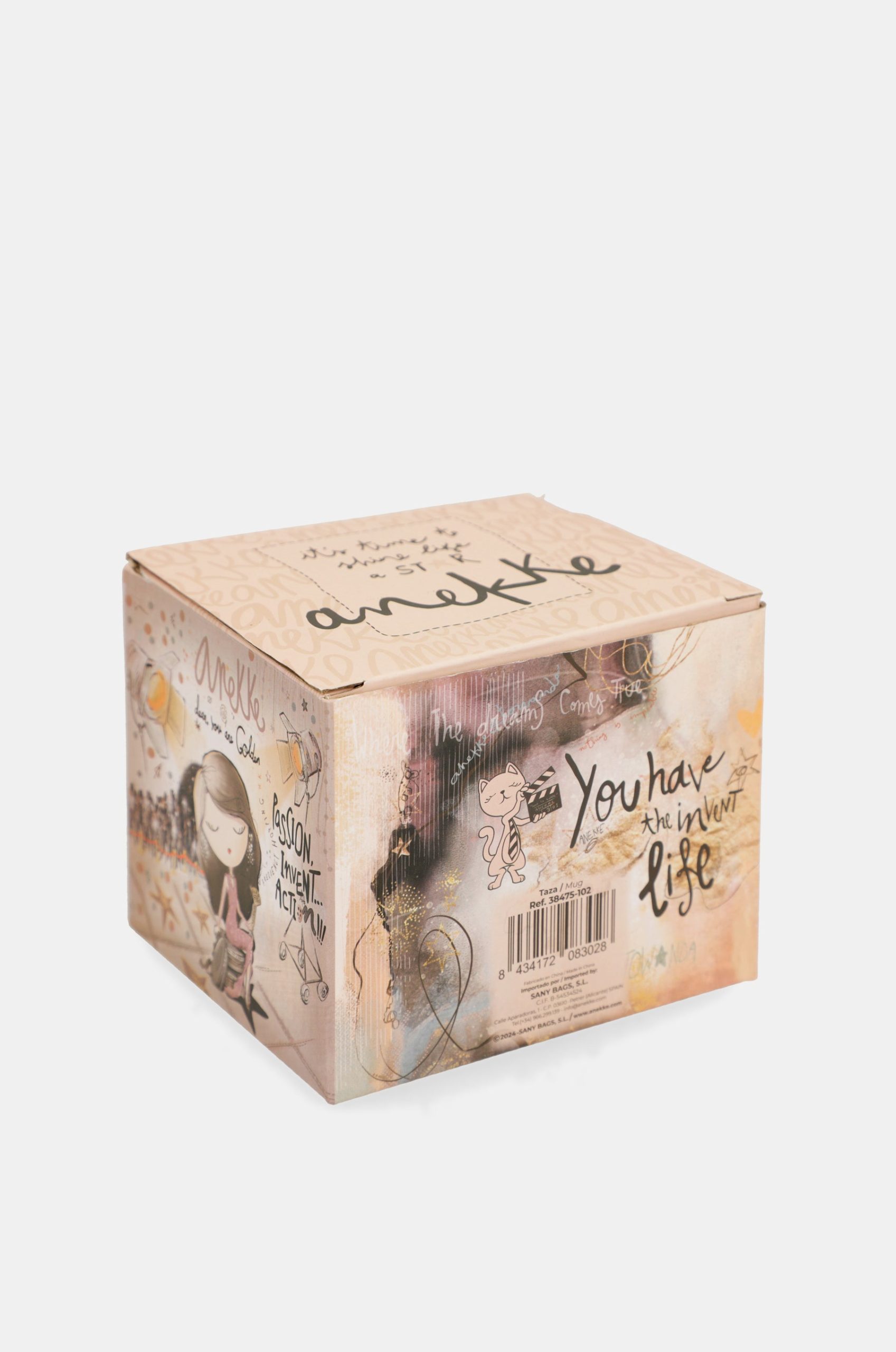This original porcelain mug has a carefully crafted design, full of details. Its unique all-over print features inspirational phrases and motifs on every inch, as well as a removable decorative bow.