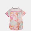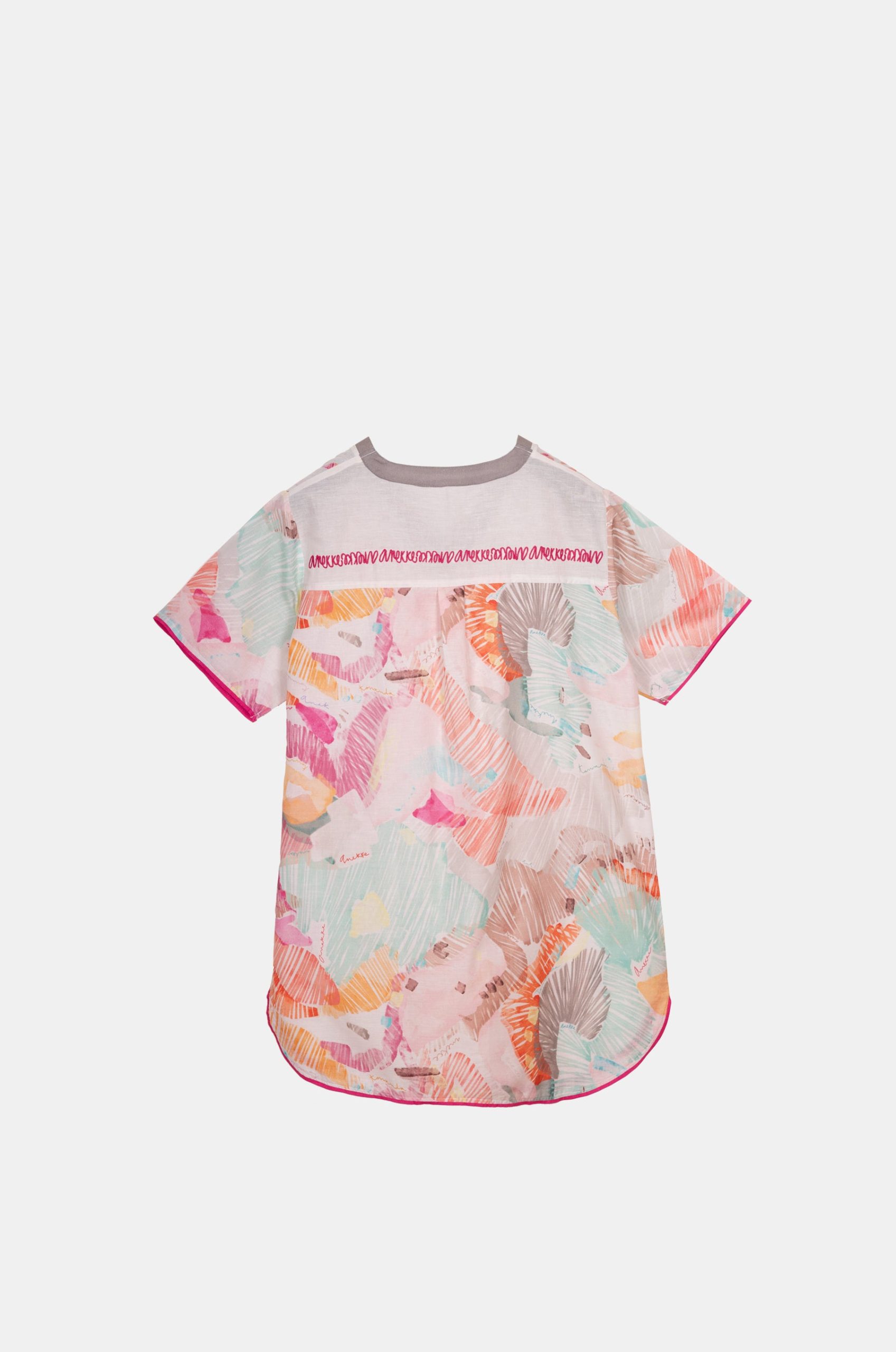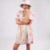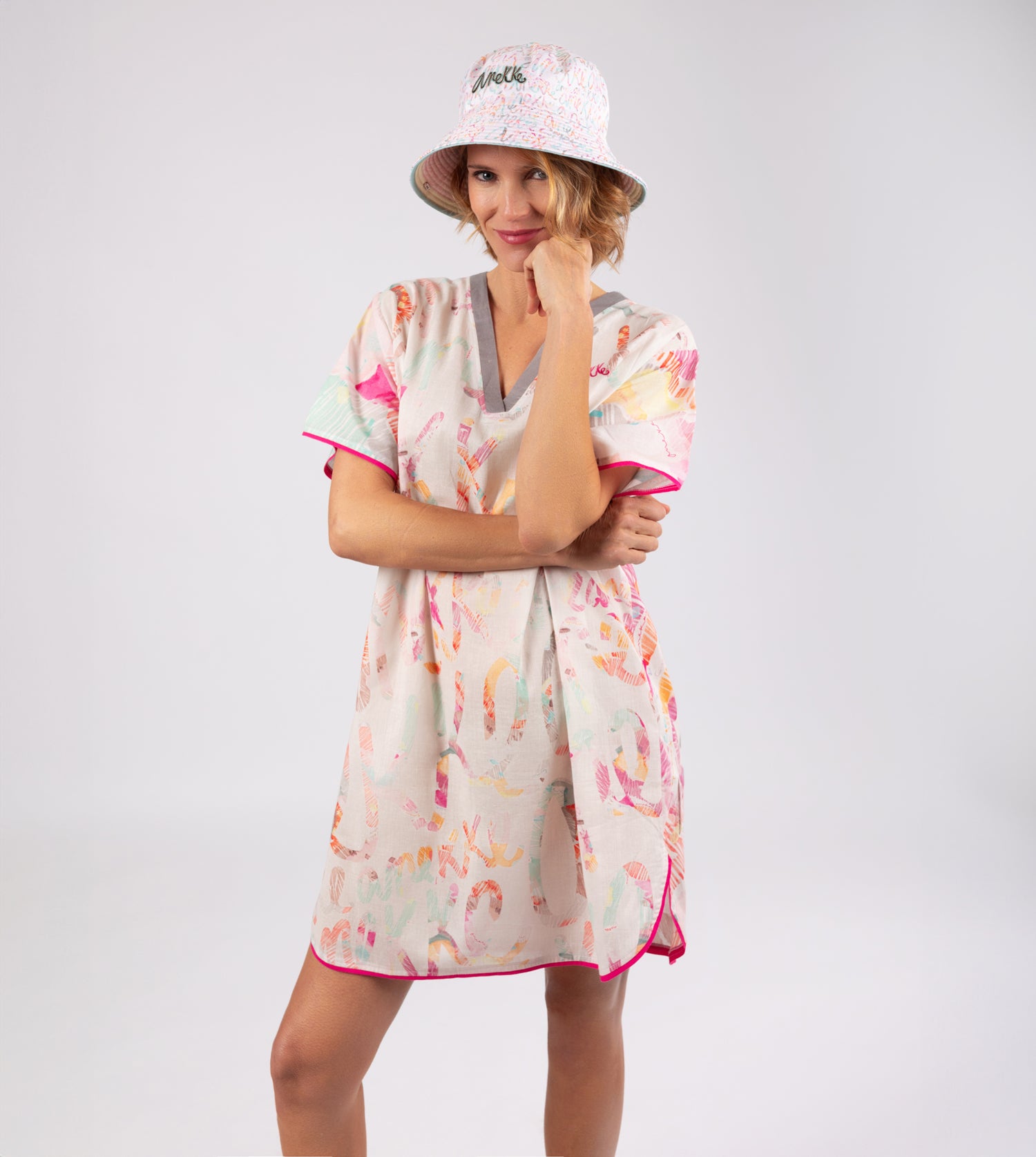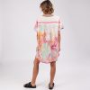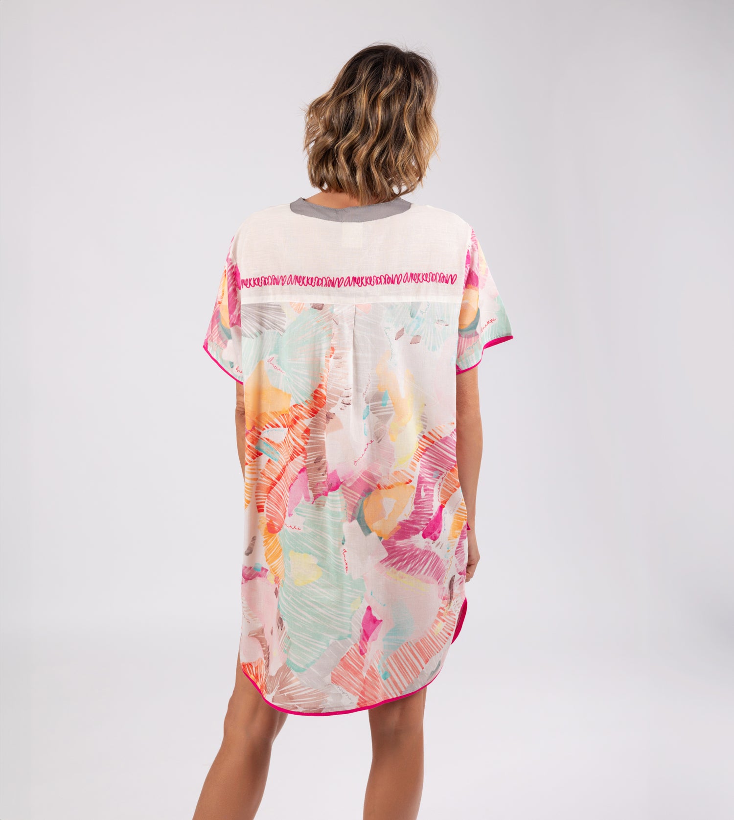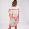 It is a one-size dress with a V-neck and short sleeves. Its original multicolour print makes it a super easy-to-combine garment, perfect for both beachwear and for a casual outfit on warm days.