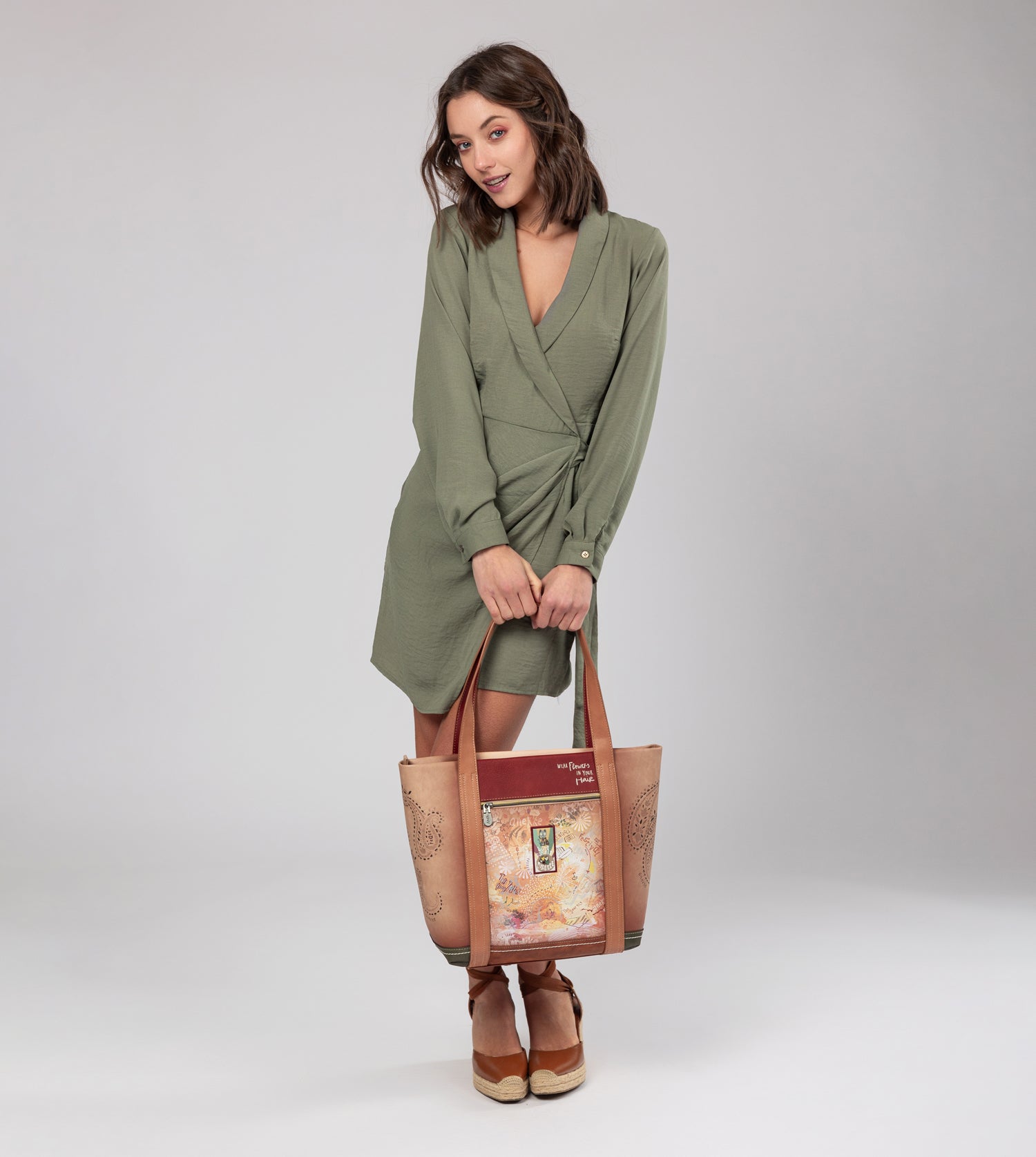 Ready to travel to the summer of love with Anekke Peace & Love? We are starting a unique journey in which you will only need two things: imagination and some flowers in your hair. Anekke’s van takes off so we start touring the West Coast of the USA during a unique era: the 60s. Under a warm sun and with music, freedom and dreams vibrating high, we will stop in Los Angeles, San Francisco and San Diego, to experience the hippie movement from within. Get ready to immerse yourself in a unique story through every detail of the collection: pins, embroidery, die-cut shapes and prints that will take us back to this cultural movement. You will also find 100% personalised patches and empowering messages that will make you flow. This piece is part of the camel colour line, which combines green, nude and reddish touches.