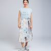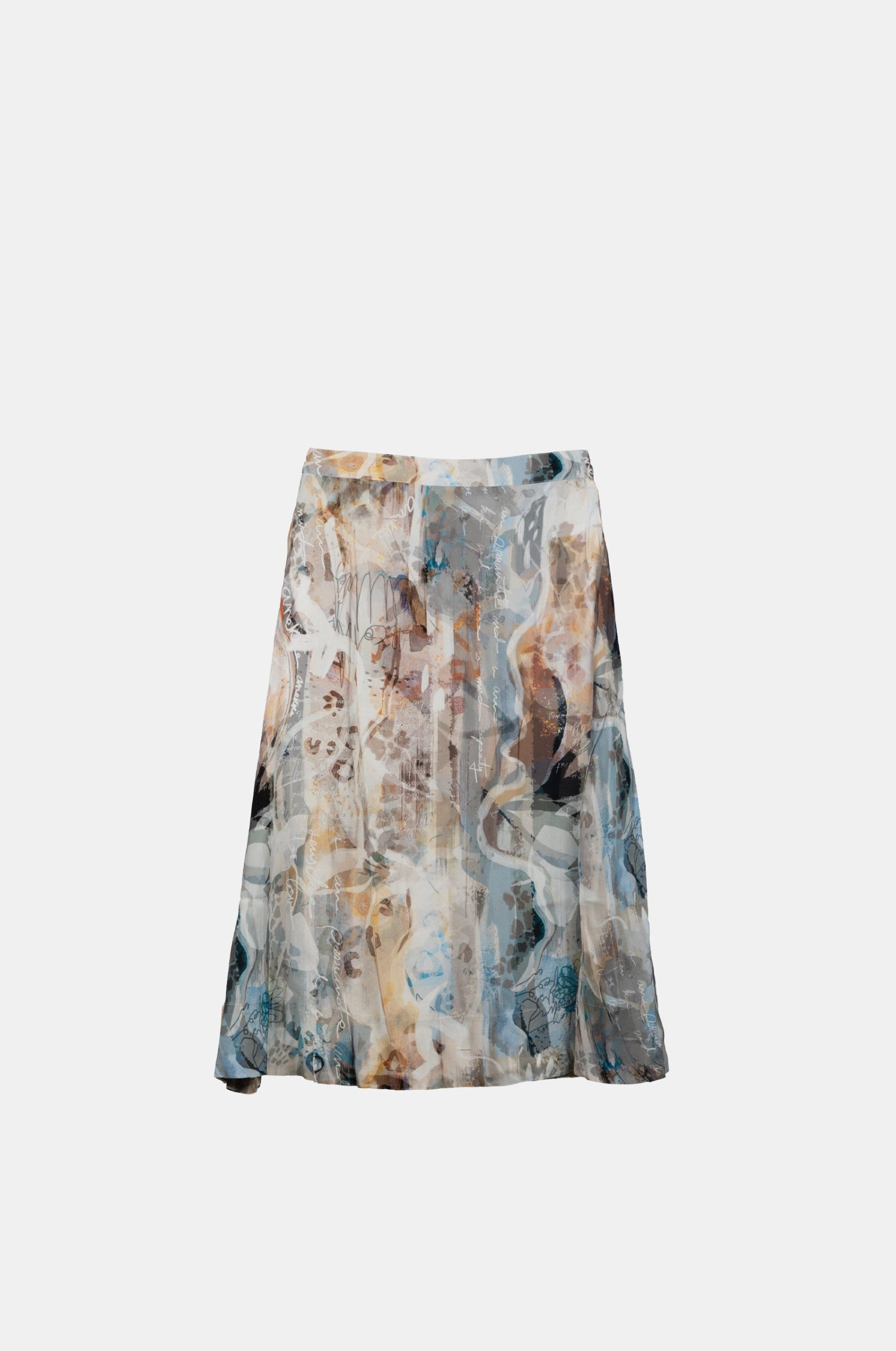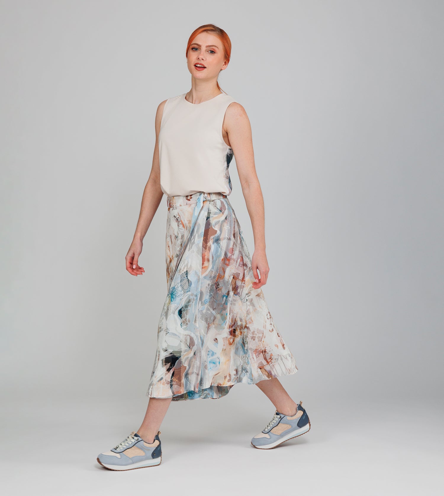 This midi wrap skirt is from the Memories collection and features a colorful print from the same collection.