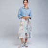 This midi wrap skirt is from the Memories collection and features a colorful print from the same collection.