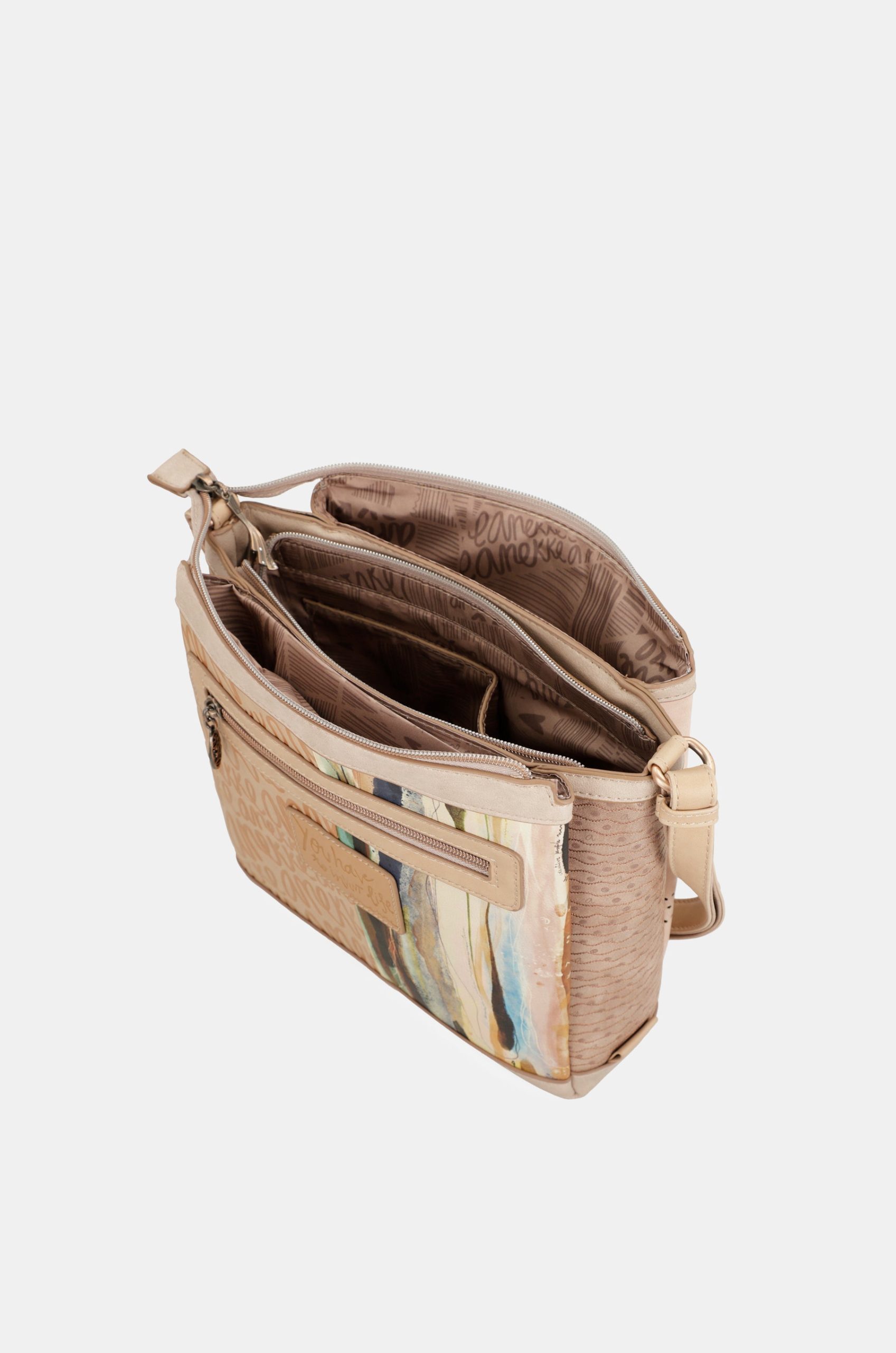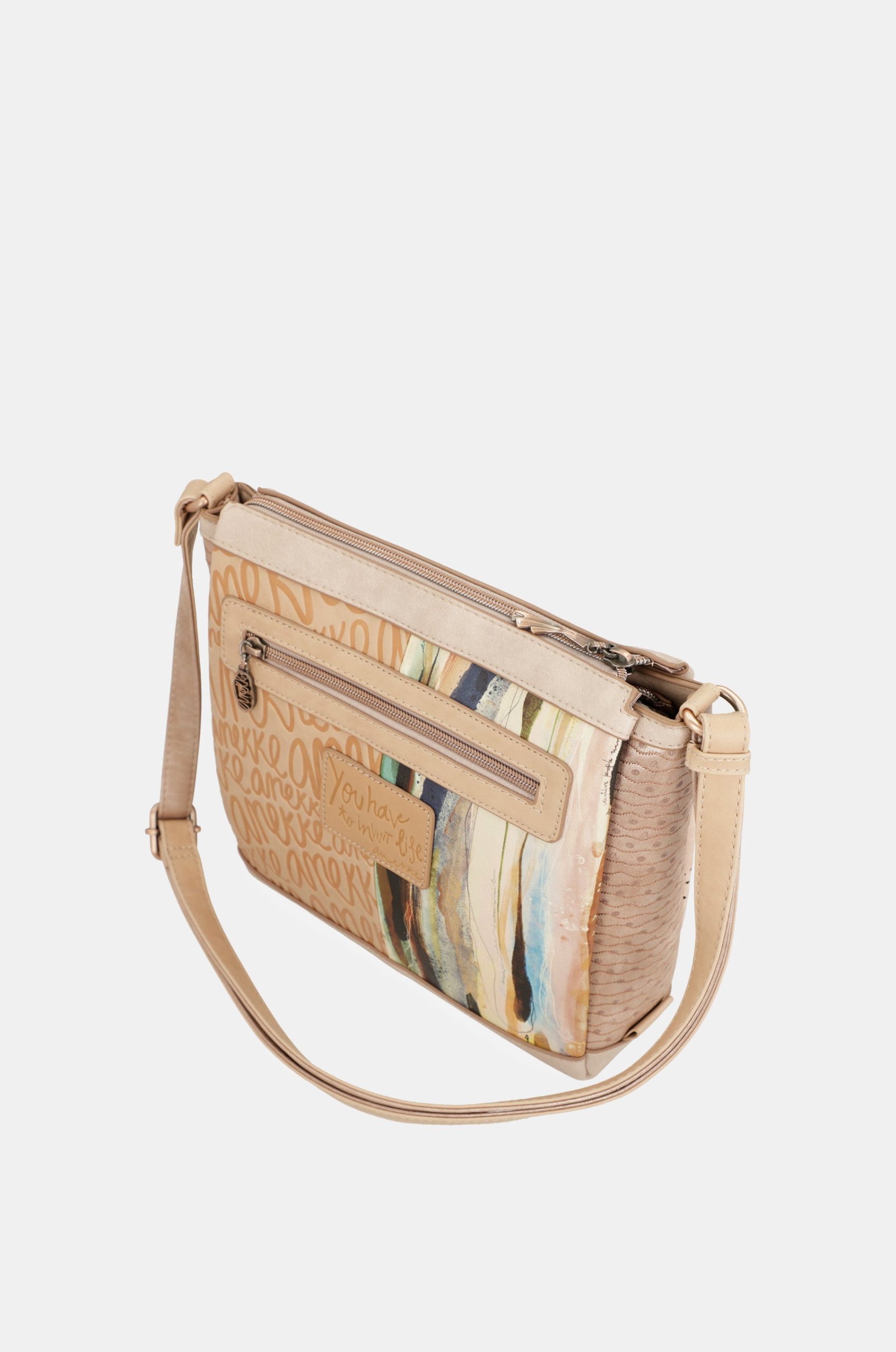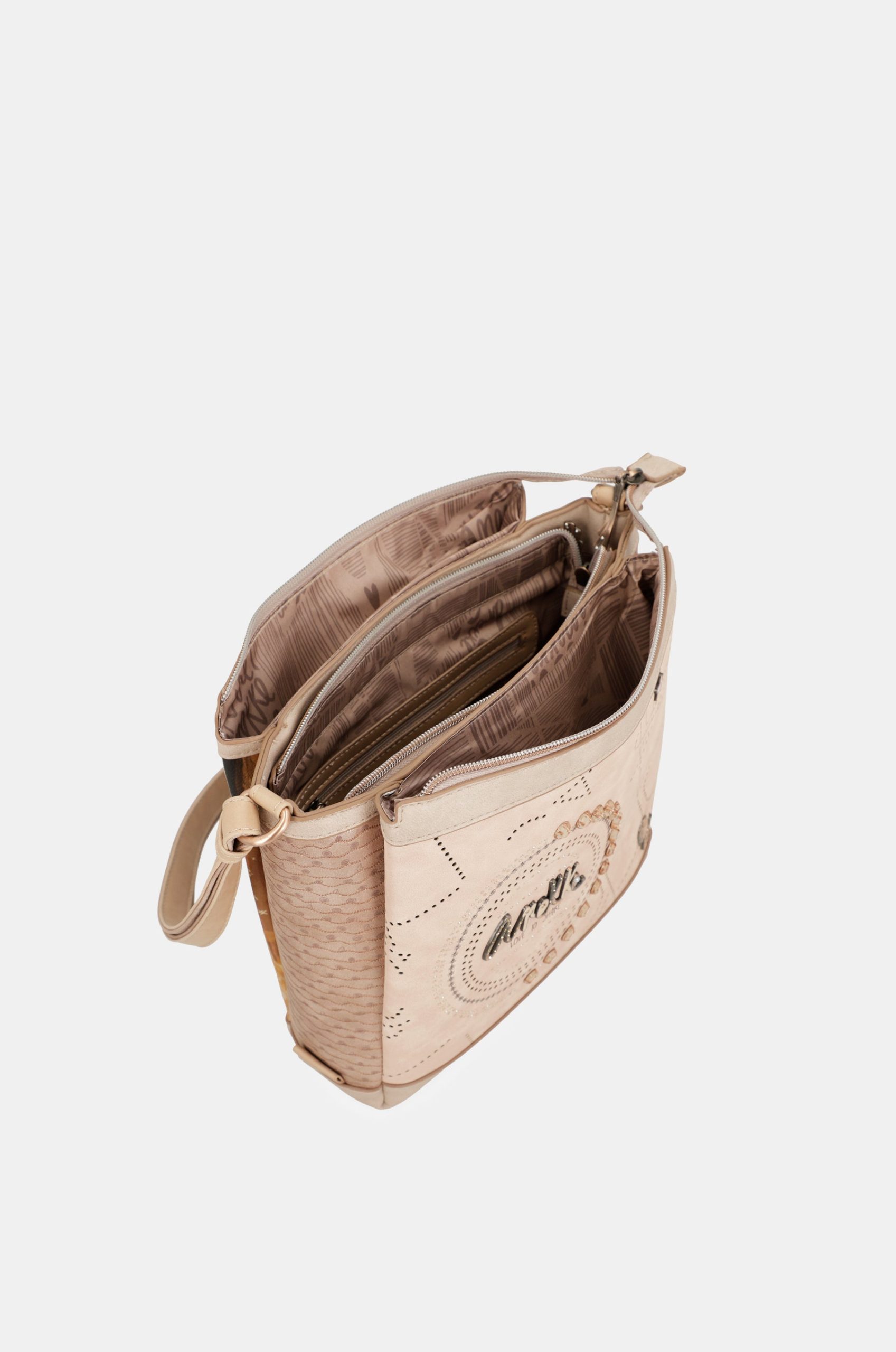 This crossbody bag with zip closure has 3 separate compartments inside, is medium-large in size and has a back pocket. The handle is a shoulder strap adjustable to different lengths, perfect for adapting it to your preferred height. The interior is lined and has pockets.