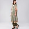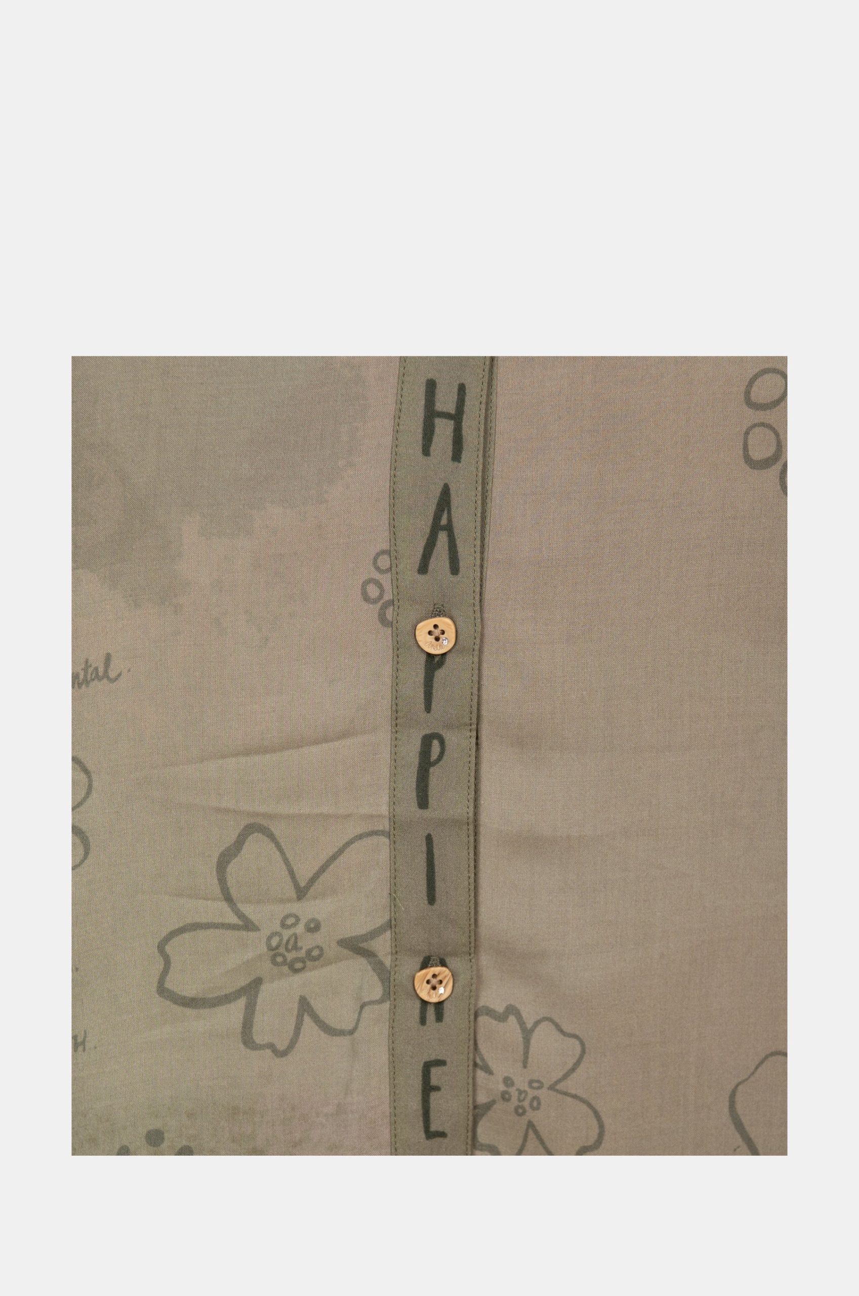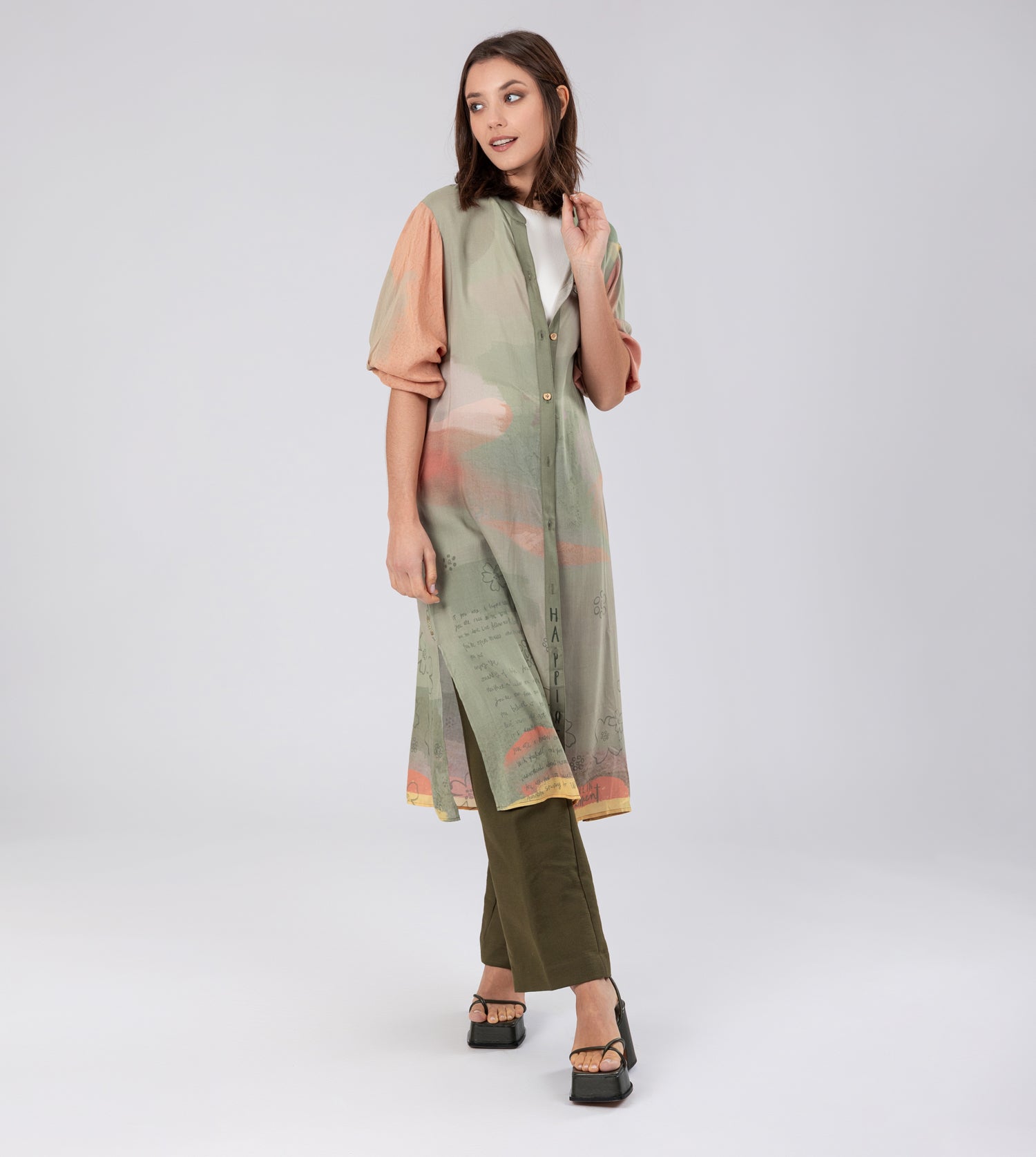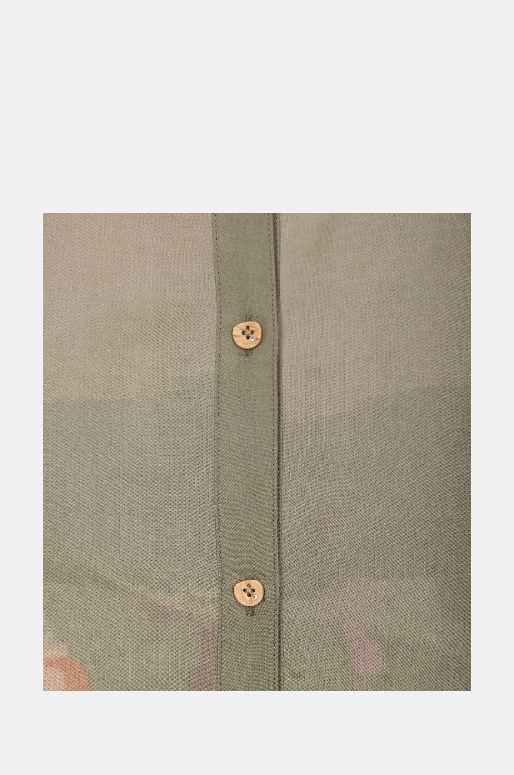 Its print is in green, orange and yellow colours. It has long sleeves and a button fastening. It also has a flowing feel and is a one-size-fits-all V-neckline, with an original wide fit.