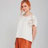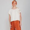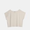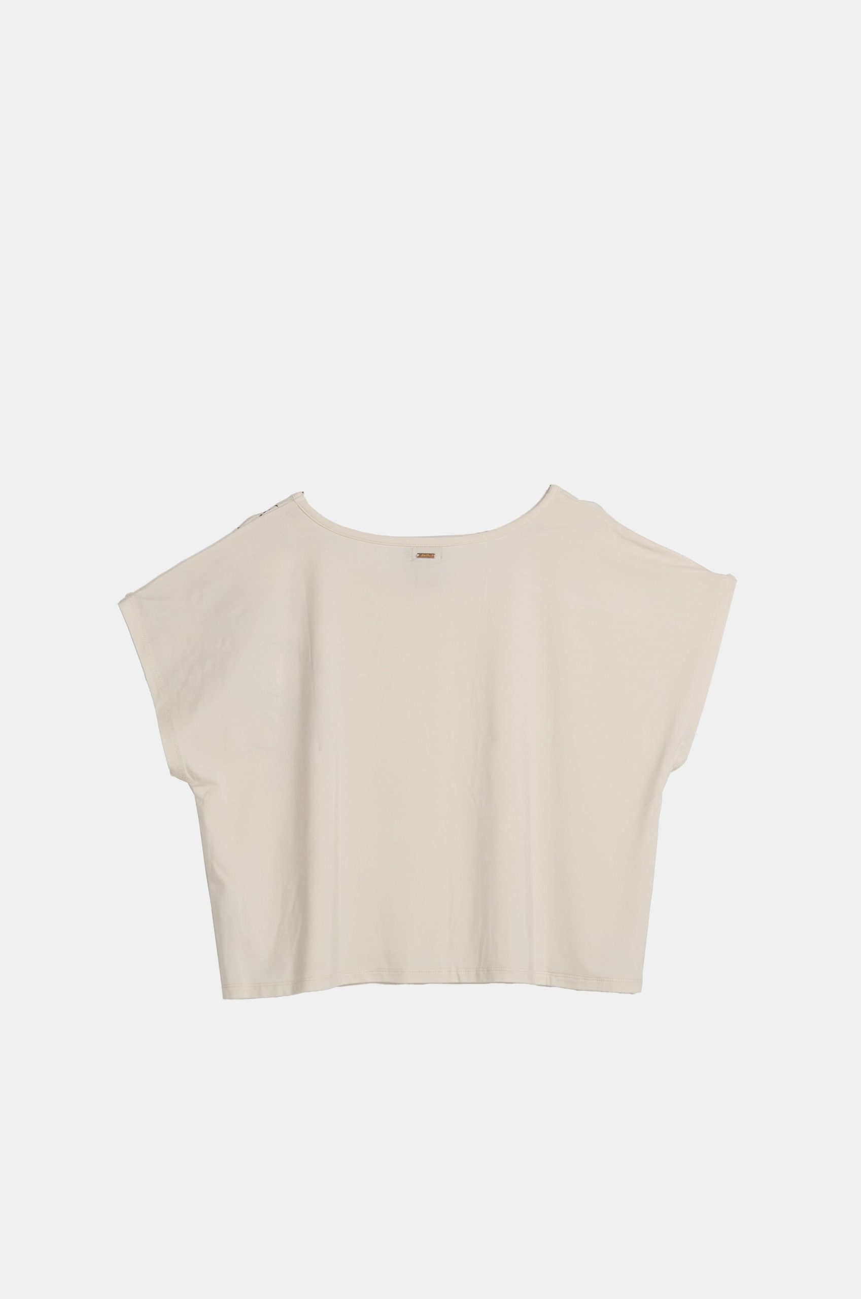 This beige t-shirt has short sleeves, a round neck, and a cropped fit. Additionally, it features an embroidered detail on one side with small bronze-tone gems, giving it a very special touch.
